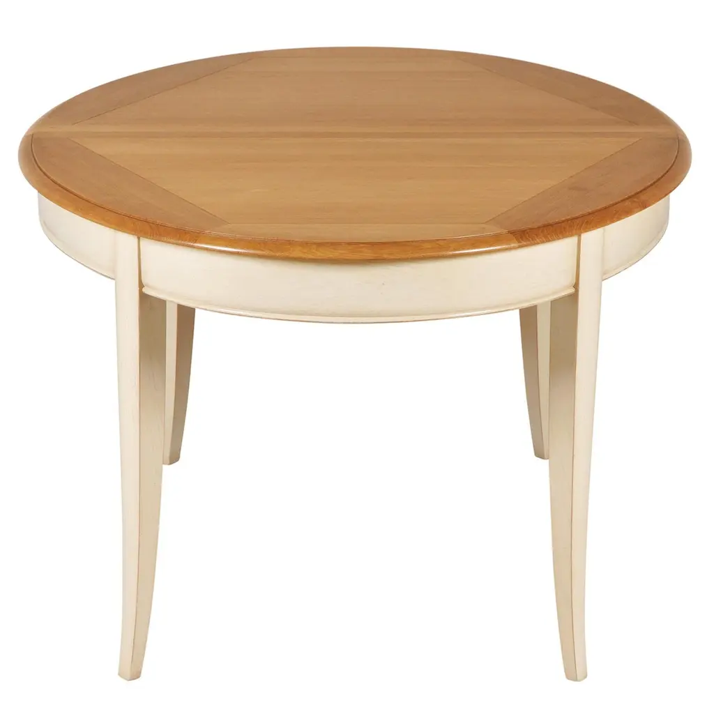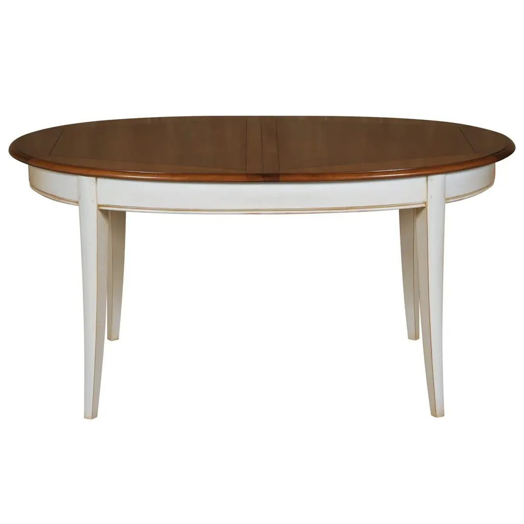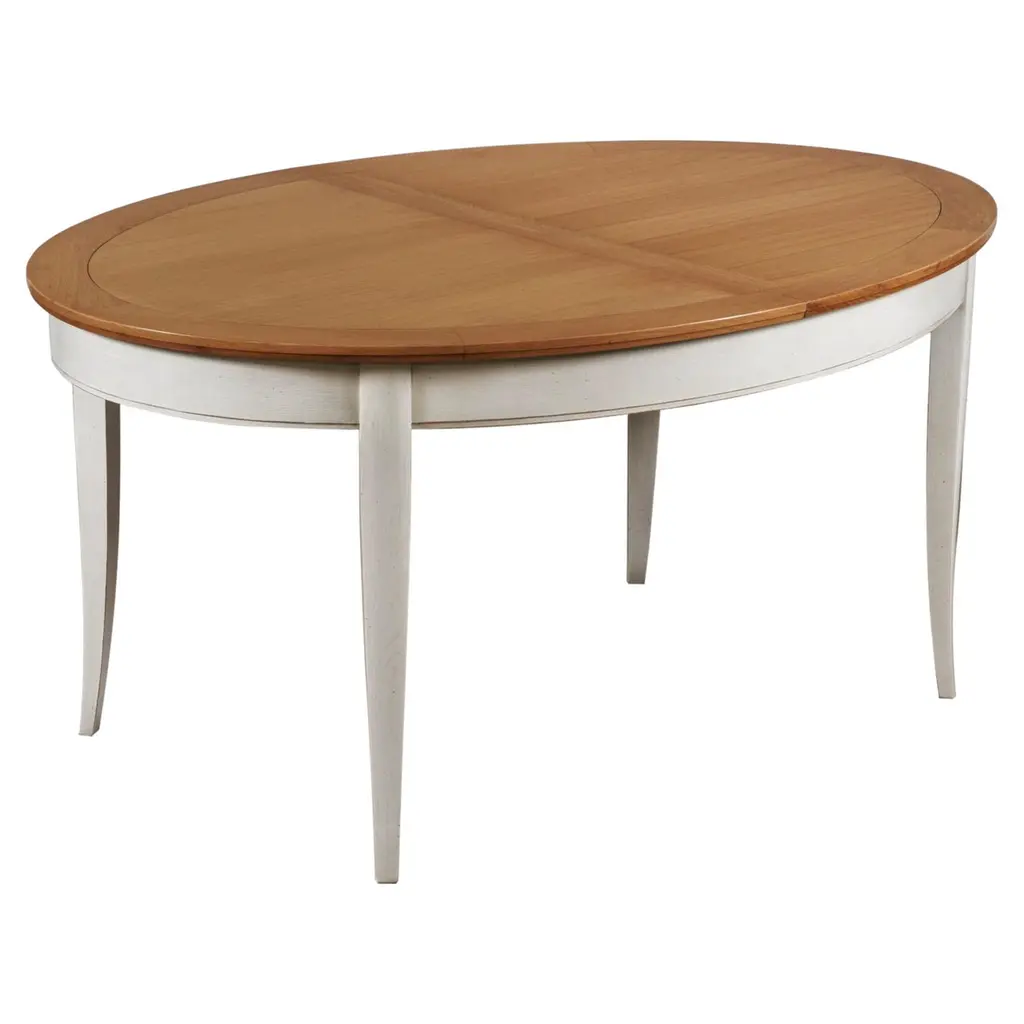 This oval dining table is in a French Countryside style also called "Campagne chic" in French. 2 integrated extensions of 40 cm / 15.7" each are folded under the trayThe table opens in the middle to release and unfold the leafs by pulling one side of the tray aside.The other side will open synchroneously without any effort. Accomodates 6 to 10-12 guestsThe height under the belt is 64 cm / 25.2" The finish is made of 3 layers including, a "canelle" oak stain for the top and a white cream lacquer for the feet and belt with a satin varnish.Solid wood comes from sustainably managed French forests.GONTIER, a brand of MON PETIT MEUBLE FRANCAIS group, provides you exclusively with 100% made in France classical and contemporary pieces of furniture.The manufacture of each furniture is made accordingly to traditional French techniques of woodworking by small Craft workshops in the western countryside of France (Loire Valley and Bretagne). We offer a 5 year warranty on each piece.