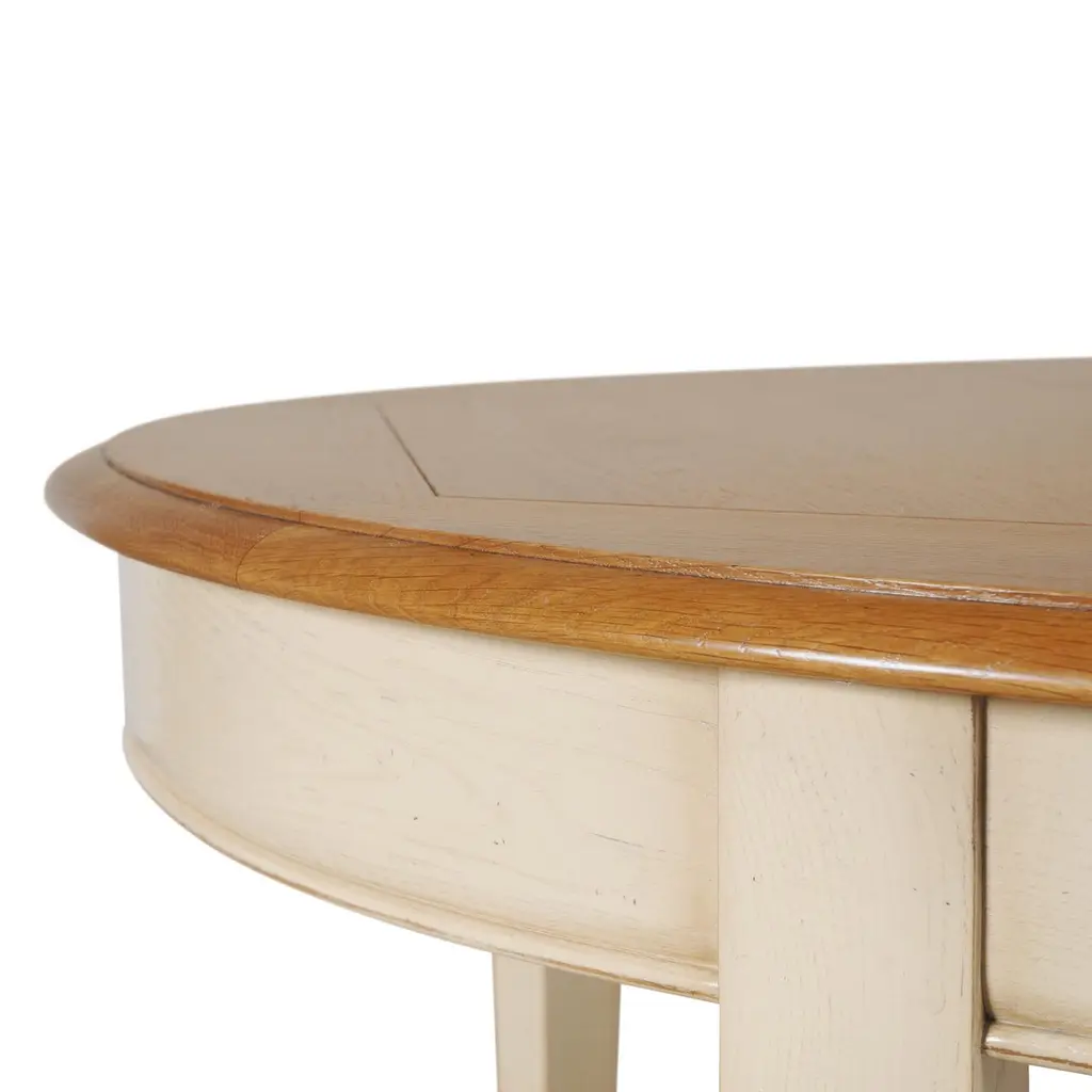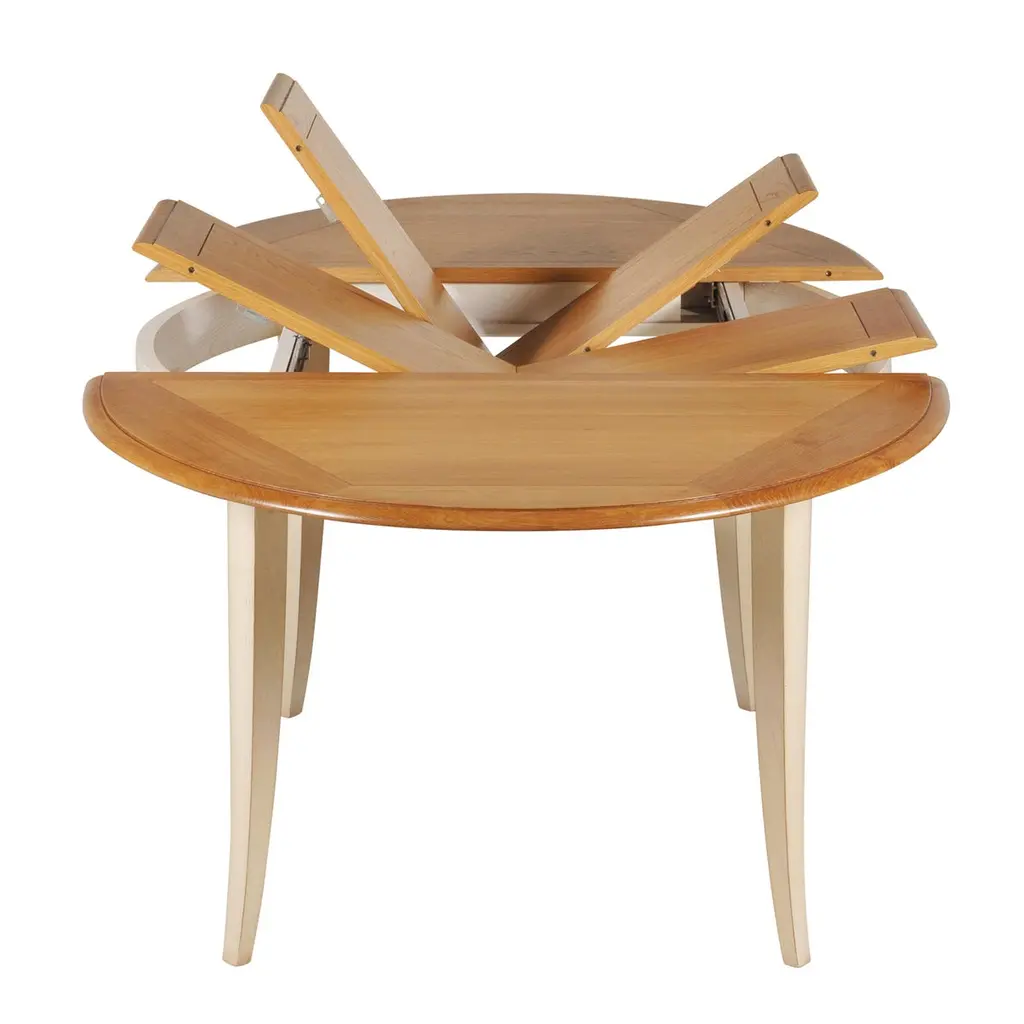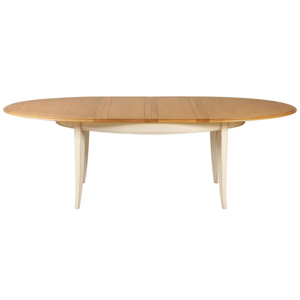 This oval dining table is in a French Countryside style also called "Campagne chic" in French. 2 integrated extensions of 40 cm / 15.7" each are folded under the trayThe table opens in the middle to release and unfold the leafs by pulling one side of the tray aside.The other side will open synchroneously without any effort. Accomodates 6 to 10-12 guestsThe height under the belt is 64 cm / 25.2" The finish is made of 3 layers including, a "canelle" oak stain for the top and a white cream lacquer for the feet and belt with a satin varnish.Solid wood comes from sustainably managed French forests.GONTIER, a brand of MON PETIT MEUBLE FRANCAIS group, provides you exclusively with 100% made in France classical and contemporary pieces of furniture.The manufacture of each furniture is made accordingly to traditional French techniques of woodworking by small Craft workshops in the western countryside of France (Loire Valley and Bretagne). We offer a 5 year warranty on each piece.