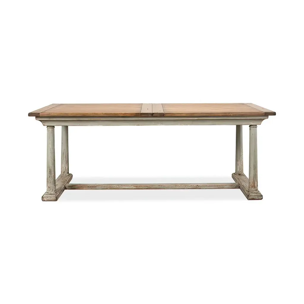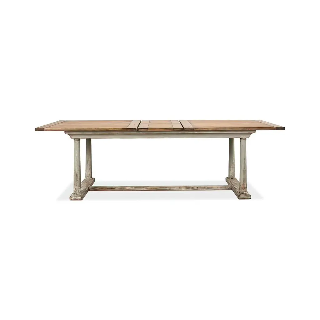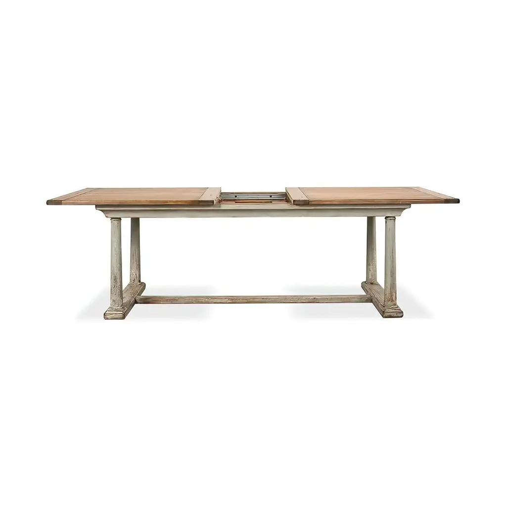 French Provincial Extension dining table with a draw leaf top, self-storing leaves on a sage-painted trestle end stretcher base.Dimensions:Open - 100" W x 37" D x 31" HClosed - 82" W x 37" D x 31" H.