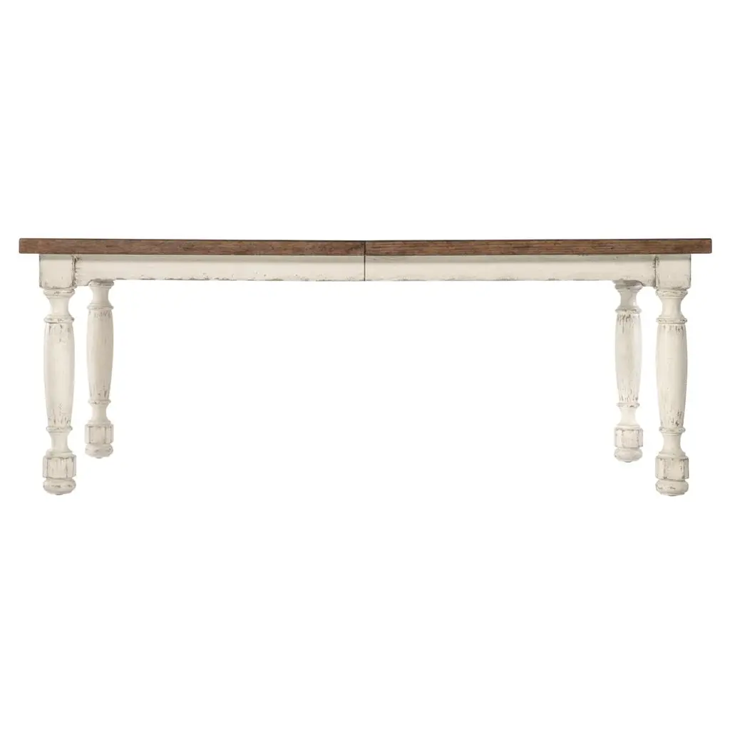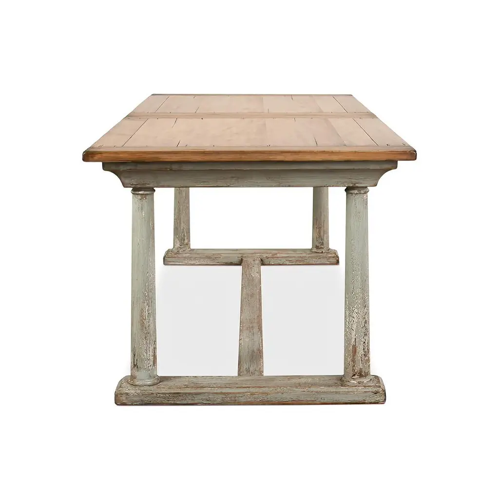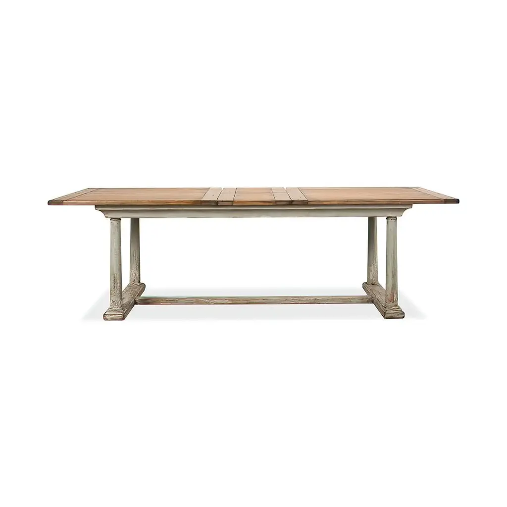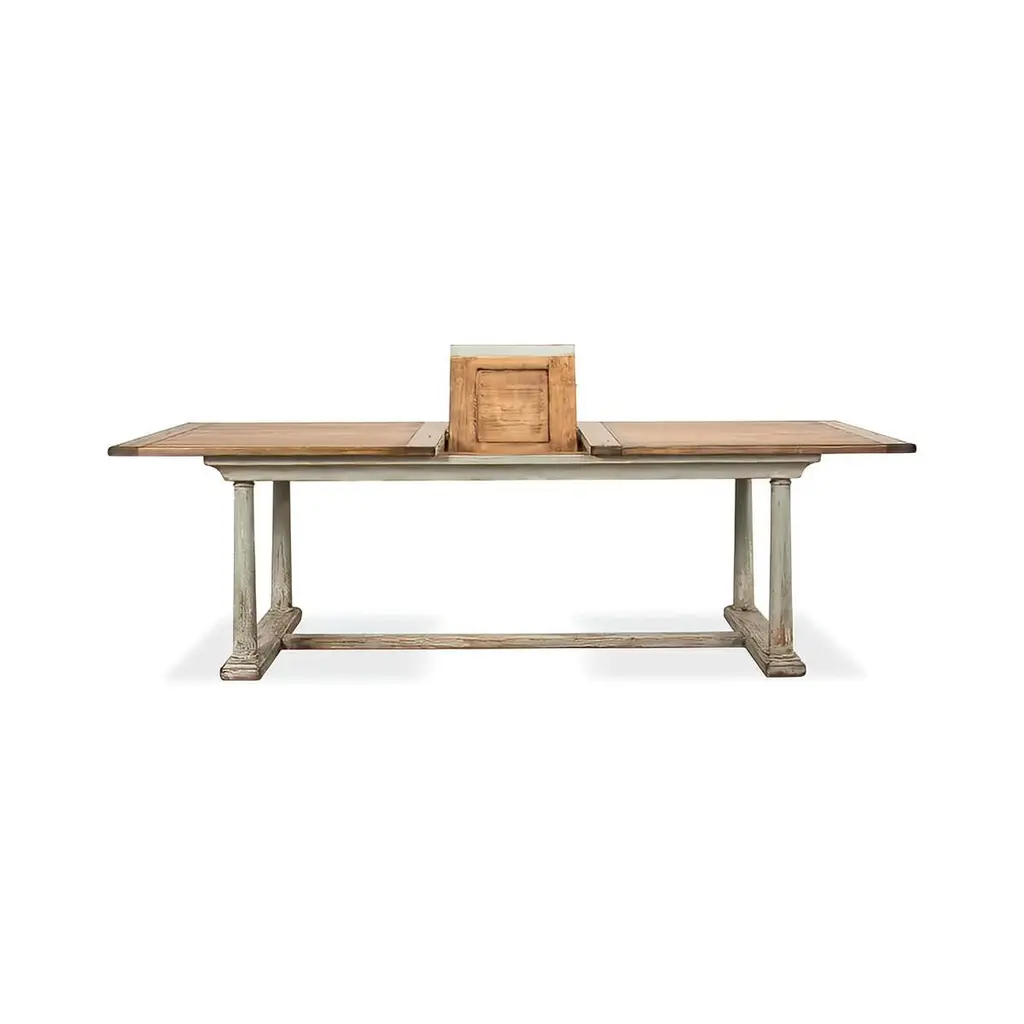 French Provincial Extension dining table with a draw leaf top, self-storing leaves on a sage-painted trestle end stretcher base.Dimensions:Open - 100" W x 37" D x 31" HClosed - 82" W x 37" D x 31" H.