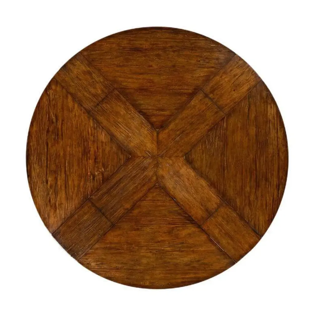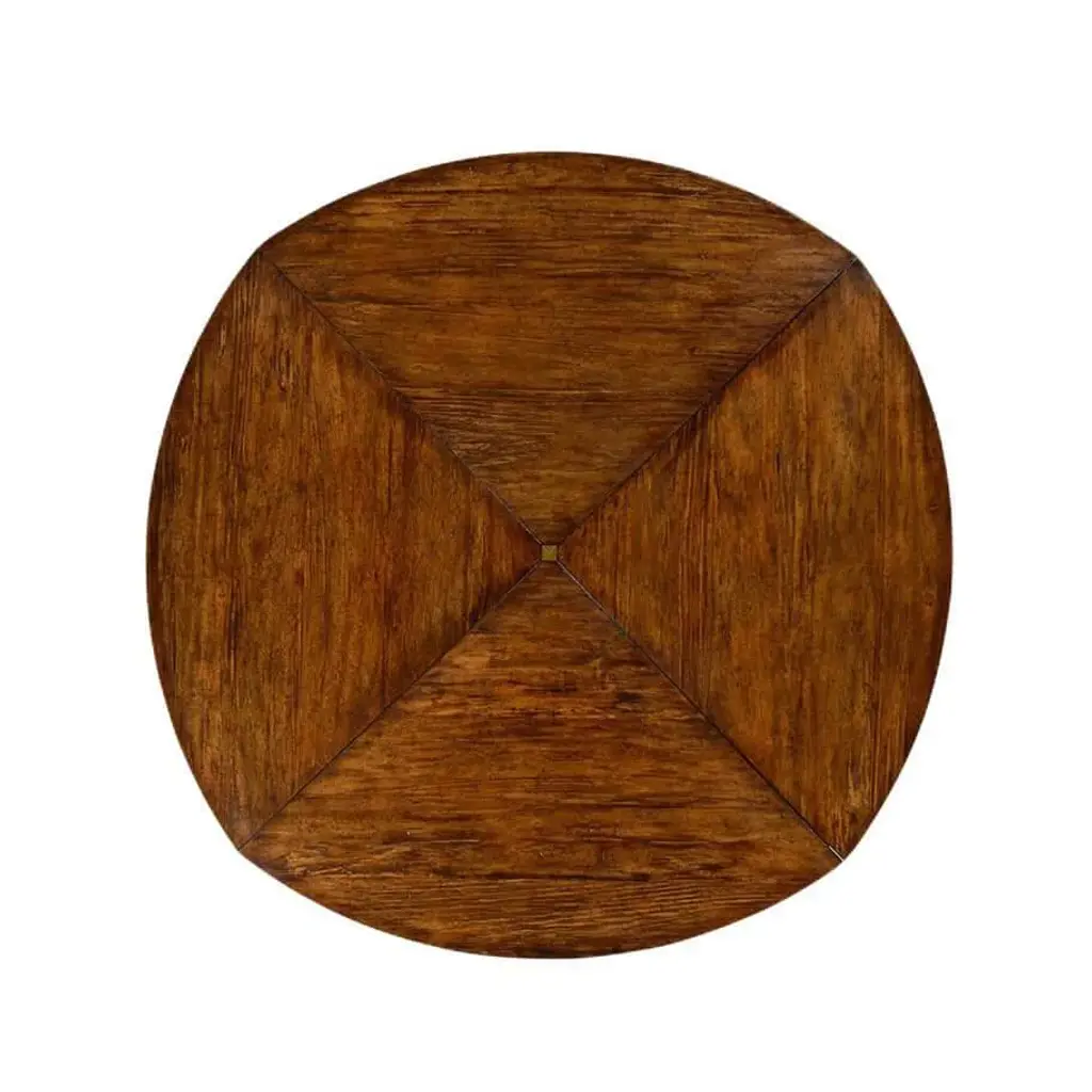 A Provincial 59" walnut-topped circular dining table with a rustic finish showing exposed saw marks set on a substantial baluster stem base, the table extending via an ingenious mechanism of self-storing hinged fold-out leaves within. Dimensions: Closed: 59.25" W x 59.25" D x 30" H Open: 73.75" W x 73.75" D x 30" H Other dimensions Apron height: 25.25" H
