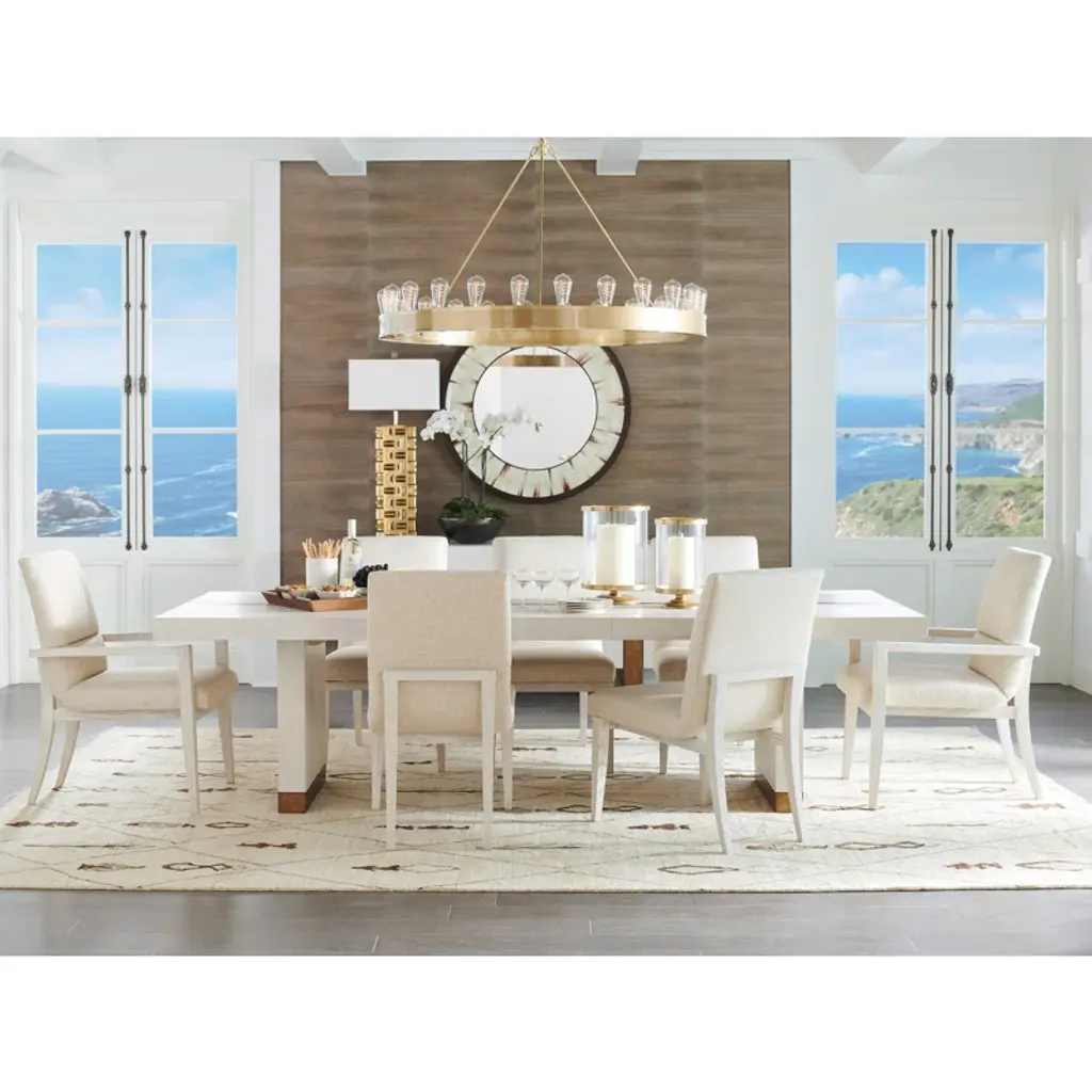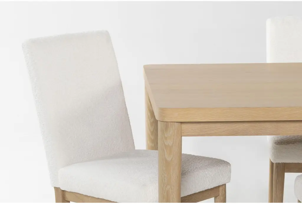 The Freya Natural Wood Extendable Dining Table with Performance Boucle Fabric Side Chair Set is perfect for your dining room or kitchen. This Scandinavian-style set features a natural wood finish and a rectangular shape, providing a warm and inviting atmosphere for your home. The table extends from 78 to 100 inches, accommodating up to six guests comfortably.