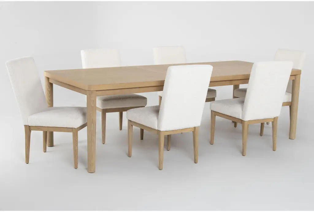 Freya Natural Wood 78-100" Extendable Dining Table With Performance Boucle Fabric Side Chair Set For 6 | Rectangular