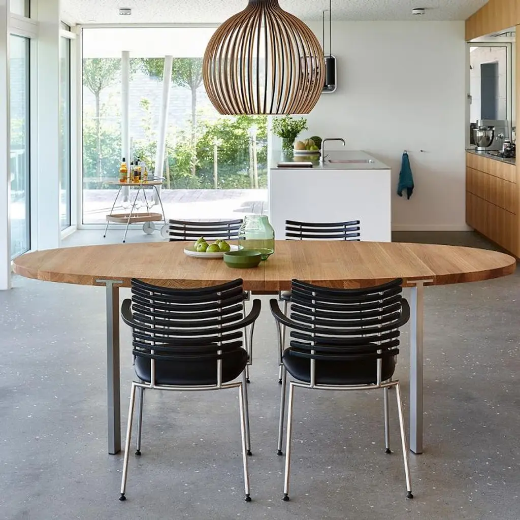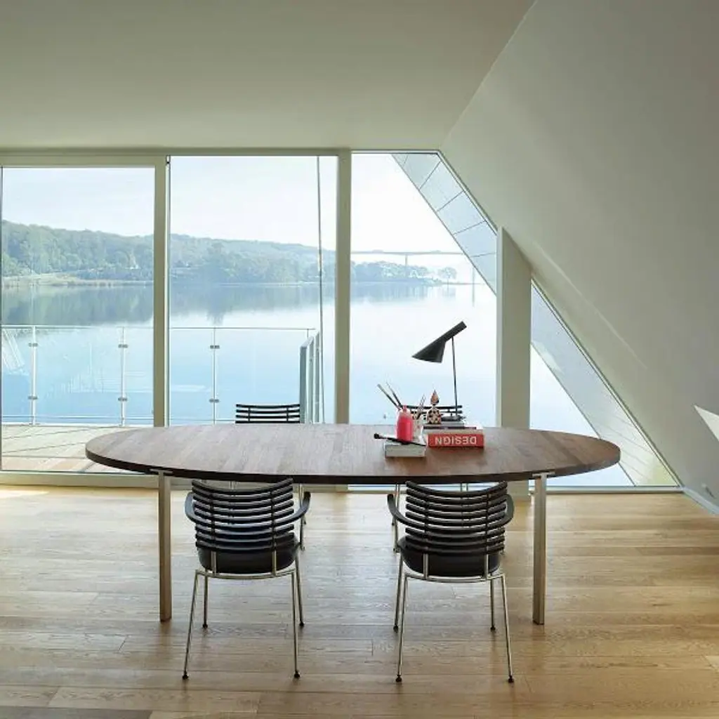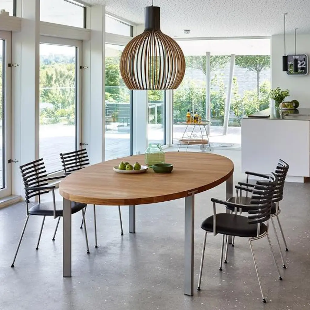 Oval table with extension possibility. The table is made in two sizes. The table can be extended with up to 8 extension leaves. As standard the table is prepared for maximum 2 extension leaves. The table top is available in solid wood.