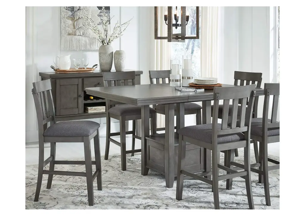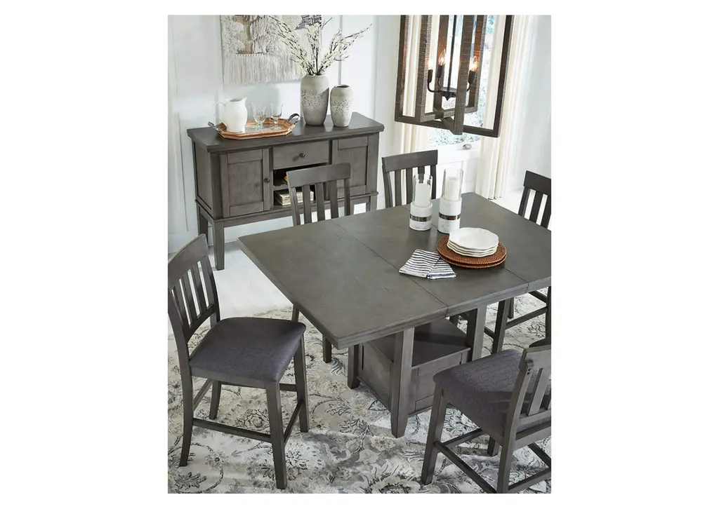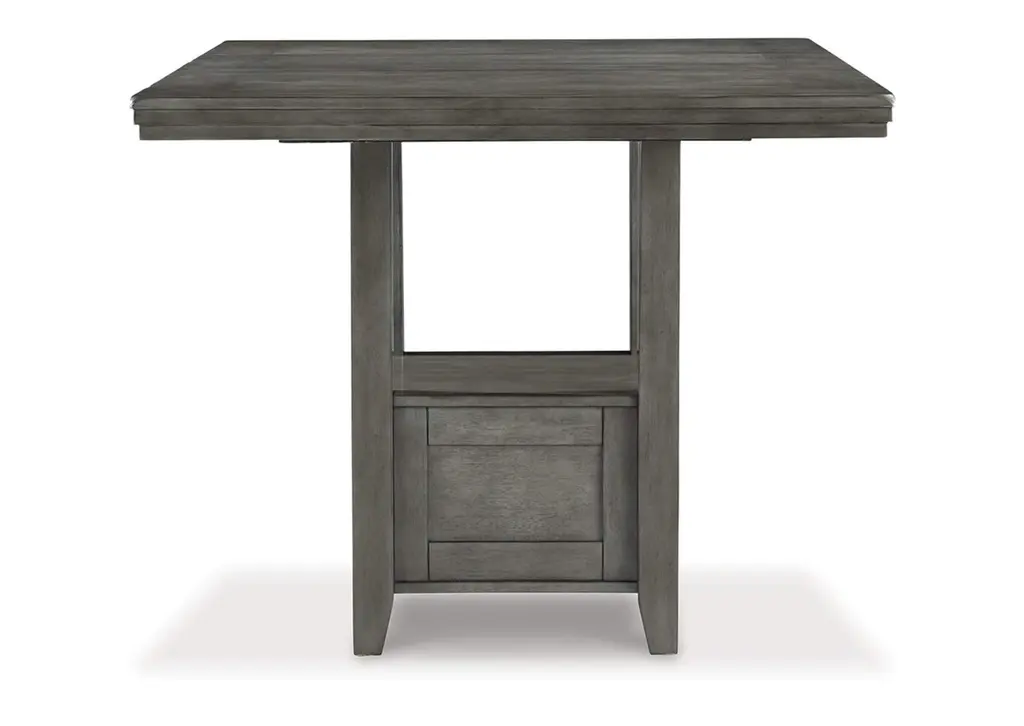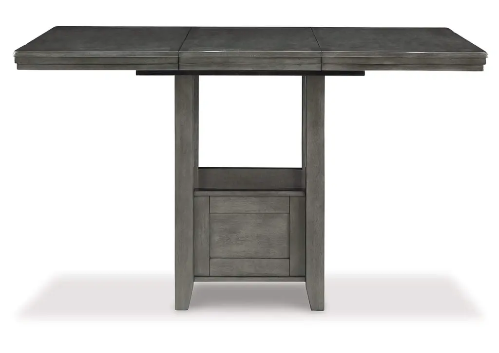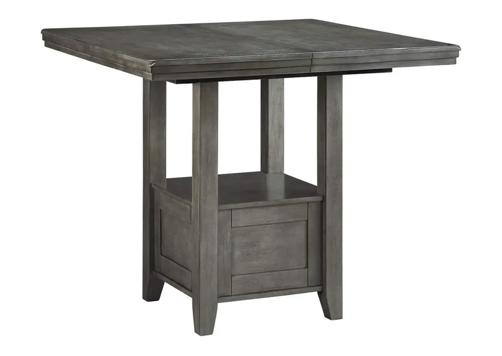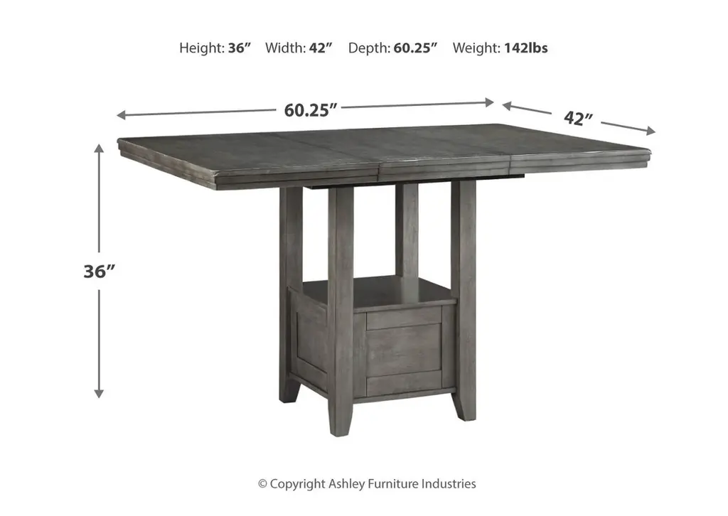 Cool and on-trend. The Hallanden counter height extension table sports an antiqued gray color for a contemporary-yet-casual feel. The table features a storage base and removable leaf for extra seating room, making it a breeze to clear off clutter and expand your table space. Dining with friends and family has never been so stylish. Weight 137.000 lbs. (61.65kgs.)