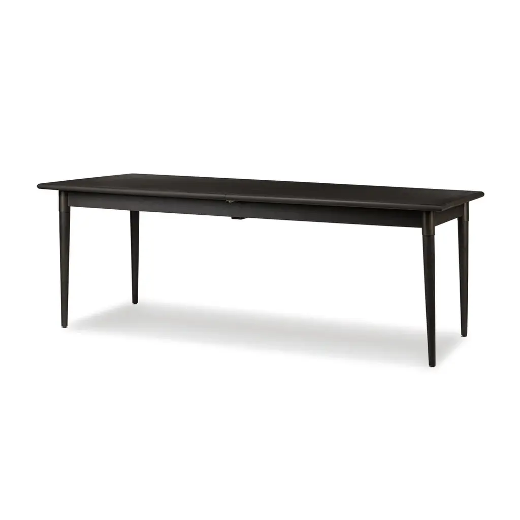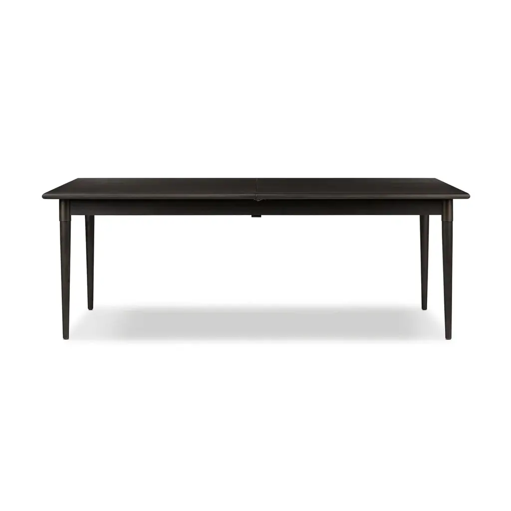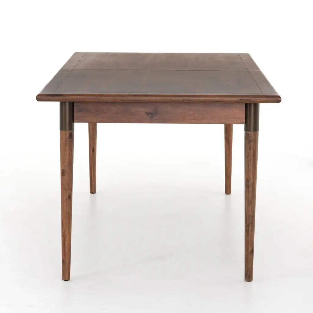 Style with flexibility. Finished in a warm toasted walnut, a rectangular acacia tabletop, cone-tapered legs and iron detailing speak to Scandinavian modernism. Expansion from 84" to 104" means more space when company calls.