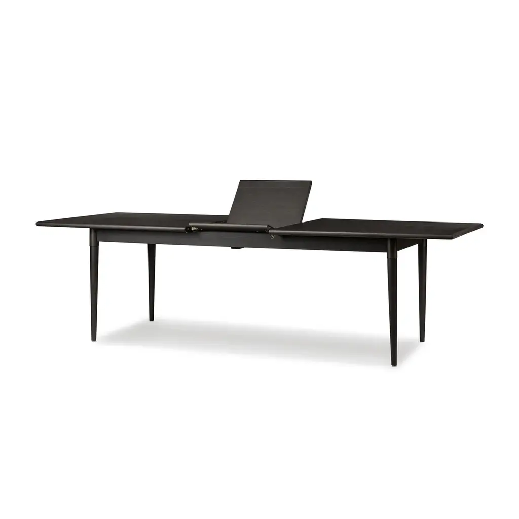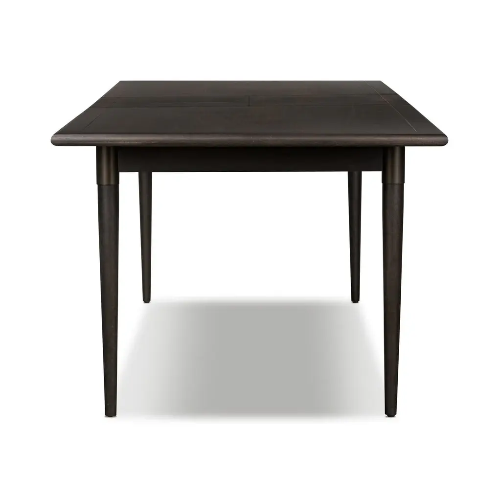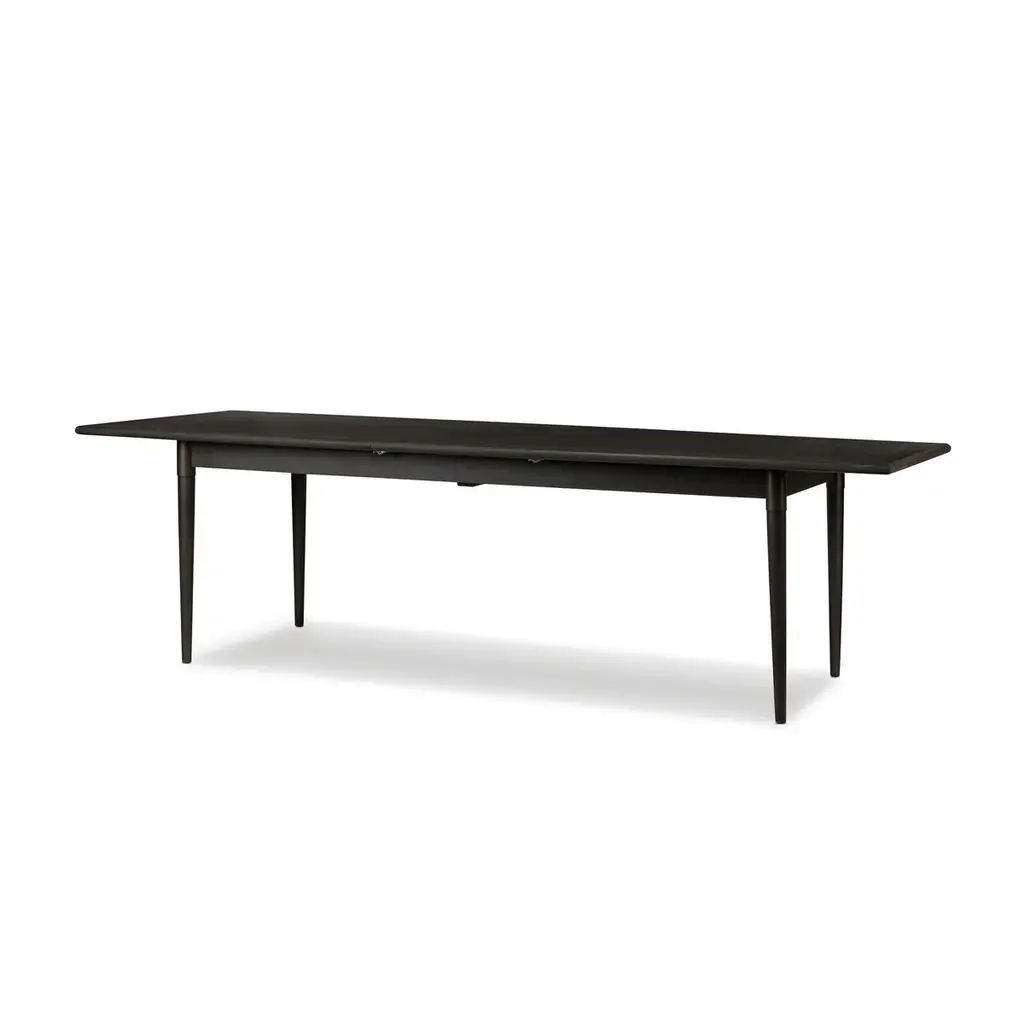 Style with flexibility. Finished in a warm toasted walnut, a rectangular acacia tabletop, cone-tapered legs and iron detailing speak to Scandinavian modernism. Expansion from 84" to 104" means more space when company calls.