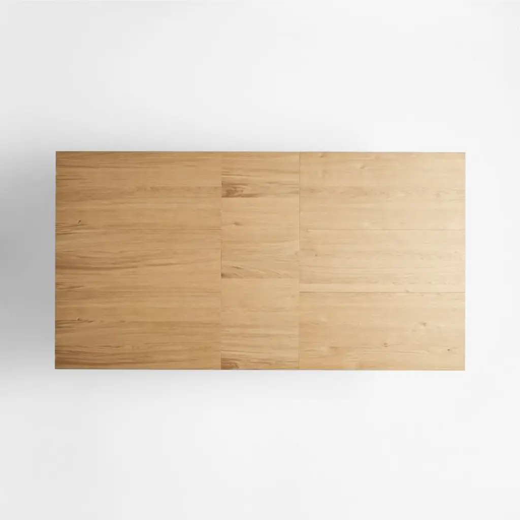 A masterpiece of Italian ingenuity, our Ibiza table features a unique extension mechanism that seamlessly transitions from seating 8 to 12. To expand the table, the four corners slide out effortlessly on metal glides to reveal three self-storing butterfly leaves that unfold with leather tabs. Closed or open, the table displays the captivating grain variations inherent to natural oak in the expansive top and plank style legs.