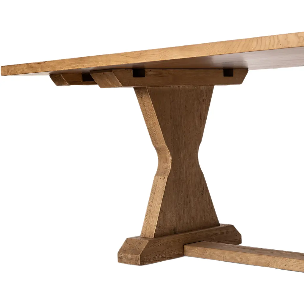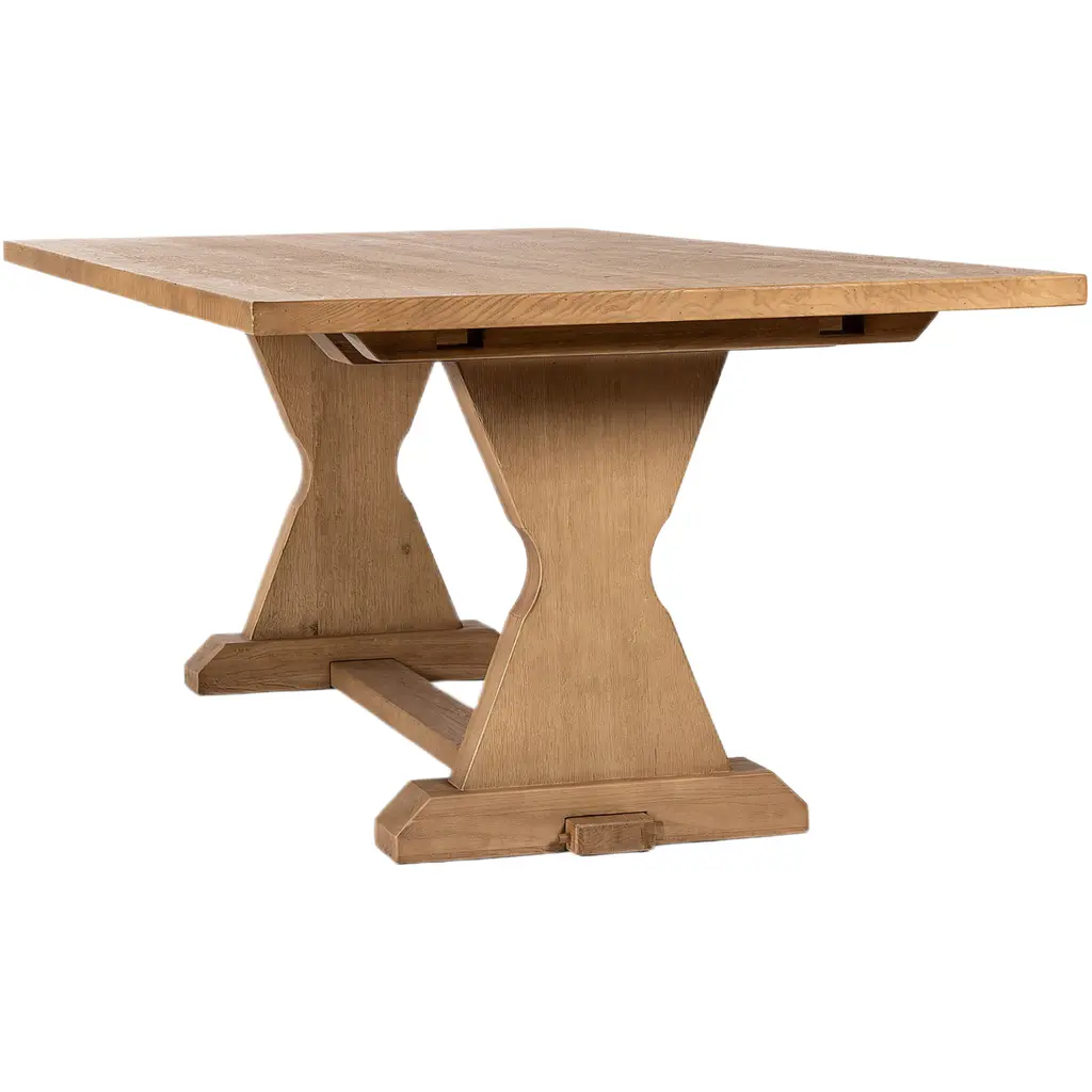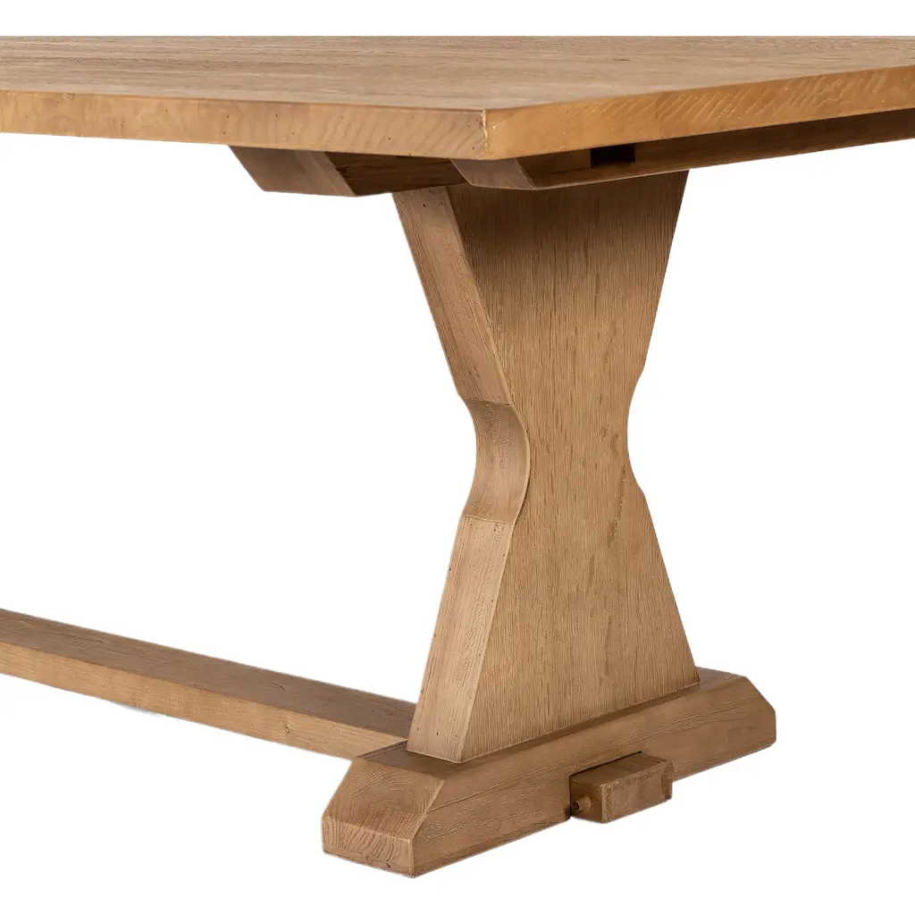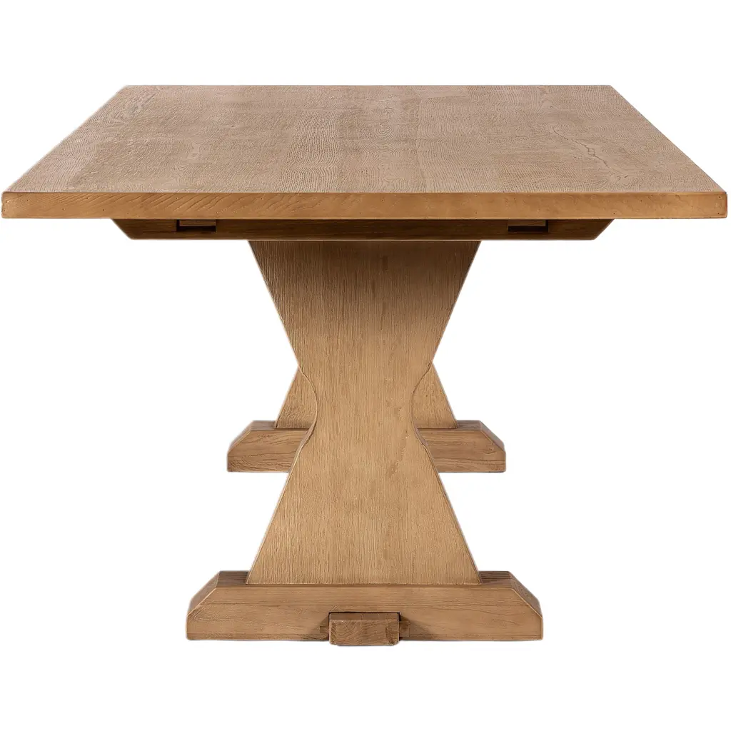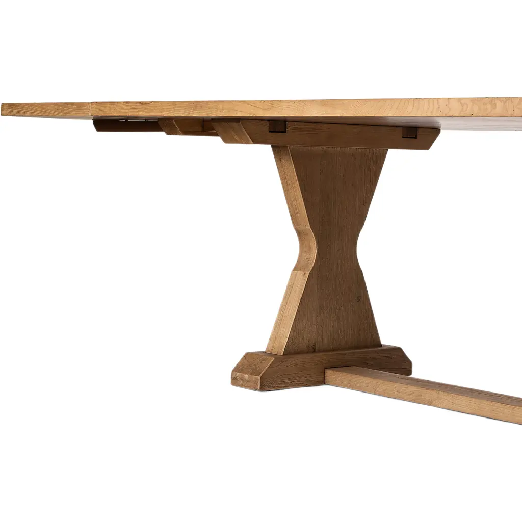 The Isalyn Extension Dining Table offers a modern twist on the classic trestle table design. Featuring a playful center cutout, it adds a geometric flair to its hourglass silhouette and traditional breadboard top. This table is perfect for family dinners or hosting celebrations, extending from 88 inches to a generous 128 inches, comfortably seating 8 when closed and up to 12 when fully expanded. Both functional and stylish, the Isalyn Extension Dining Table is ready to accommodate everything from weeknight meals to festive gatherings.