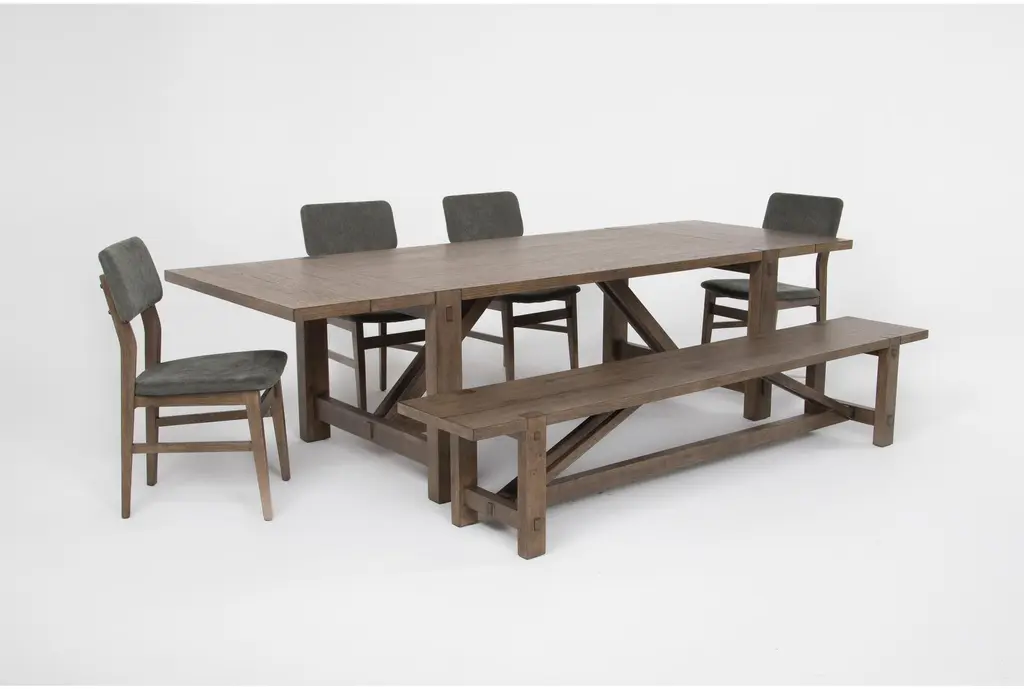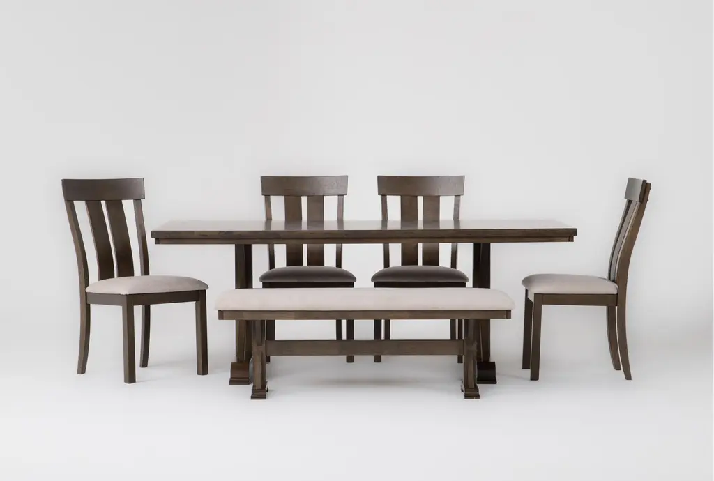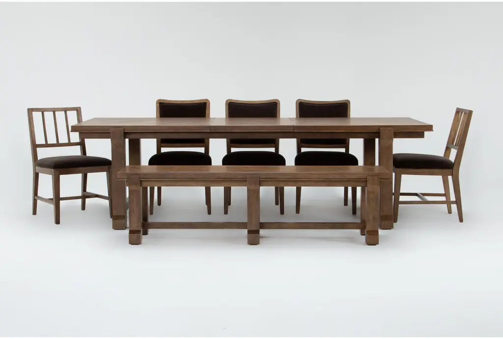 Kai Brown Cracked Oak Extendable Dining Table Set With Bench + Sage Chairs Set For 6