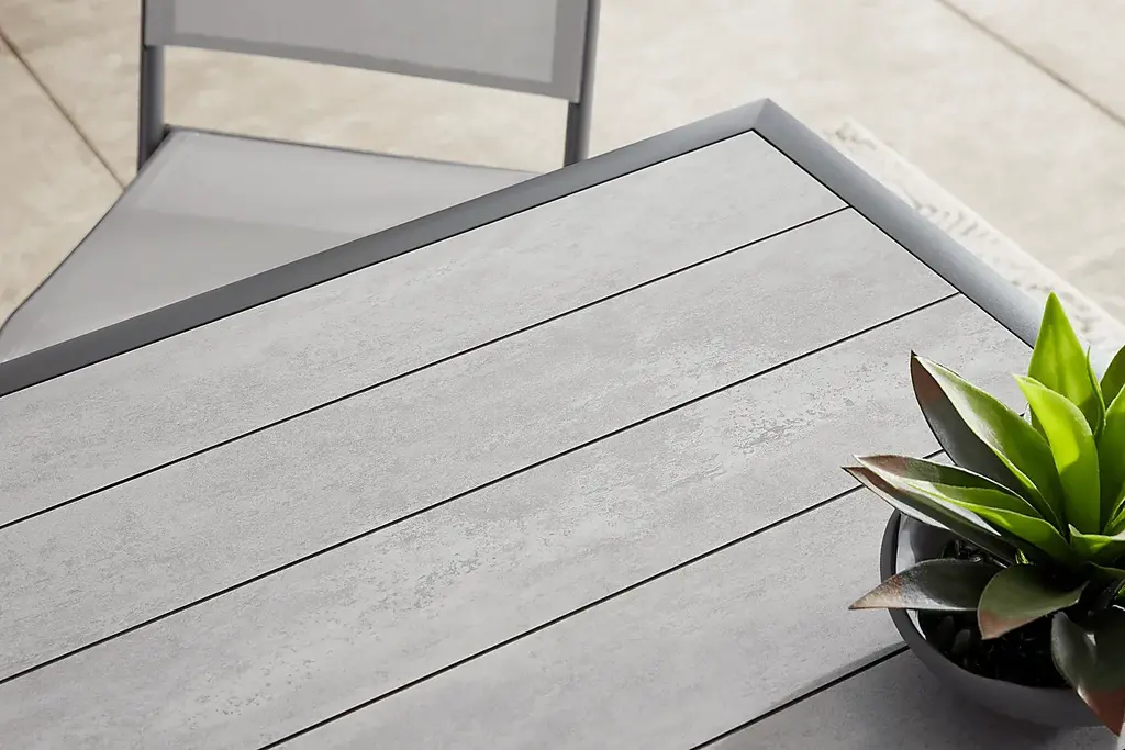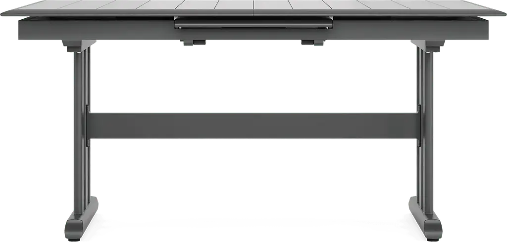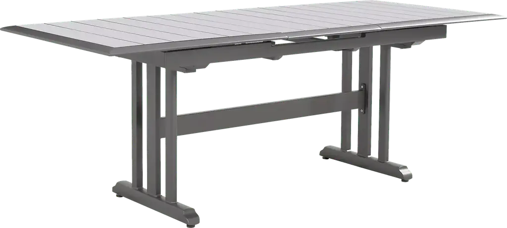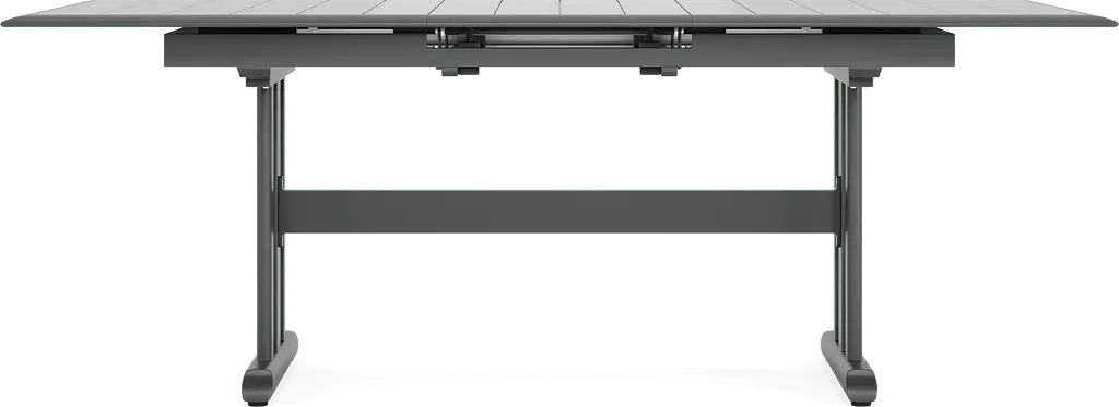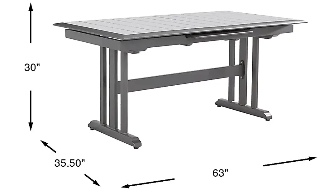 Warmth, form and function syncing in perfect harmony is how the Kellen patio collection makes belonging feel like second nature. Crafted with a rust-resistant aluminum frame in a charcoal finish, this dining table features a durable plank-style tabletop in light gray with a sleek double pedestal base. Always ready to accommodate more guests, a pop-out lever conveniently extends the tabletop from 63" to 82.75".