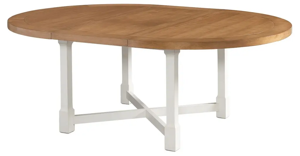 With its beautifully figured maple veneers and white base, this dining table is modern farmhouse style at its most sophisticated. It comes with a 22-inch leaf, expanding it from a 58-inch round table to an oval that's 80 inches wide and able to seat up to eight people.