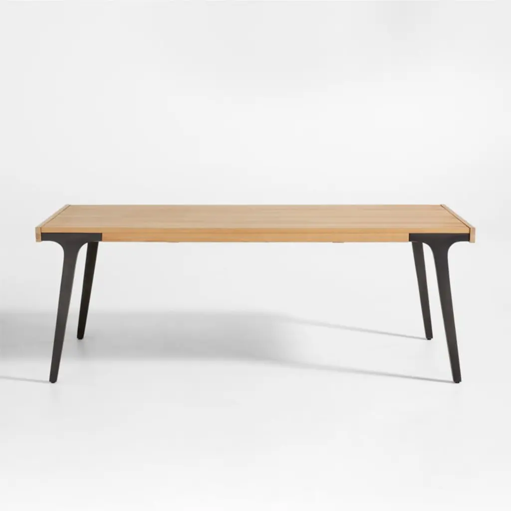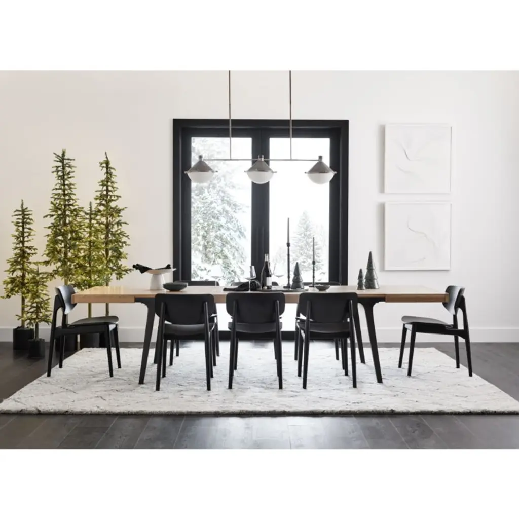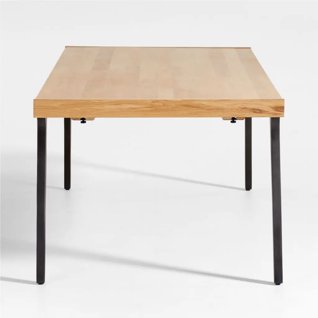 Planks of solid white oak with a satin natural finish enliven our Lakin dining table with natural color and lively wood grain. Antiqued to get the look of cast iron, metal legs seamlessly integrate with the table's wood apron, angling out for maximum style and legroom. Breadboard ends pull out to accommodate two leaves that expand seating.