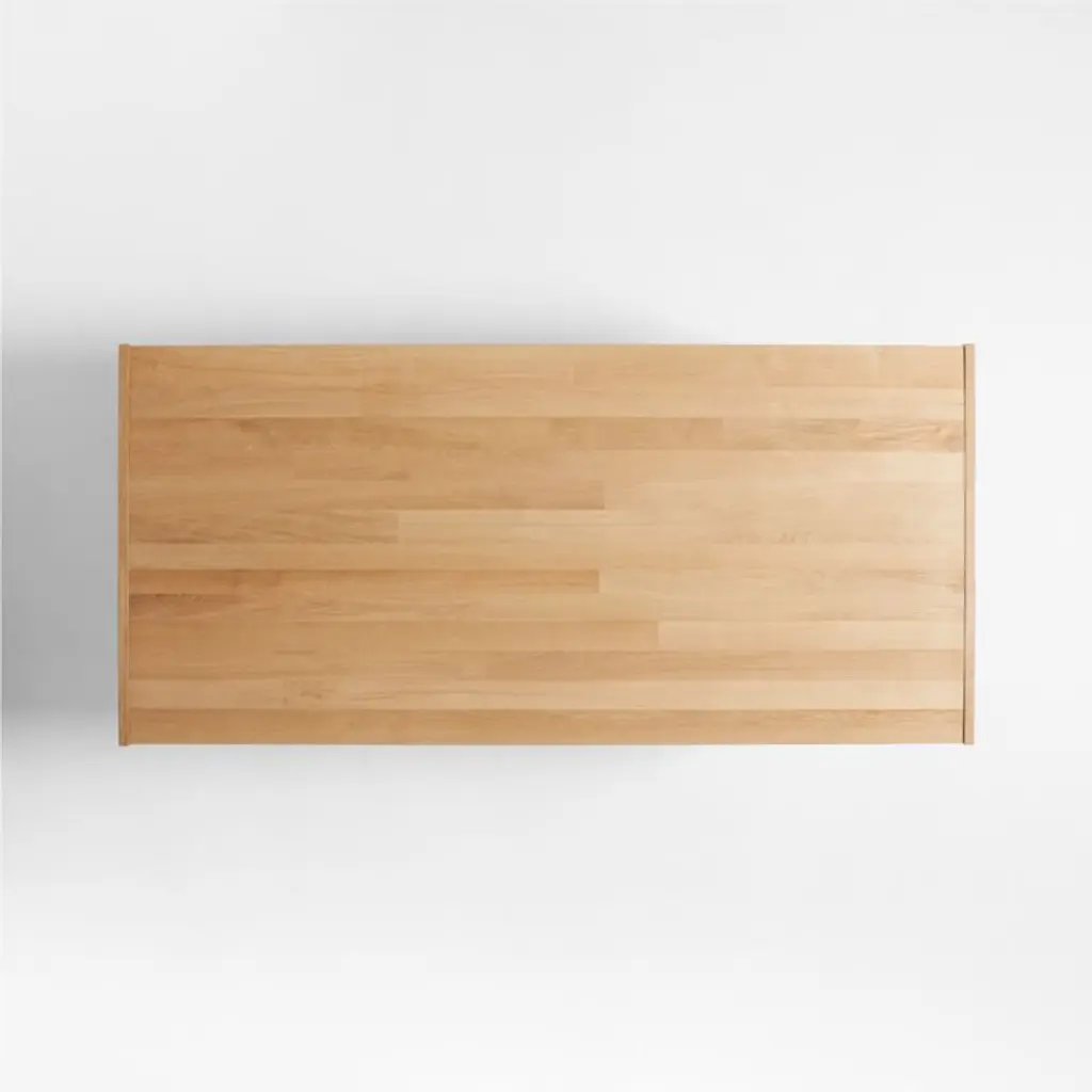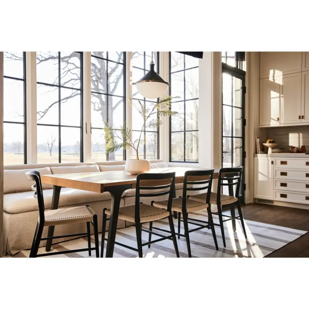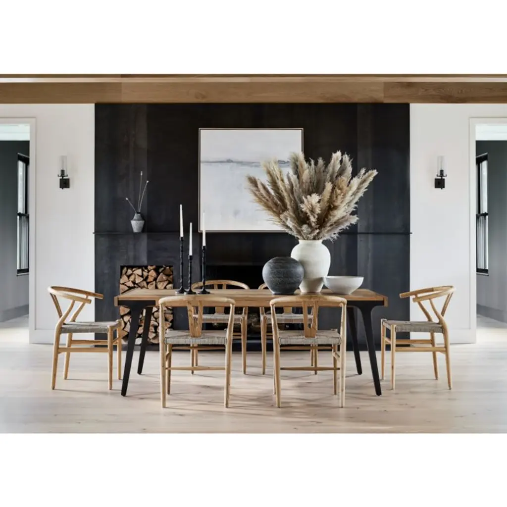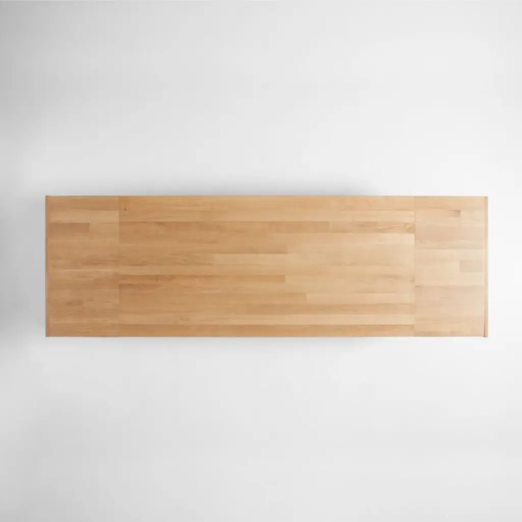 Planks of solid white oak with a satin natural finish enliven our Lakin dining table with natural color and lively wood grain. Antiqued to get the look of cast iron, metal legs seamlessly integrate with the table's wood apron, angling out for maximum style and legroom. Breadboard ends pull out to accommodate two leaves that expand seating.
