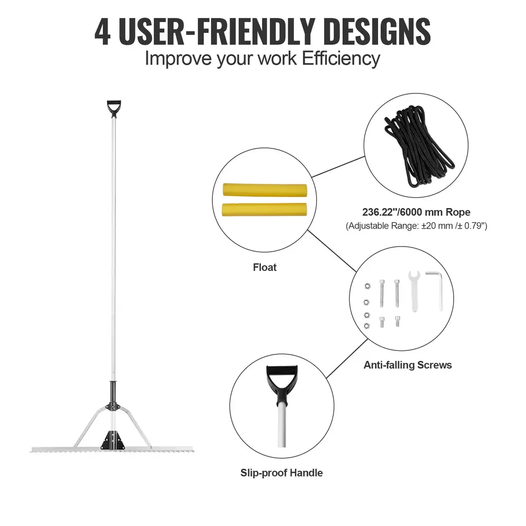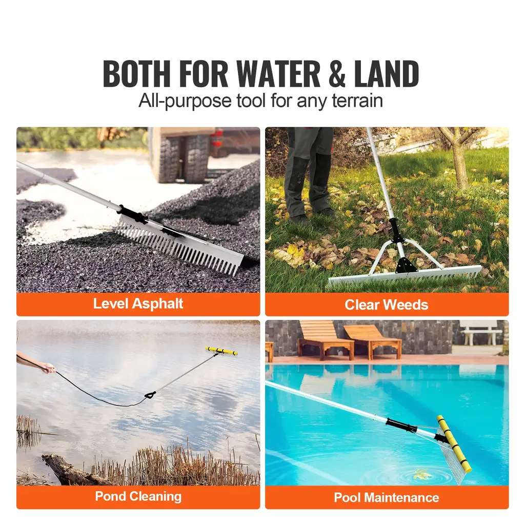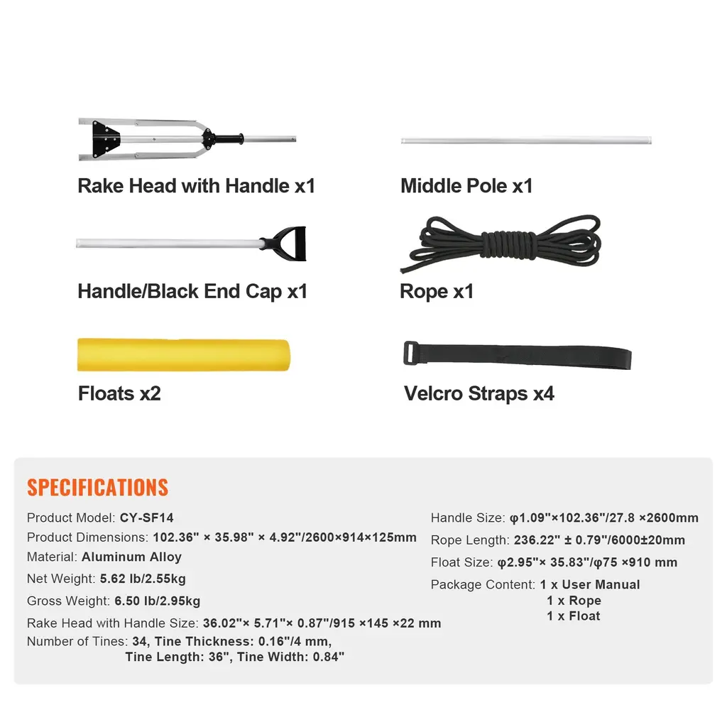 Versatile for Land & Water: Whether leveling road edges, clearing pond leaves, tidying garden weeds, or even cleaning floating debris in pools, our landscape rake performs well in all tasks. Extended Cleaning Reach: Featuring a 36" tine length, 0.31" tine width, and 37 tines, our lake weed rake effortlessly handles leaves, stones, grass, and floating objects. With a 75"/102.36" non-slip handle, it efficiently tackles extensive cleaning jobs. Effortless 3-Step Setup: Featuring a spring-lock fast assembly design, the lake rake offers easy 2-level length adjustment to suit various needs. When not in use, you can quickly disassemble it for compact storage in small spaces. 3 Considerate Designs: The slip-proof triangular handle ensures a secure grip during the cleaning process, preventing slipping. No need to worry about rake head loosing because of the anti-loose screw. The spring-lock mechanism is beginner-friendly, enables easy disassembly or assembly with a simple press. Robust Aluminum Alloy: Built to withstand a range of conditions, our durable pond rake boasts waterproof, high-temperature resistance, and anti-scratch features. Fine craftsmanship ensures a smooth, burr-free surface, offering a reliable and secure user experience. Package Content 1 x Rear Grip 1 x Middle Pole 2 x Fixed Rod 1 x Allen Key 1 x Allen Wrench 2 x M6 X 40 Screw 2 x M6 X 12 Screw 4 x Nut (1 x Landscape Rake 1 x Rope 1 x Float 1 x User Manual)for 102.36" option