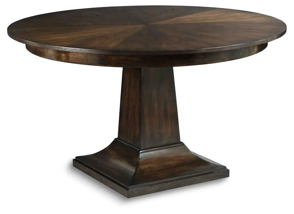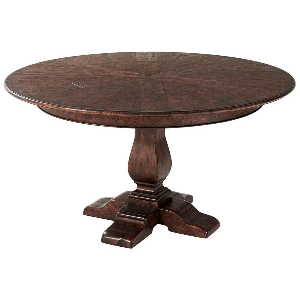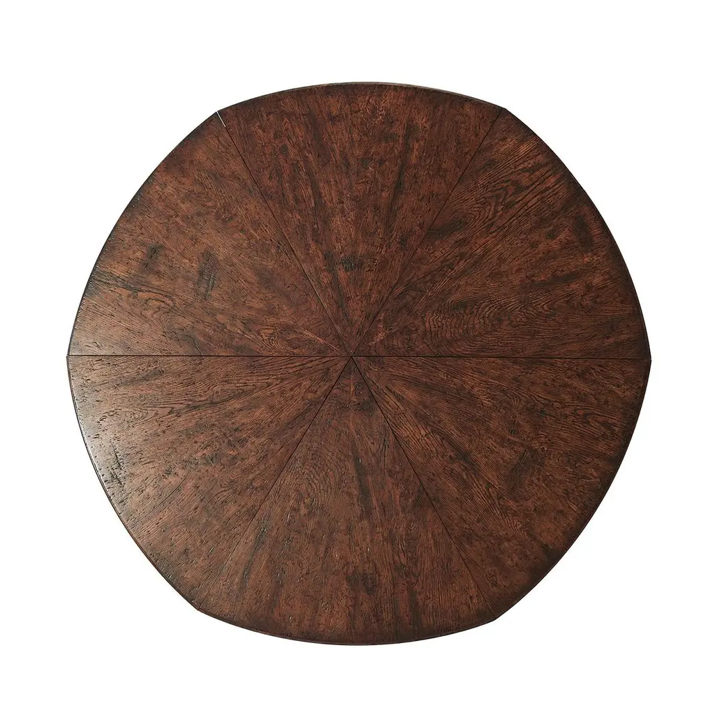 A reclaimed oak and chestnut burl restored circular extending dining table, the segmented top opening to reveal six self-storing fold-out leaves above a plain frieze, on a vase column support and crossover refectory feet.Open Dimensions: 72" W x 72" D x 30" HClosed Dimensions: 54" W x 54" D x 30" HClearance under apron: 25.75" H.