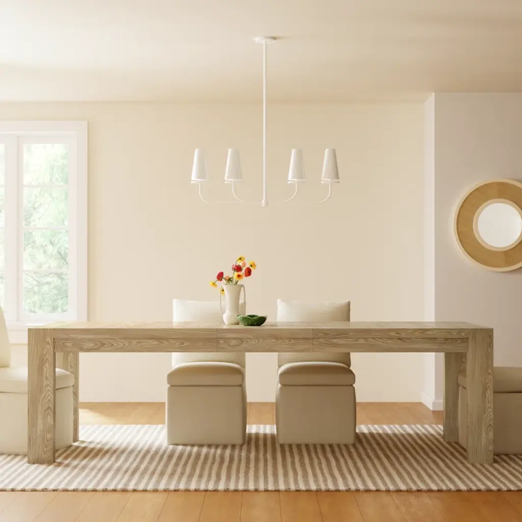 Inspired by a classic farmers' table, this dining table marries the charm of the quintessential design with modern elements – and you’ll love the result. Crafted from solid and engineered wood, it’s finished in a pale oak hue that shows off the organic wood grain and natural variations. It comes with a removable leaf that extends the table to 102” long, comfortably accommodating up to eight people. Surround with your chairs, top with a seasonal centerpiece, and start the party.