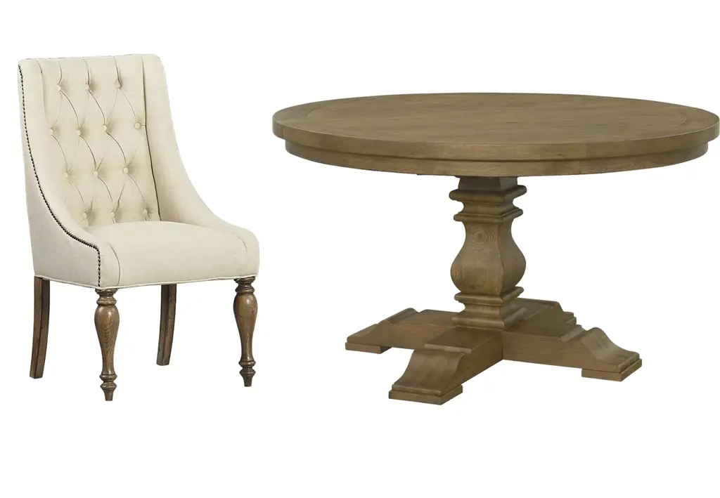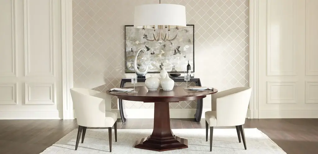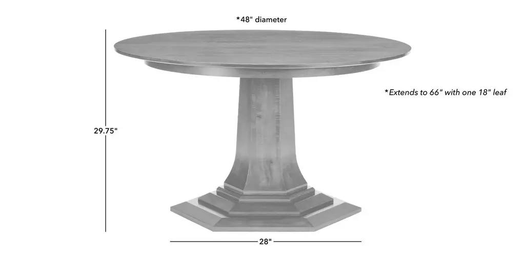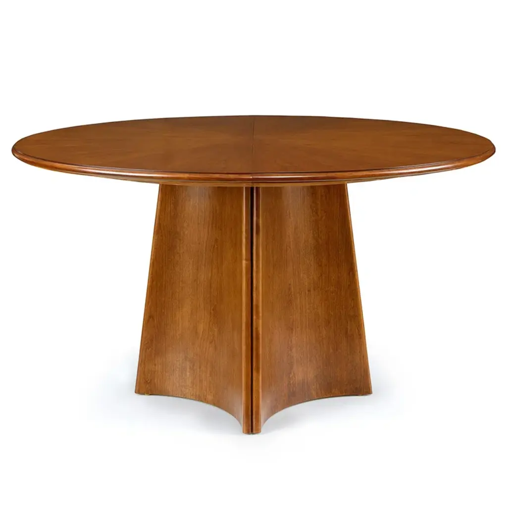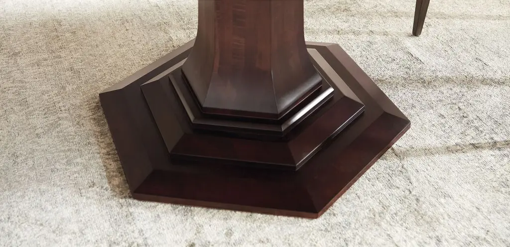 Art moderne meets Frank Lloyd Wright’s linear styling—Lorenze’s faceted base is a work of art handcrafted in our own workshops, in the wood finish of your choice. Solid wood construction in the base ensures both durability and beauty. Available in 48” and 60” diameters to fit spaces of all sizes, with an extension leaf to accommodate extra guests.
