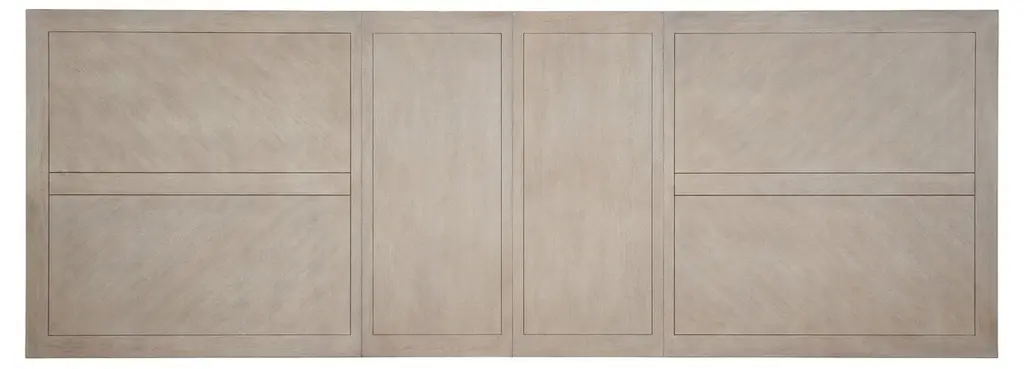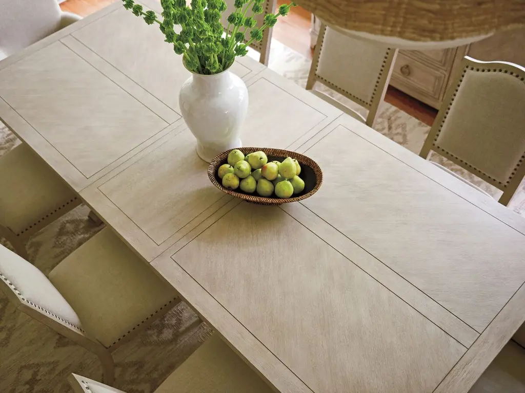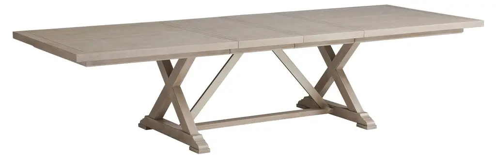 The whitewash finish brings contemporary sophistication to this trestle dining table. Two 20-inch leaves enable the table to expand in width from 88 to 128 inches so that it can seat up to 10 people with ease.