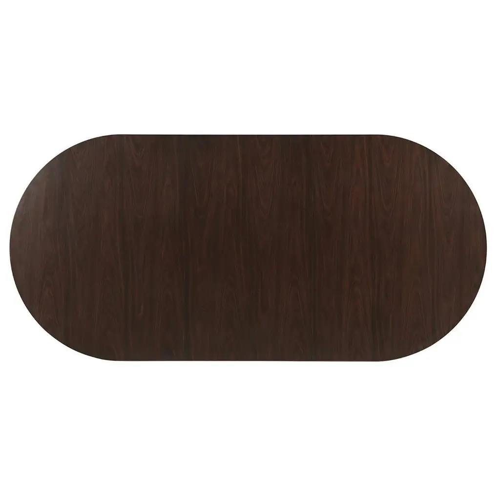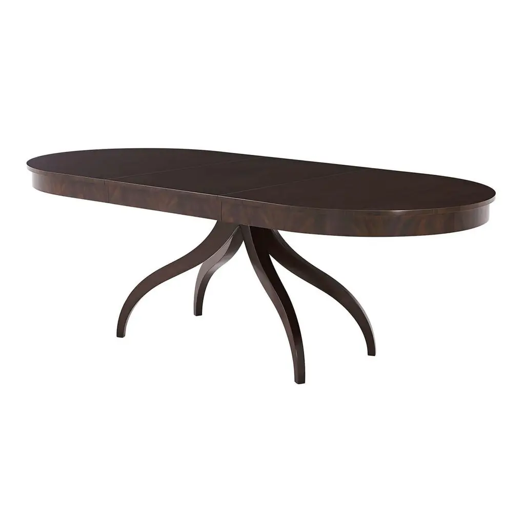 Modern Classical extension dining table with a mocha finish mahogany veneer on brass castors with one self-storing extensions leaf.One self-storing extension leafDimensions:Open - 88" W x 42" D x 30" HClosed - 64" W x 42" D x 30" HClearance 26"