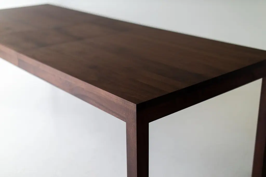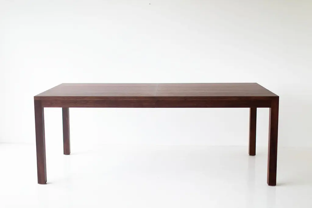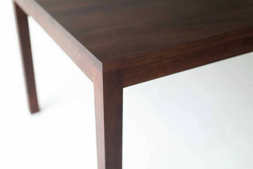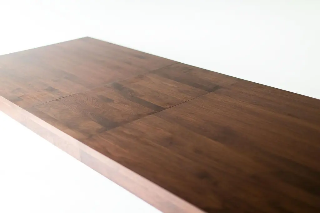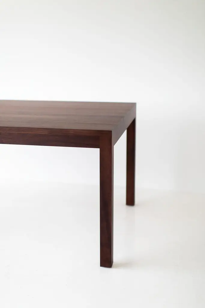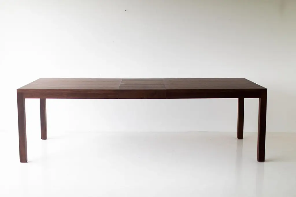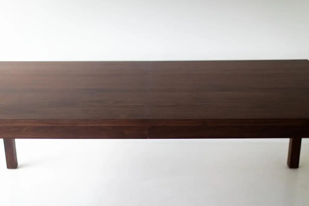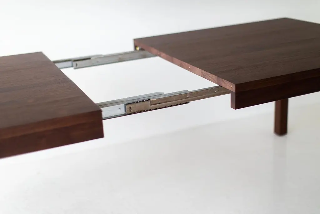 This modern dining table with extension is made in the heart of Ohio with locally sourced wood. The table can be made with or without an extension. The leaves are added in the middle with the grain running the same direction as the rest of the table. Each table is handmade with solid walnut and finished with a beautiful commercial grade matte finish. The simple lines and shape work well with all aesthetics. We love these and hope you enjoy them as much as we do!SpecsPeriod/Model: New; Mid-Century Modern InspiredSpecs: Walnut, commercial-grade finishCustomizable: Yes! It's what we do :)DimensionsH 30"L 90" - 108"D 36"Wood top thickness: 1.25".