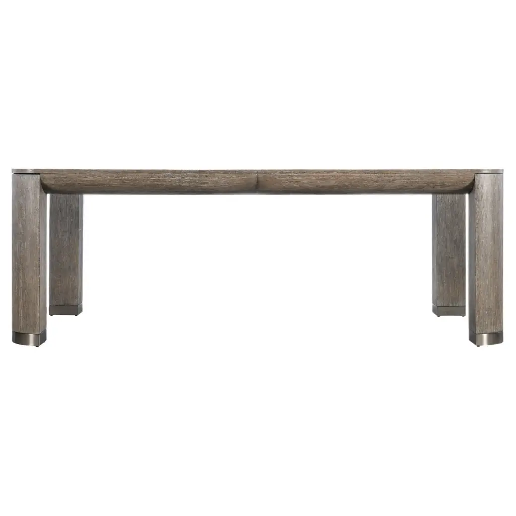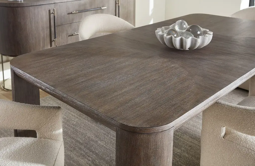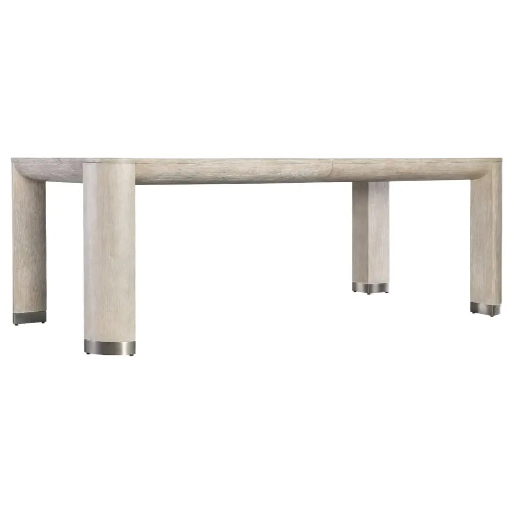 Inspired by decades of design movements with an unmistakably modern aesthetic that transcends time, the Modern Mood Leg Dining Table is a striking, softly sophisticated profile. Featuring a rounded table apron and corners, matched veneers on the top and metal banding accents on the legs, it is crafted of Quartered Oak Veneers. With one 24-inch leaf, the table extends up to 110 inches long.