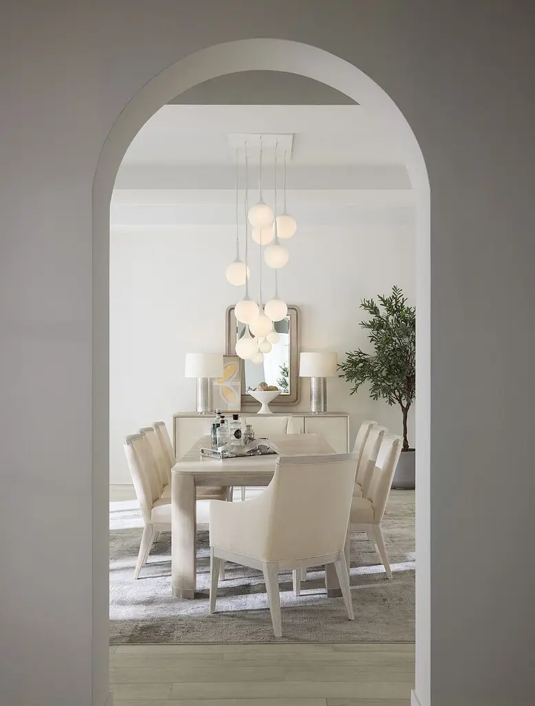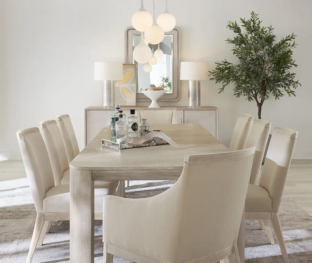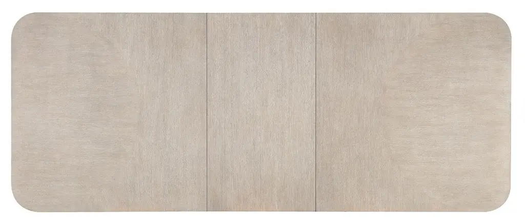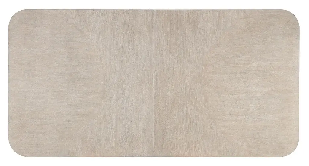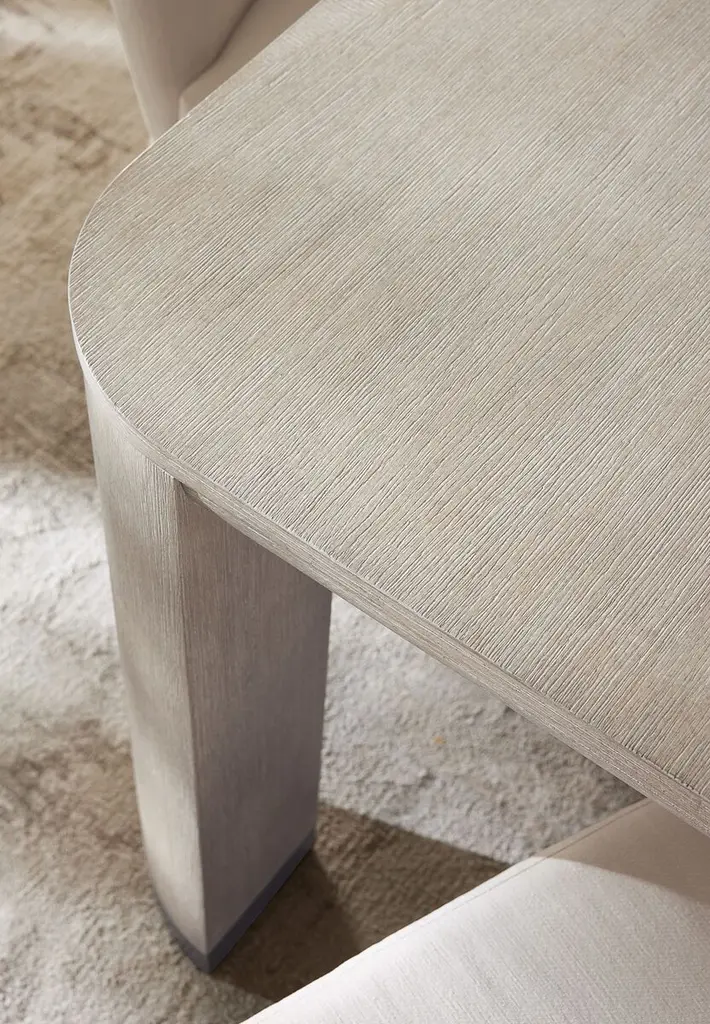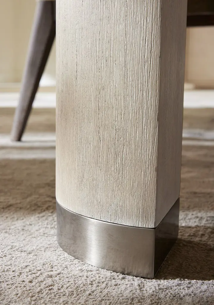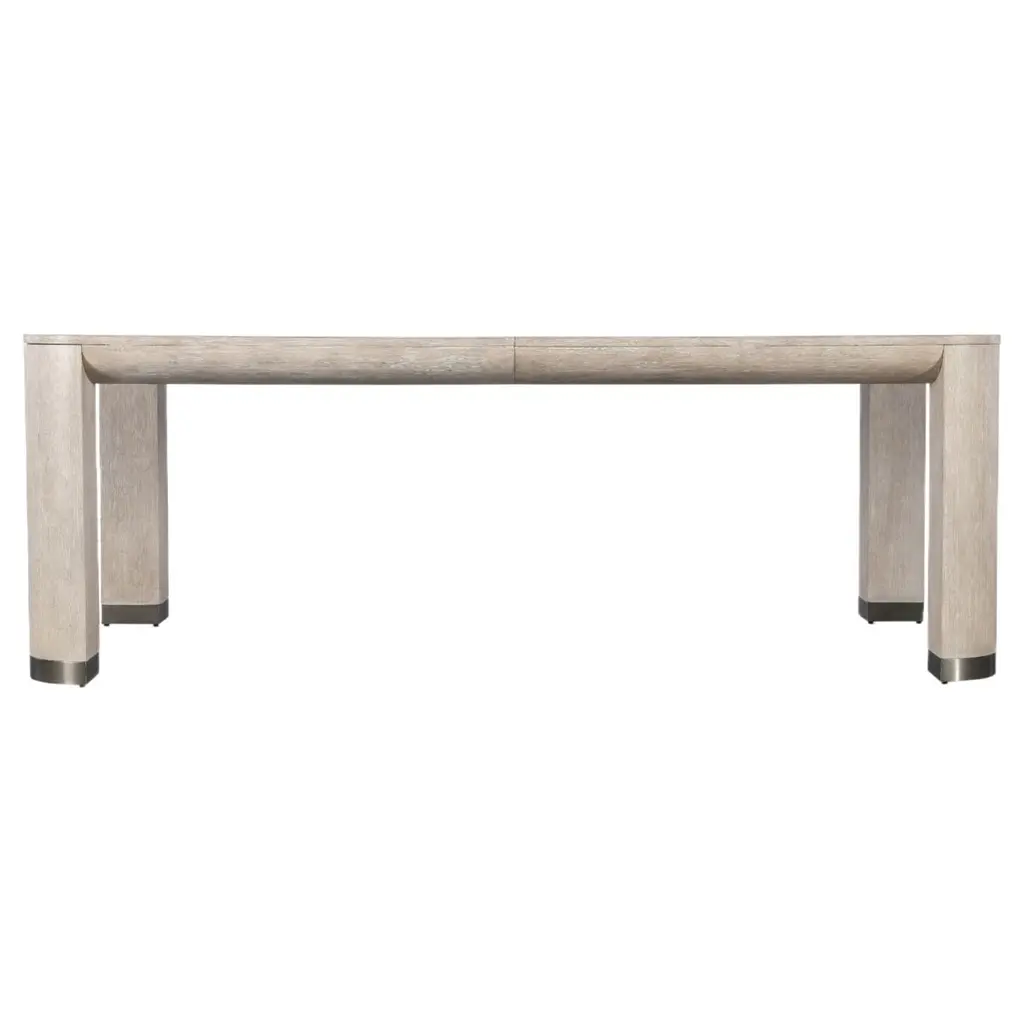 Inspired by decades of design movements with an unmistakably modern aesthetic that transcends time, the Modern Mood Leg Dining Table is a striking, softly sophisticated profile. Featuring a rounded table apron and corners, matched veneers on the top and metal banding accents on the legs, it is crafted of Quartered Oak Veneers. With one 24-inch leaf, the table extends up to 110 inches long.