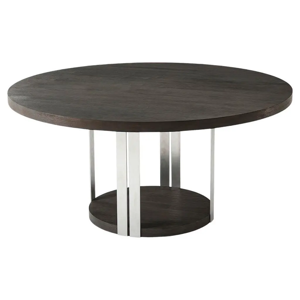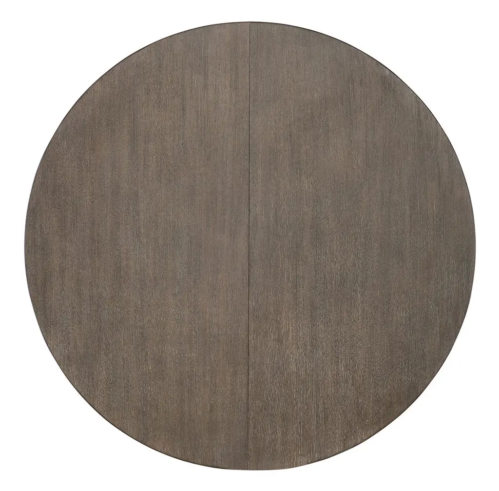 Inspired by decades of design movements with an unmistakably modern aesthetic that transcends time, the Modern Mood Round Dining Table is a statement piece with a softly sophisticated profile. Featuring metal banding accents on the base, it is crafted of Quartered Oak Veneers. With one 18-inch leaf, the table extends up to 72 inches round.
