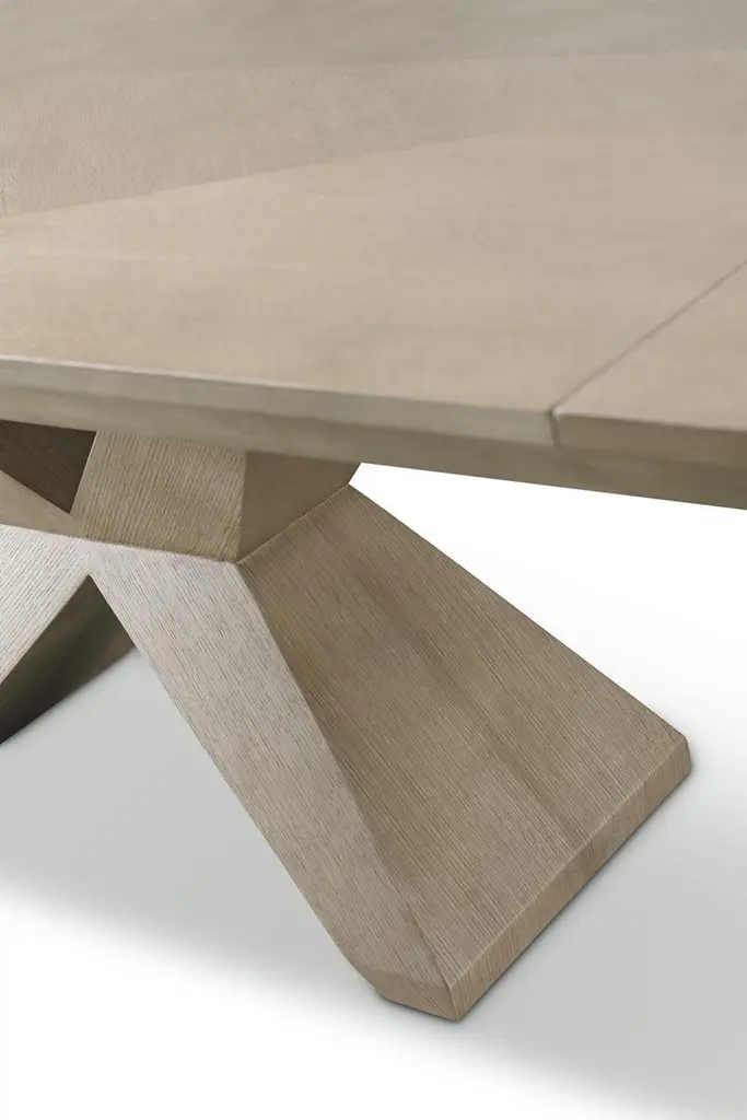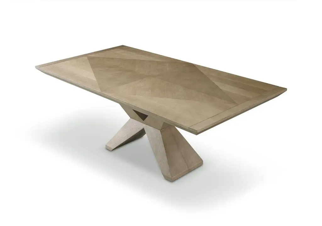 Modern Natural Oak Dining Table Designed by Greg Sheres. The “Angles” table top features a geometric design. Fully extended with leaves, this dining table opens up to 114-inches, giving you plenty of room to gather friends and family for dinner. The Angles Dining Table adds an effortless twist to your living space, and each one is created with the utmost attention to detail and superior craftsmanship. Greg has been designing and making furniture for over 30 years.The strong angular sculptural base has a "rustic modern" vibe. The reverse bevelled edges of the table top compliment the angles of the table base. The reverse diamond pattern of the wood in the table top accentuates the angles of the table base.Open 114"x42". Closed 80"x42".