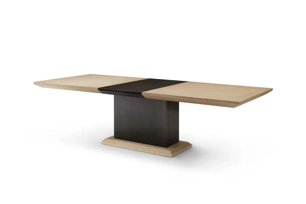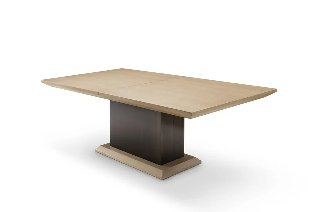 Oak and Bronze Extension Dining Table Designed by Greg Sheres. The "Barcelona" dining table features an elegant combination of antique bronze and fine oak wood, adding drama and excitement to any interior. This center-opening extension dining table easily pulls open, allowing the antique bronze leaf to be inserted. Additionally, the base is antique bronze with matching wood accents. An original design by American designer, Greg Sheres, this dining table gets a lot of attention for the unique and sophisticated joining of its natural wood finish with the bronze metal leaf and base. This refined combination of wood and metal has become a hallmark of Greg’s designs.The edge detail features a reverse bevel which is clean and sophisticated. The bronze finish is over stainless steel so it will never rust or tarnish.Table top is 86" long without the leaves, and 110" long with the leaves inserted.