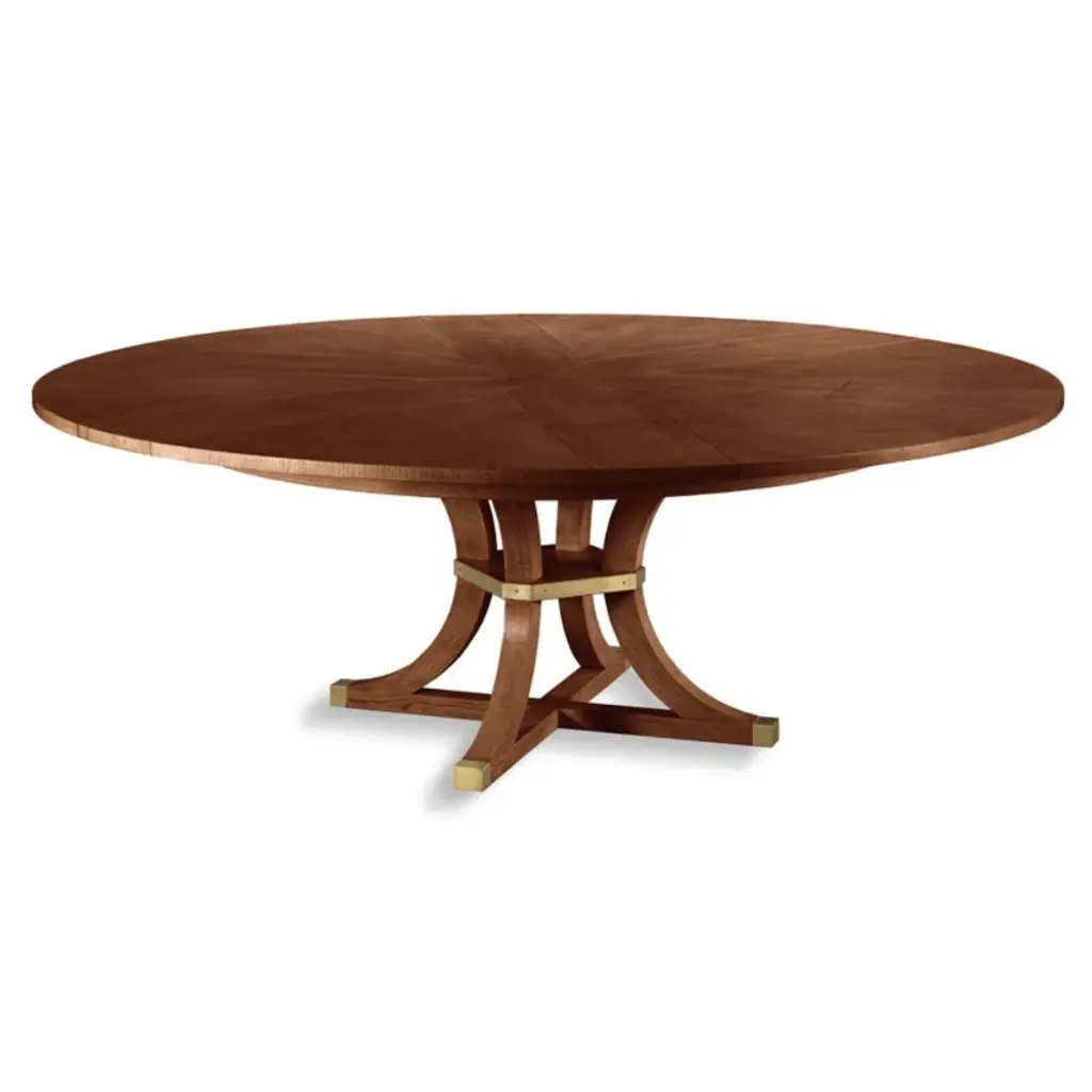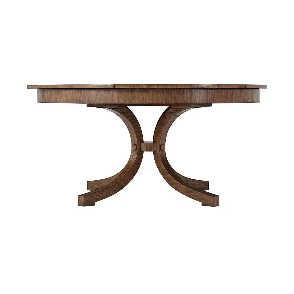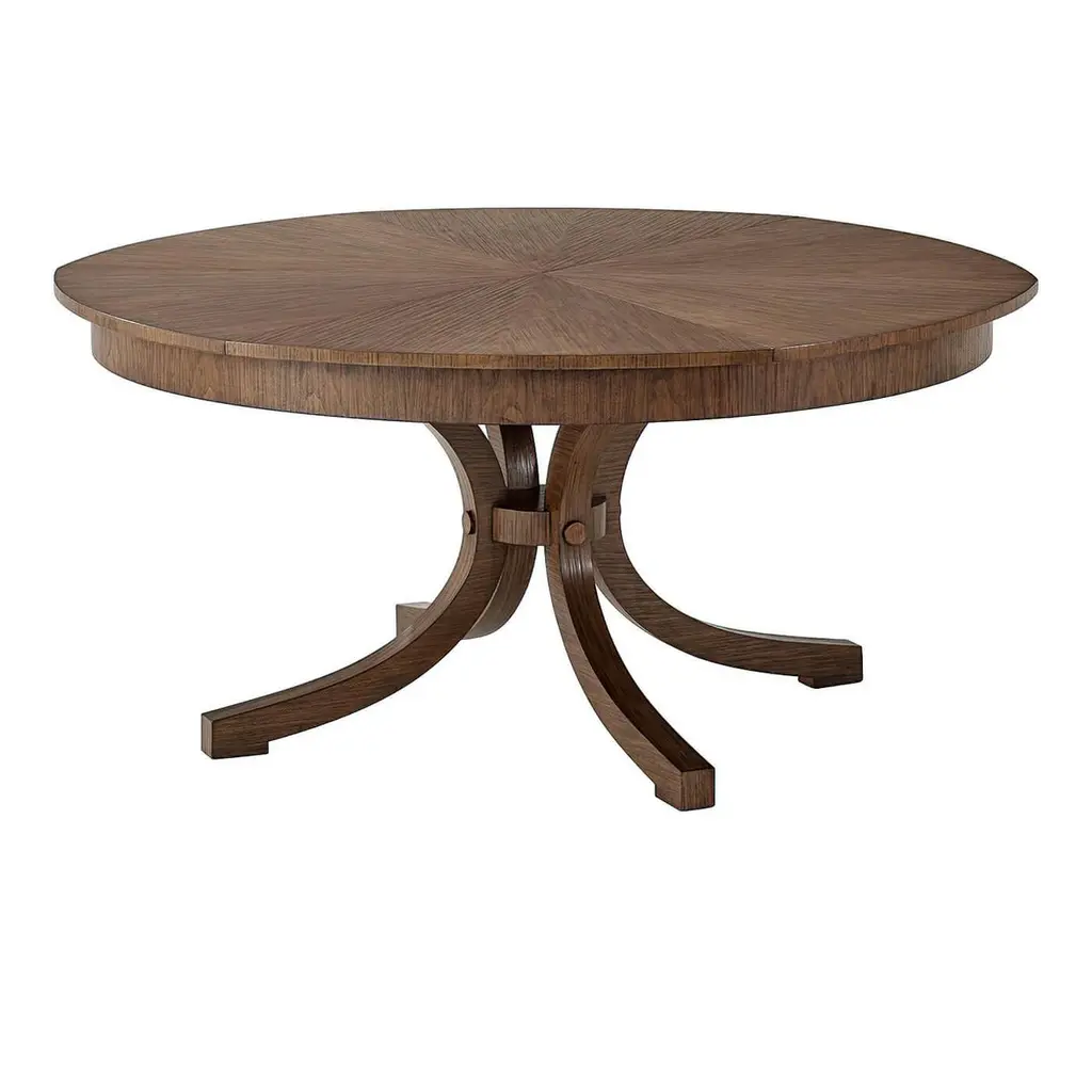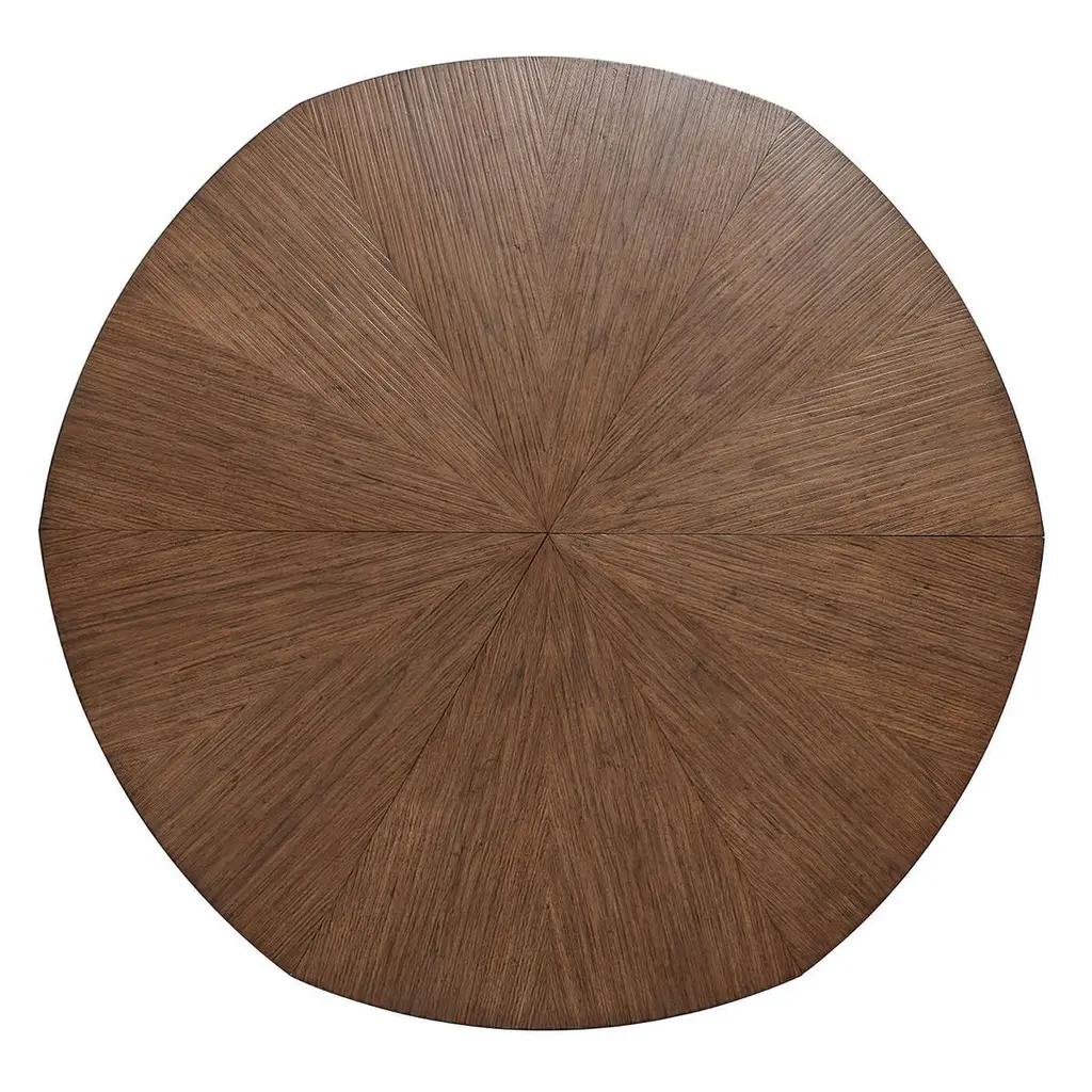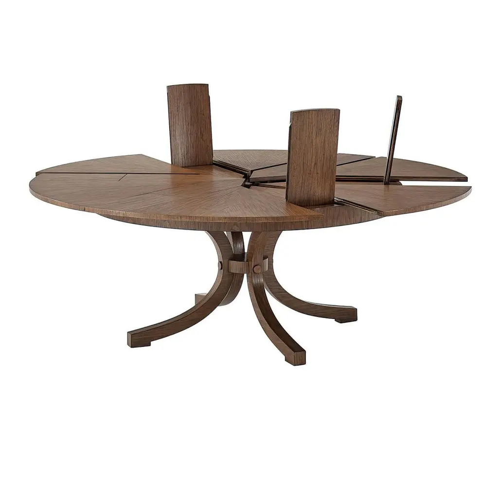 This is a unique European-designed round dining table with six pullout sections and six self-storing fold-out leaves. The table is finished with a warm hewn hazel finish. With 12 leaves, this table seats seven when closed and nine when open.Open dimensions: 78" W x 78" D x 29.5" HClosed dimensions: 60.75" W x 60.75" D x 29.5" H.
