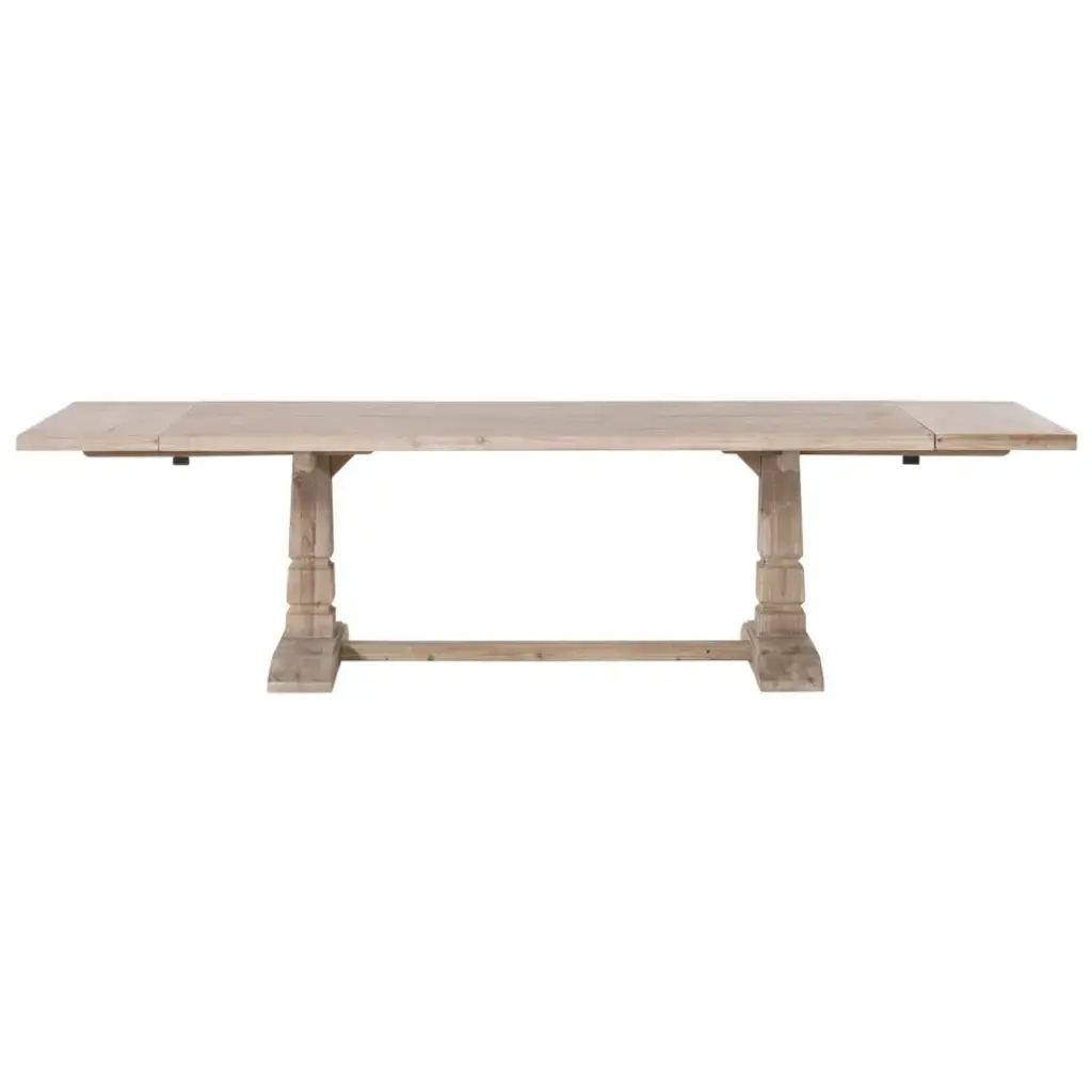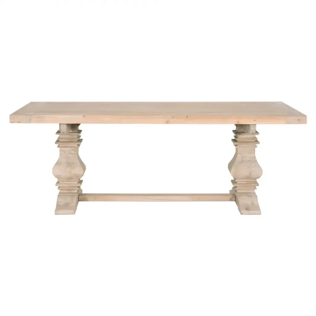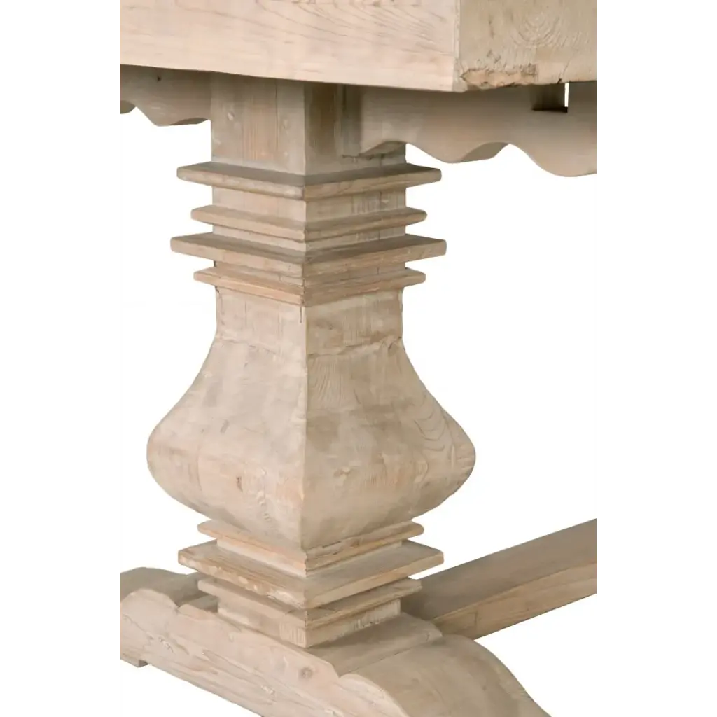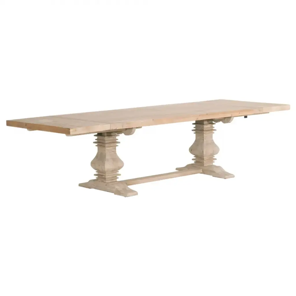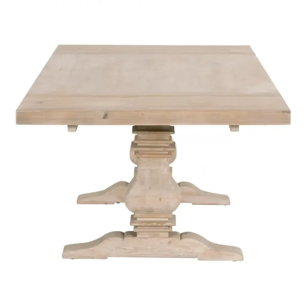 Transitional style dining table featuring Recycled European Pine wood and decorative double pedestal base.