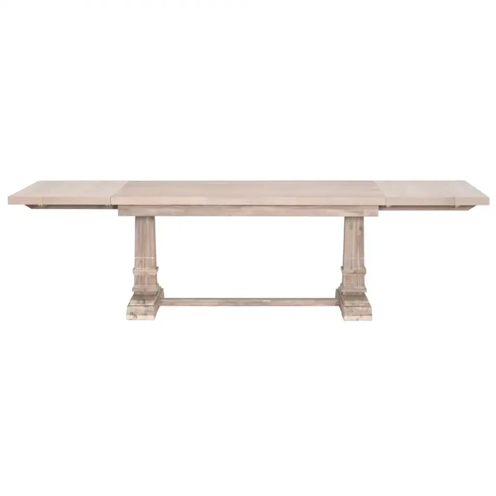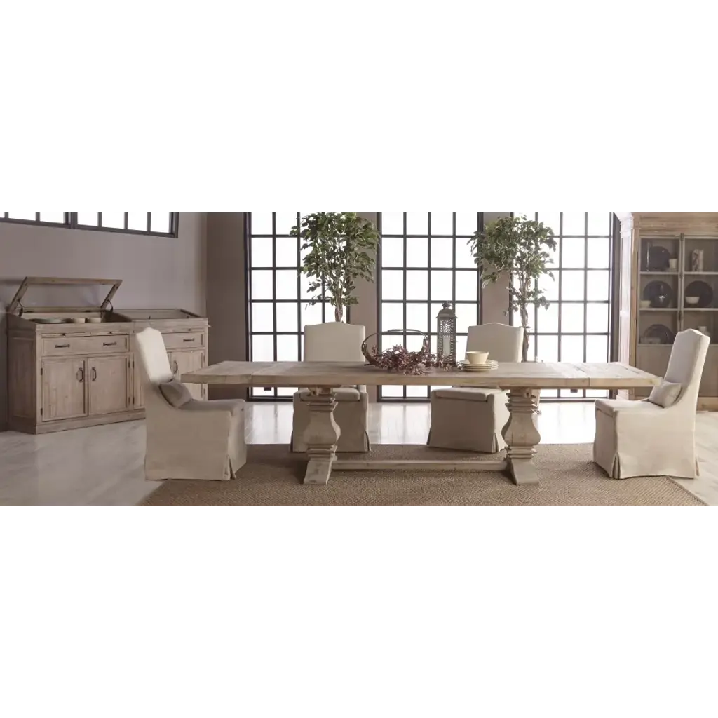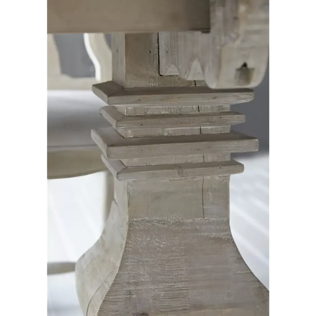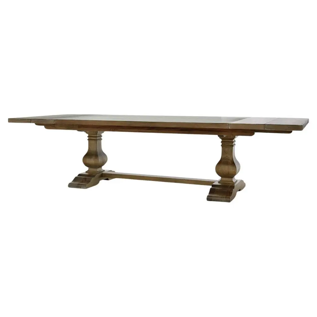 Transitional style dining table featuring Recycled European Pine wood and decorative double pedestal base.