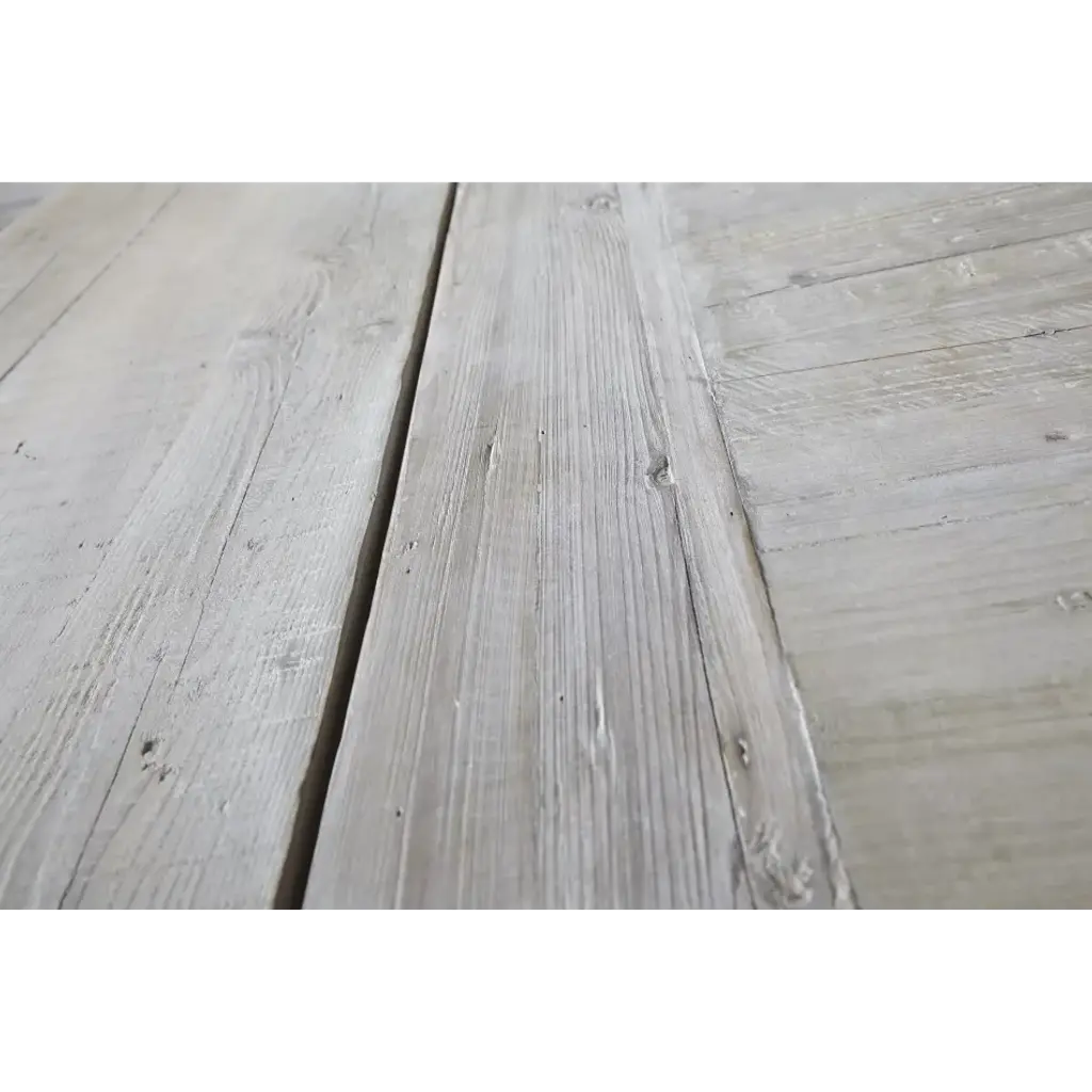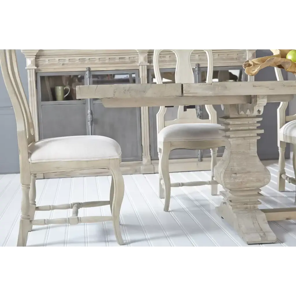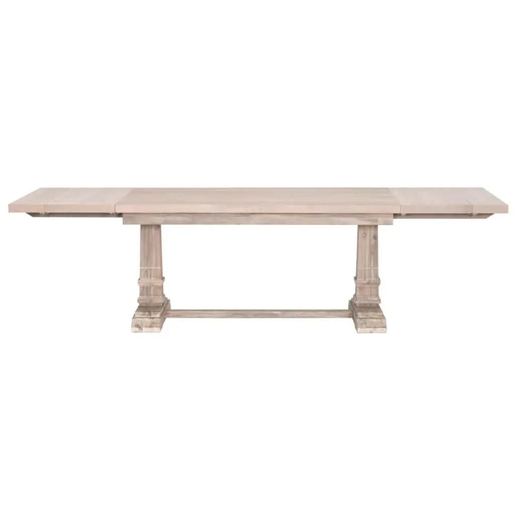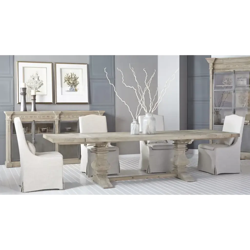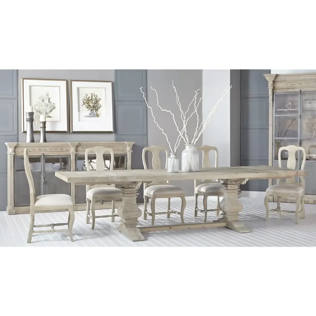 Transitional style dining table featuring Recycled European Pine wood and decorative double pedestal base.