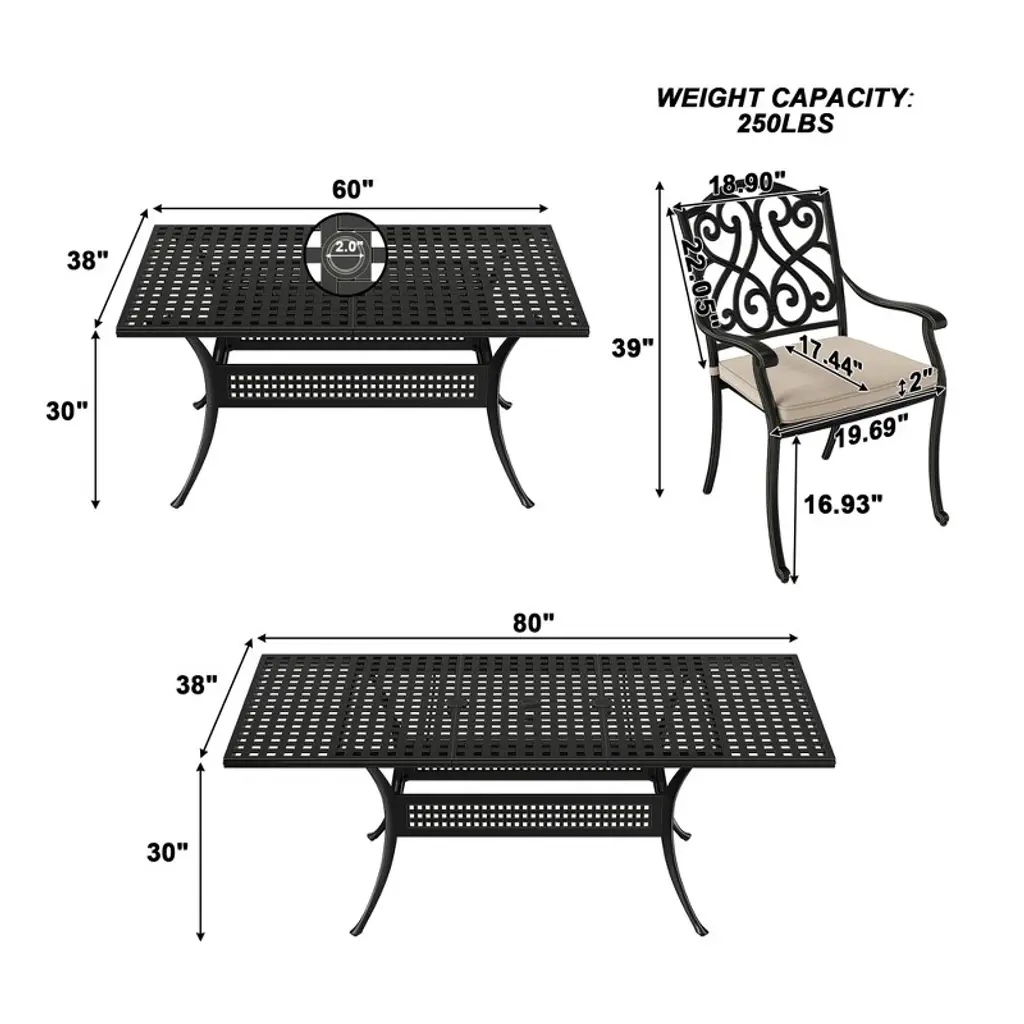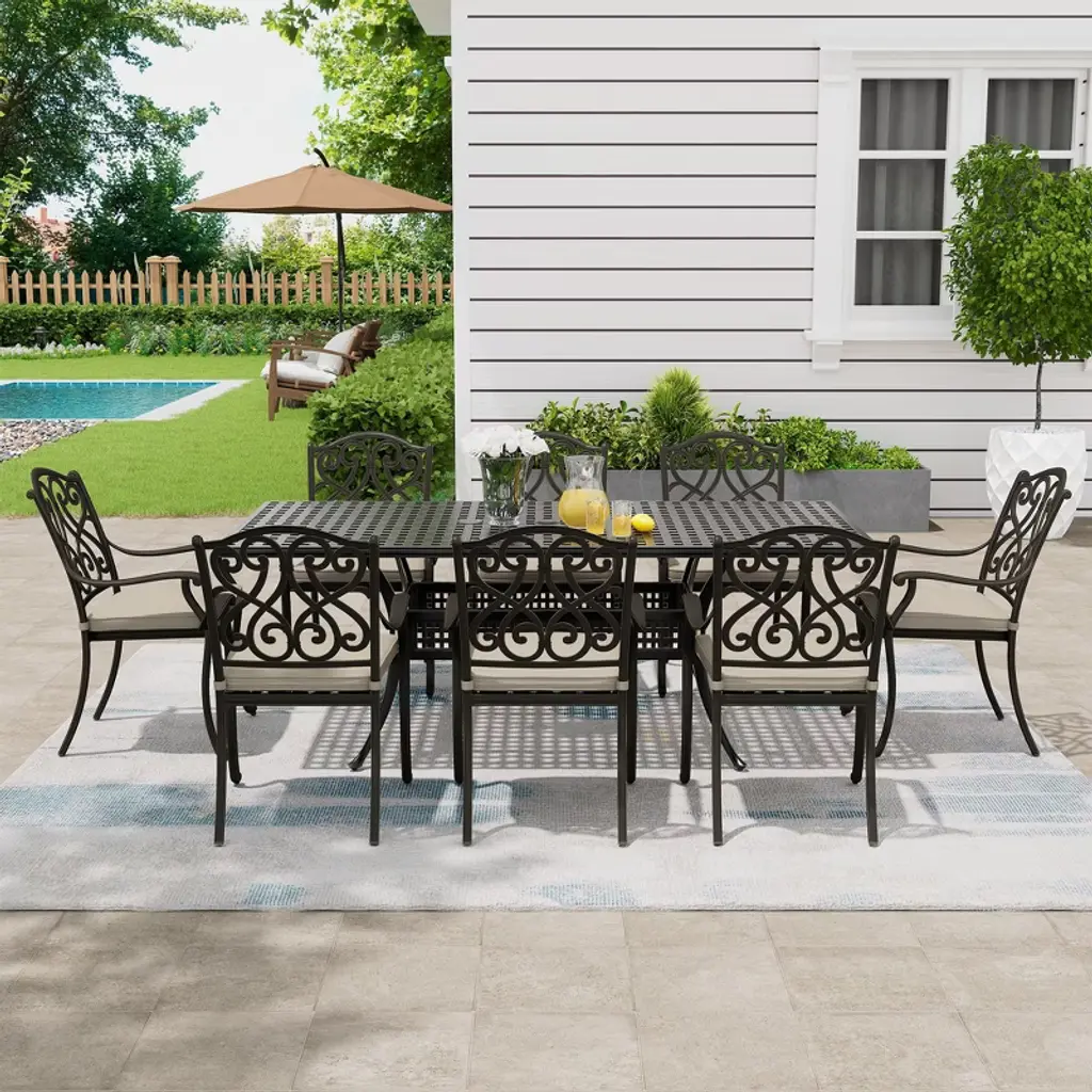 The whole set has wear-resistant, rustproof aluminum framing. The table is equipped with retractable table leaves that can seat up to 8 people when fully extended, and bring each other closer when retracted. 5cm thick seat cushions come in a soft olefin that is stain, mildew, and fade-resistant.