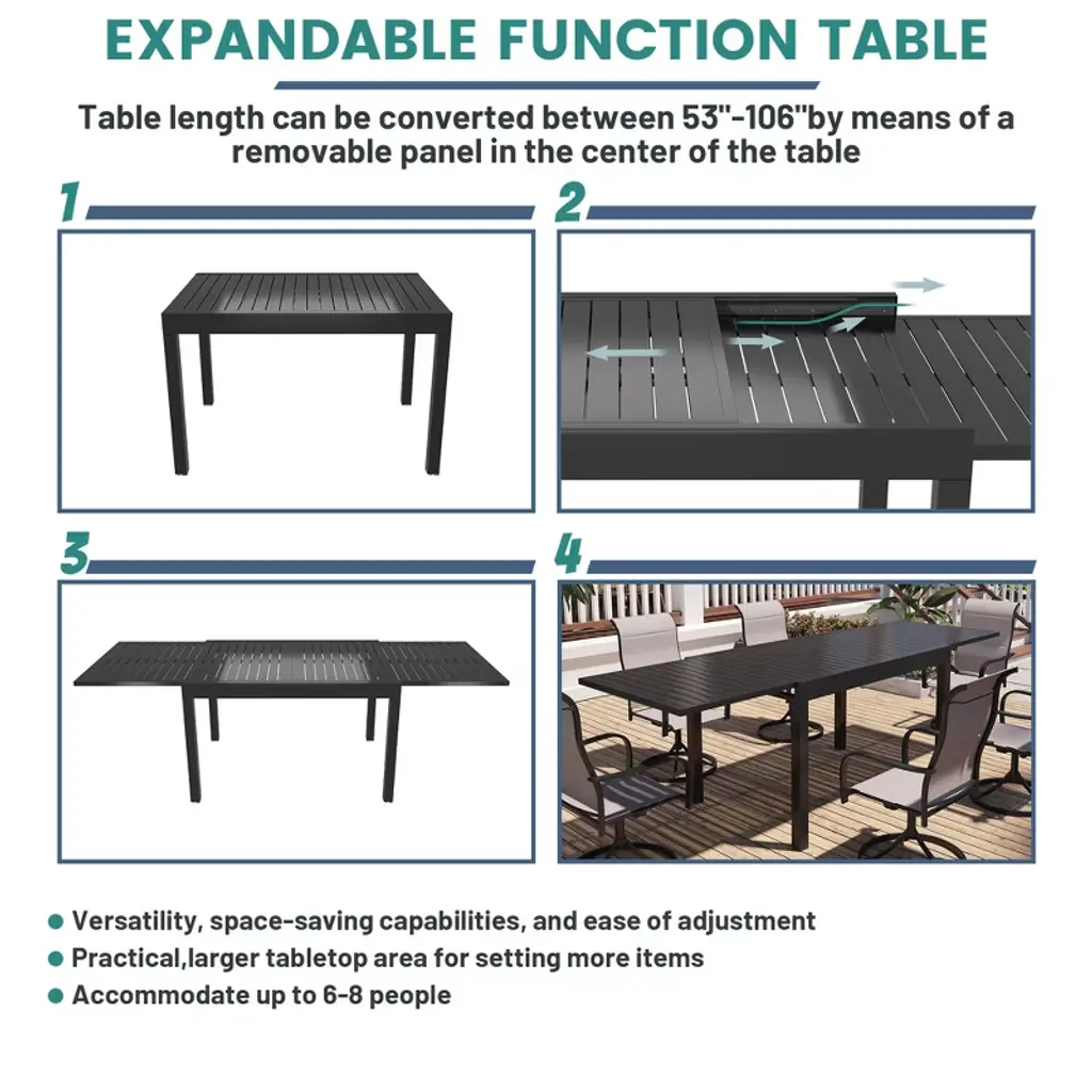 Introducing our versatile dining table, crafted with a durable aluminum frame and electronic coating for long-lasting use. The high-quality black coating is both rust-resistant and weather-resistant, ensuring years of enjoyment. With dual dimensions of 53.1" L x 35.4" W x 29.5" H when stored and 106.3" L x 35.4" W x 29.5" H when unfolded, this table is perfect for both outdoor and indoor use. The expandable design allows you to extend it to seat 6-10 people or shorten it for 4-6 people, optimizing your outdoor space. Featuring a modern leaf design in an elegant black color, it easily complements any patio furniture and suits any occasion. Quick and easy to assemble in 15-20 minutes, this table can be cleaned effortlessly with a damp cloth and water.