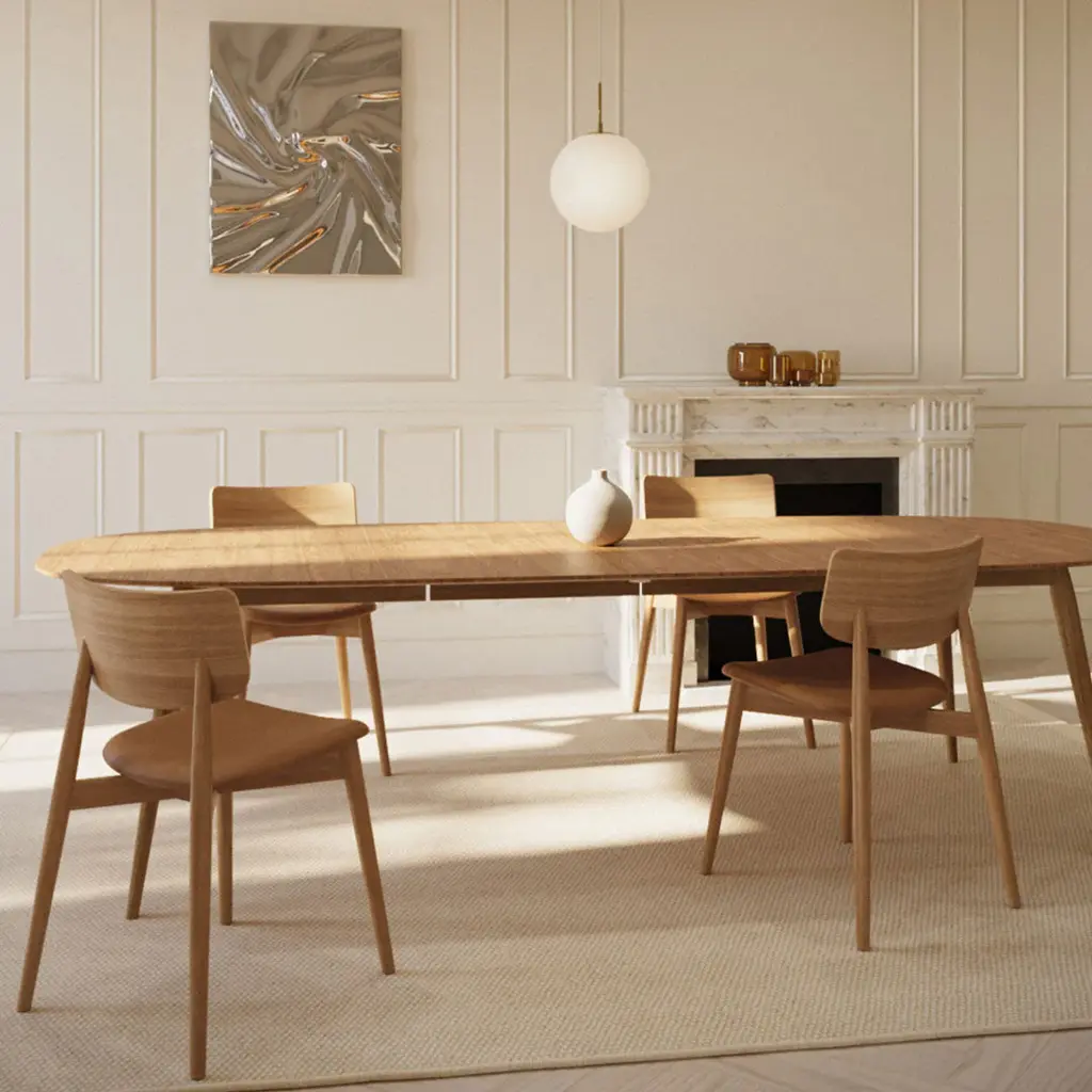 PLAYdinner is the dining table from where there will be laughter, delicious food and memories will be made. Soft curves, robust materials and super Danish craftsmanship ensures the dining table to become more beautiful over time in sync with the soul of the family. The table can fit a simple dinner for two as well as large dinner parties. Extends with up to two additional extraction plates.