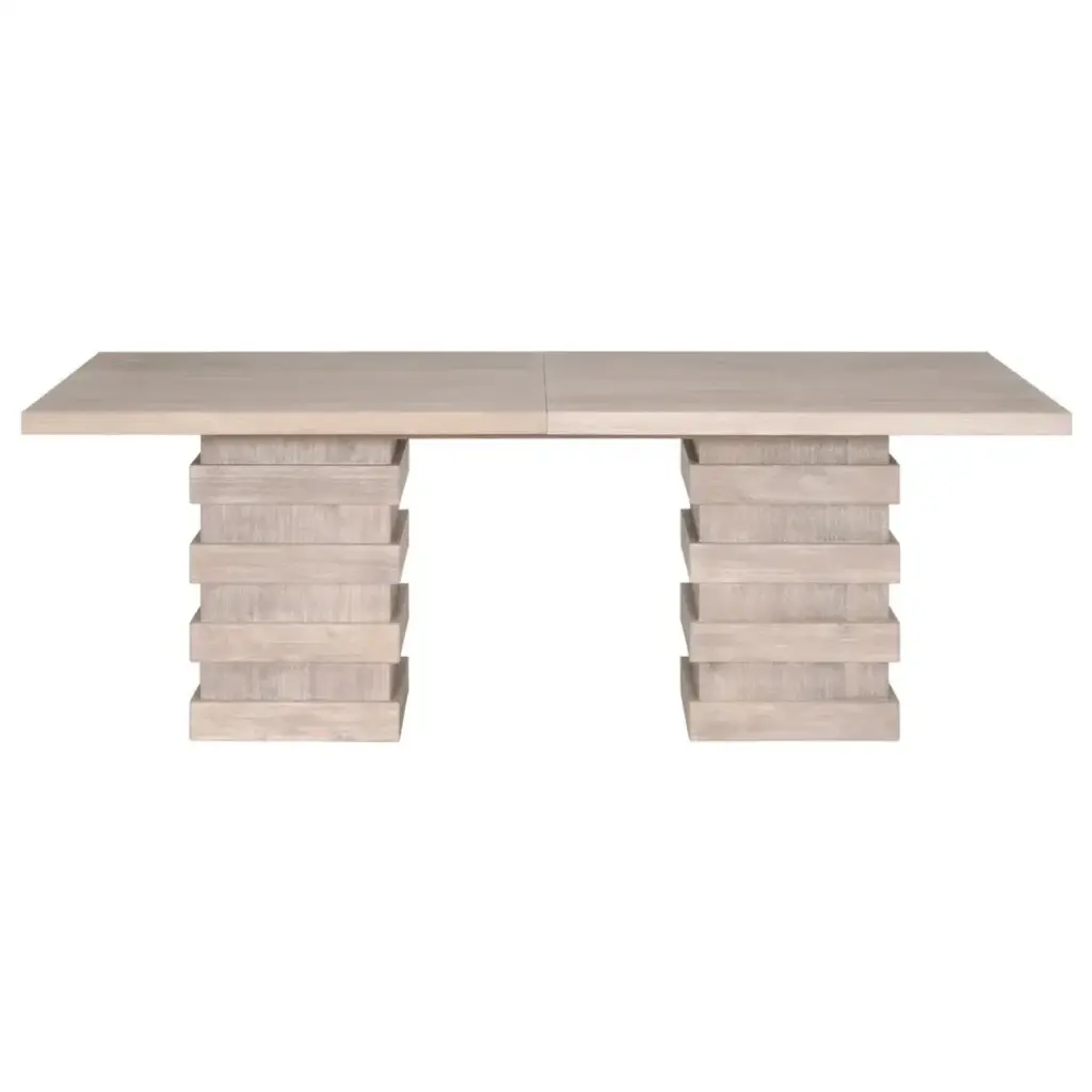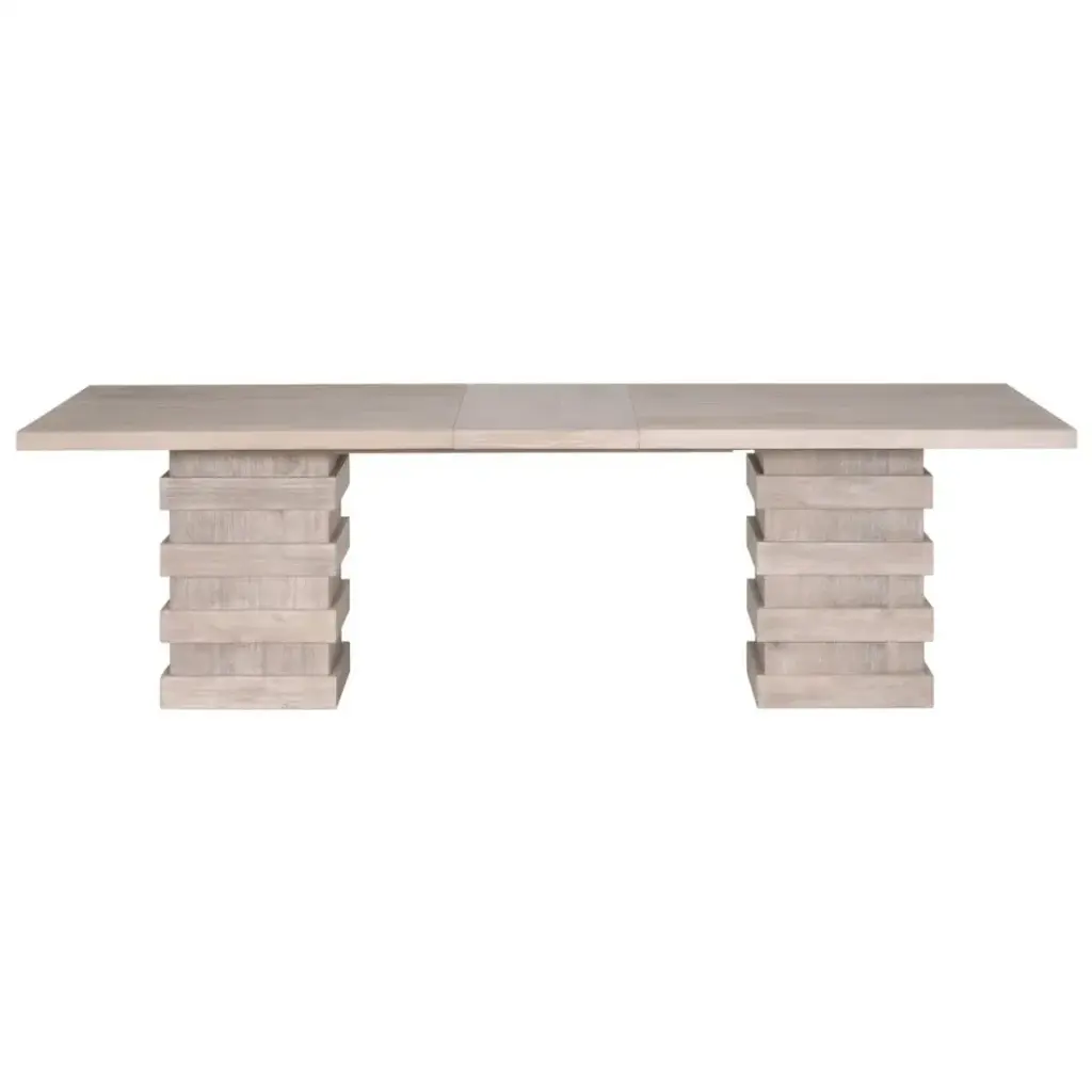 This extension dining table has an alluring and unique composition. Its double pedestal base has a stacked column design that balances the overall look of this table. It is crafted with acacia wood with natural gray undertones and contains two removable extension leaves. The slightly weathered finish paired with the transitional design will look great in a farmhouse, traditional or beachy setting. Comfortably seats up to 10 people with both table leaves inserted.