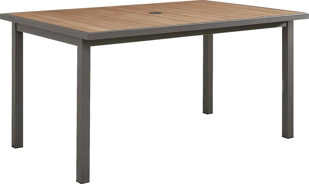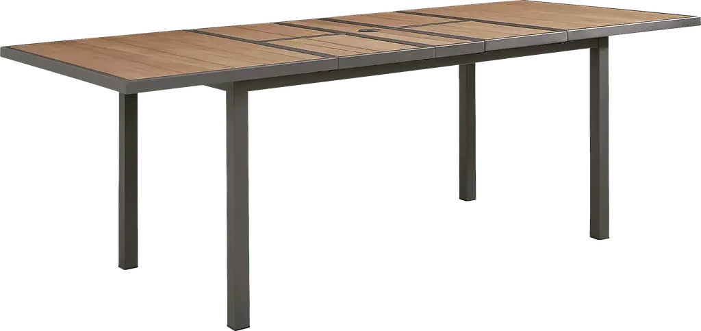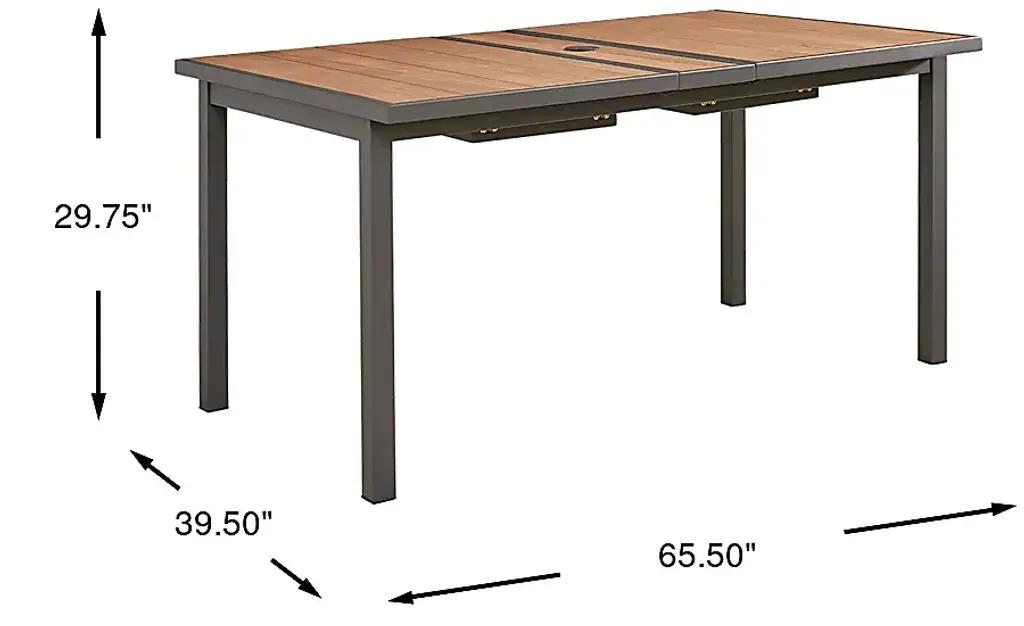 Seaside resort opulence and relaxed backyard barbecue vibes combine with the modern-yet-classic design of the Randolph collection. This dining table features an aluminum frame in gray with a unique asymmetric slat tabletop in brown. The top extends from 65.50" to 95" to accommodate more guests as needed. A convenient umbrella hole provides the option to add a sunshade if desired. An umbrella hole in the center of the table can be capped when not in use.