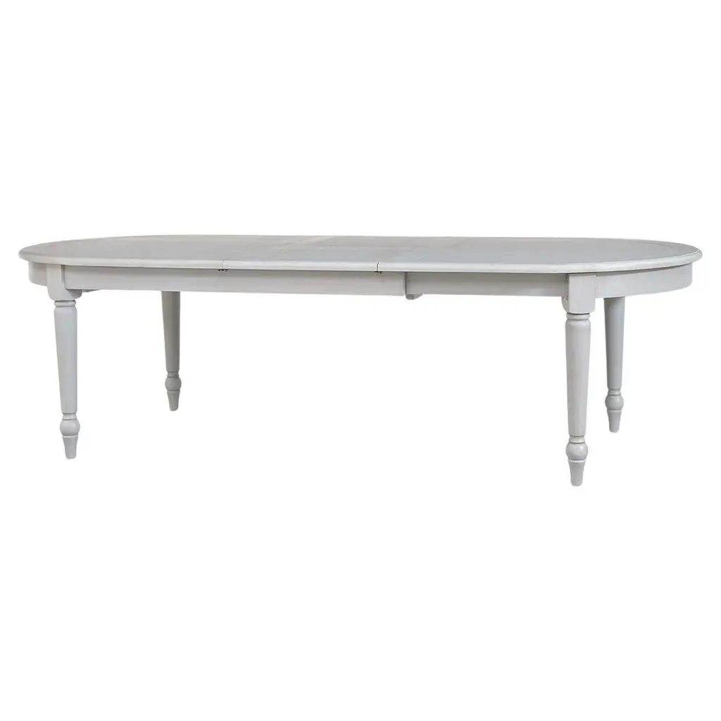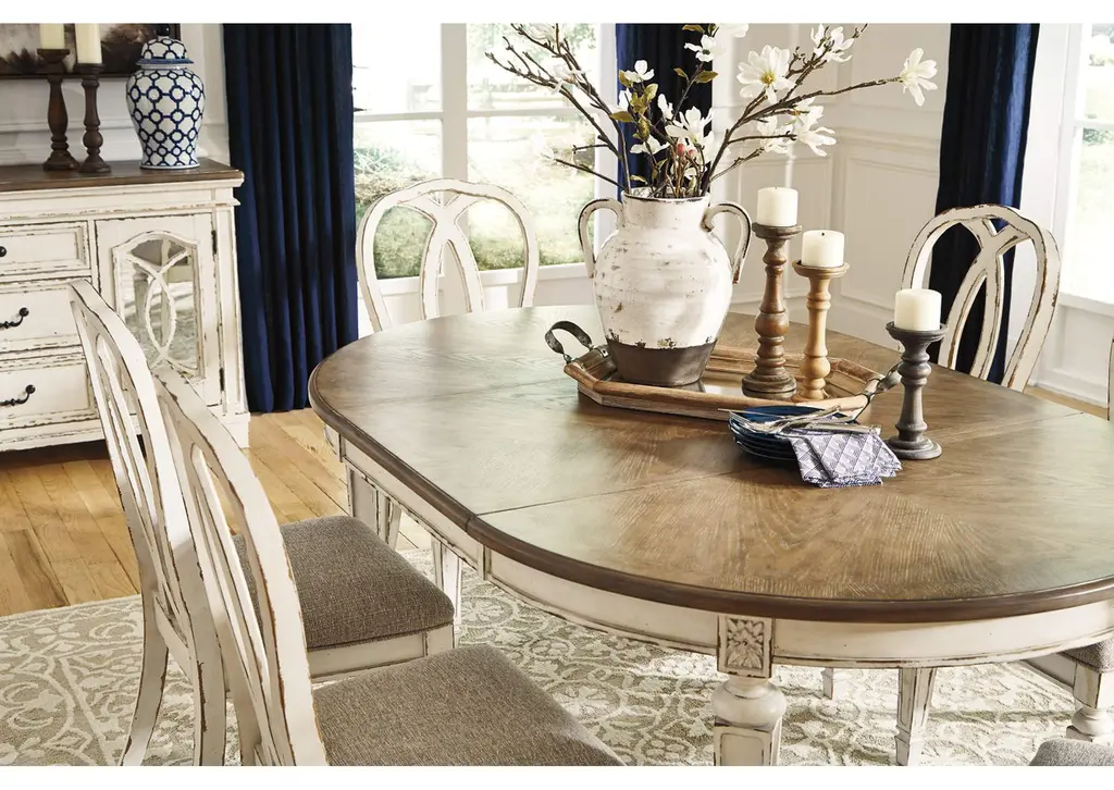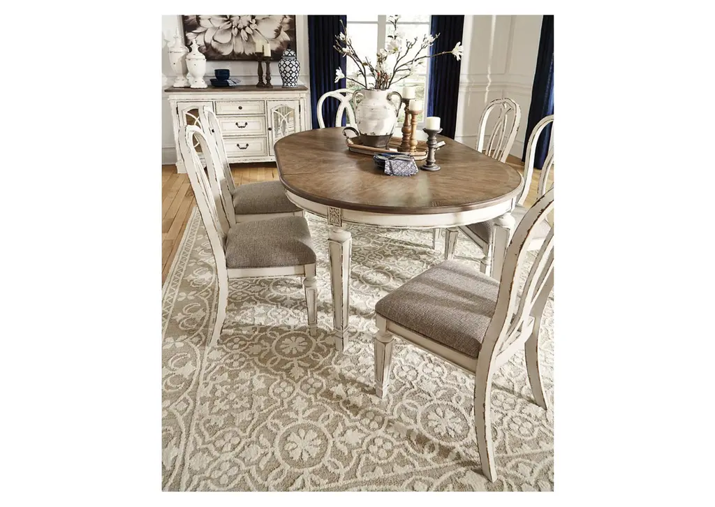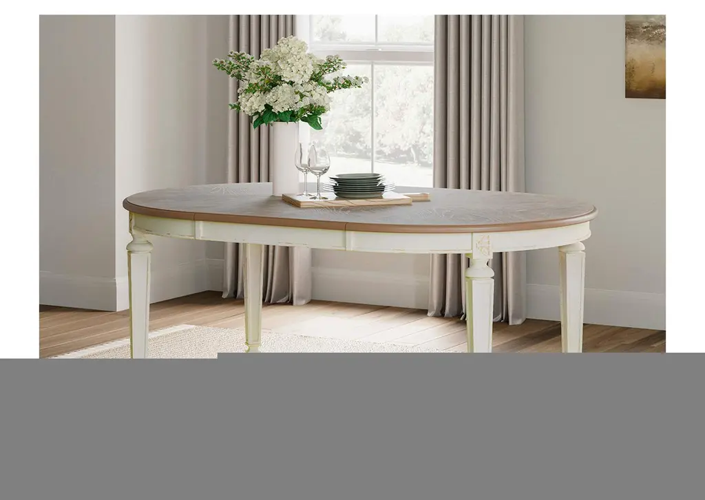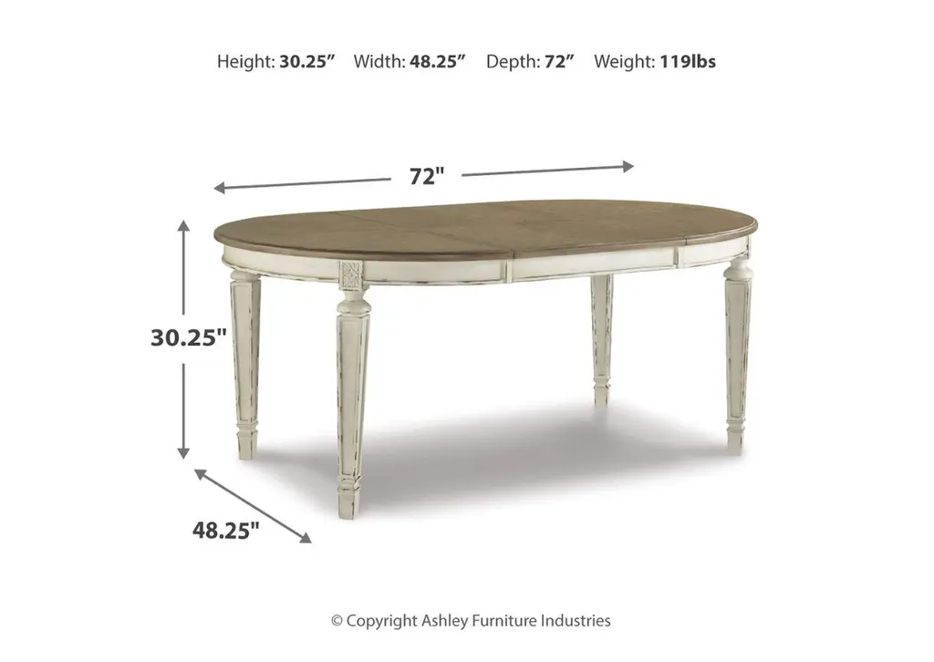 Bon appétit. The Realyn dining room extension table has all the right ingredients for a French country-inspired feast for the eyes. Drop-in leaf allows you to transform an intimate round dining table into a gracious oval dining table that comfortably seats six. Antiqued two-tone aesthetic pairs a chipped white with a distressed wood finished top for a double serving of charm. Weight 119.000 lbs. (53.55kgs.)