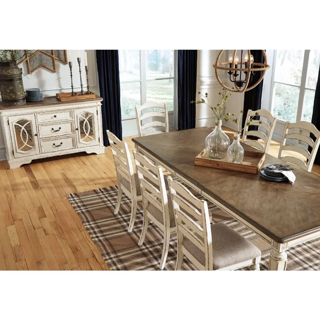 Bon appétite. This dining room extension table has all the right ingredients for a French country-inspired feast for the eyes. Antiqued two-tone aesthetic pairs a chipped white with a distressed wood finished top for a double serving of charm. Drop-in leaf allows you to comfortably accommodate eight. Signature Design by Ashley is a registered trademark of Ashley Furniture Industries, Inc.