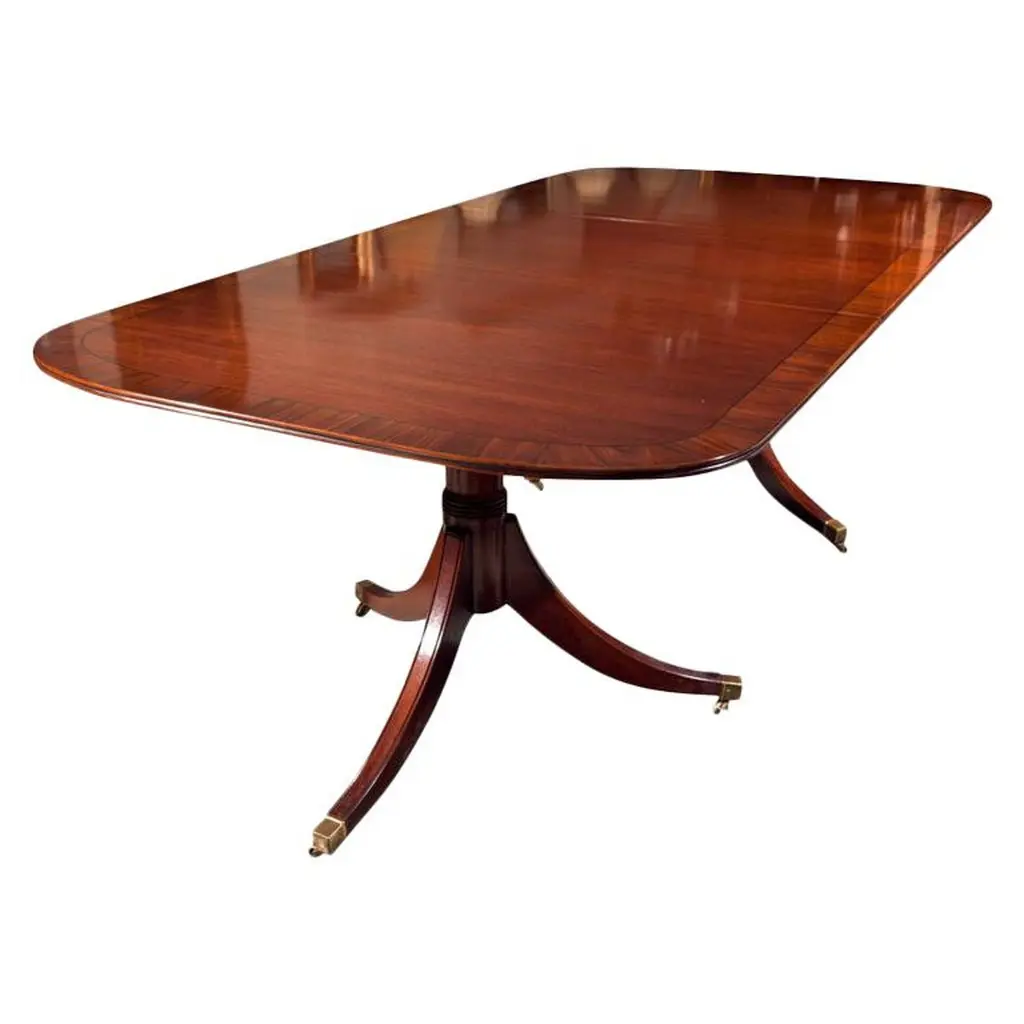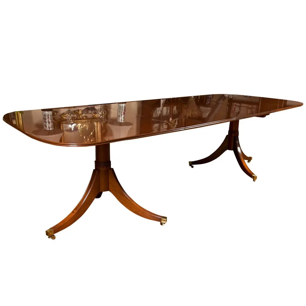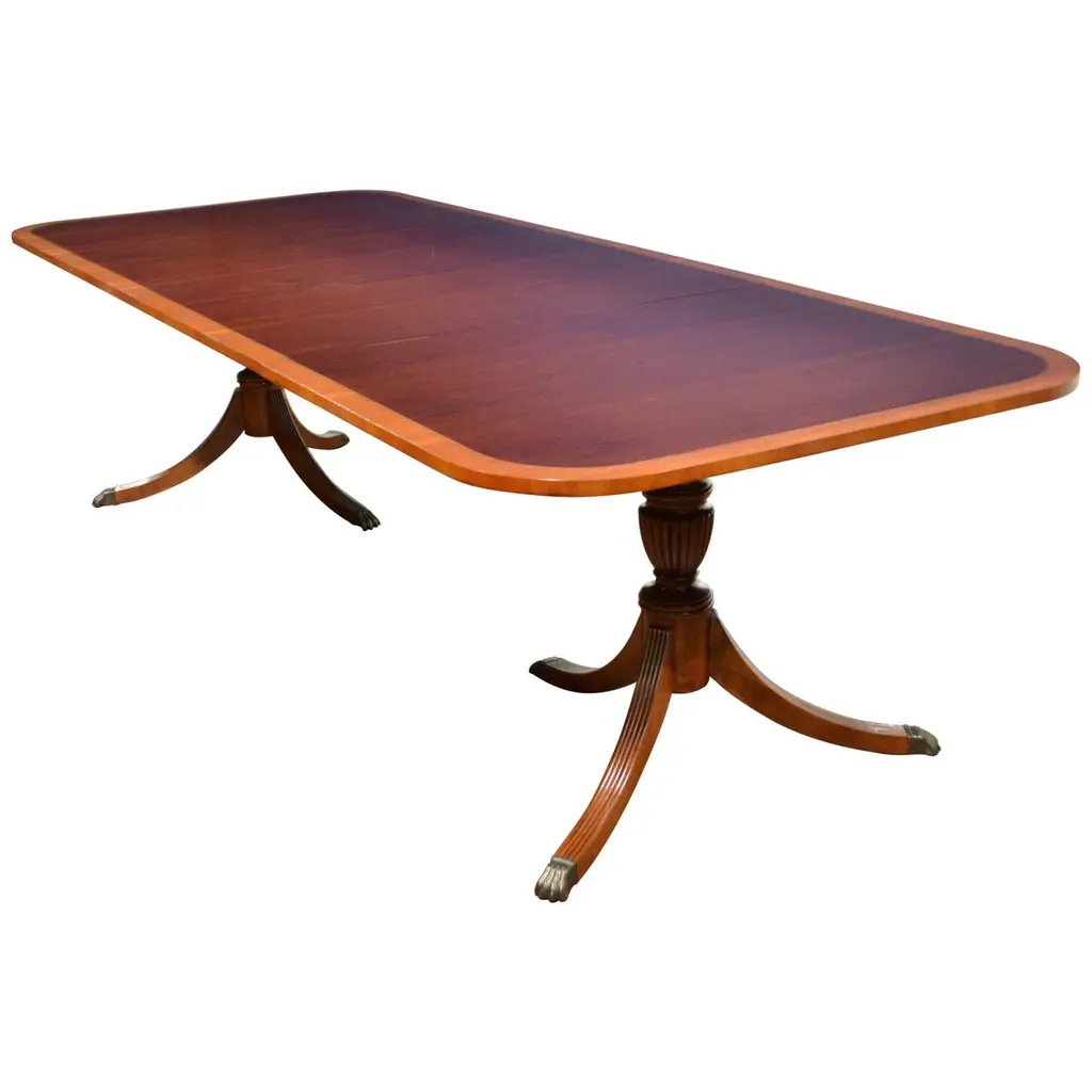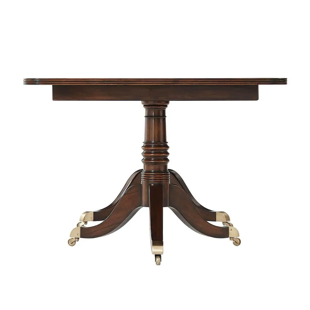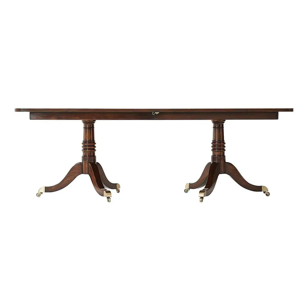 An English Regency style figured mahogany veneered dining table, the rectangular reeded edge and satinwood banded top extending to accommodate one additional leaf, on two gun-barrel turned column pedestals with down swept legs terminating in brass cappings and castors. Inspired by a Regency original.Dimensions: 110" W x 42" D x 30" HClosed: 88" W, 1-22" leaf.Clearance: 26.5".