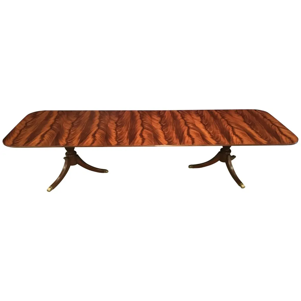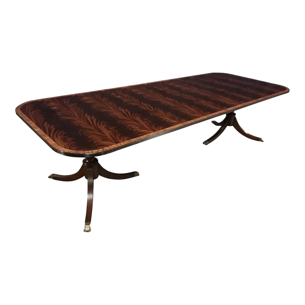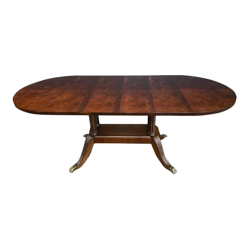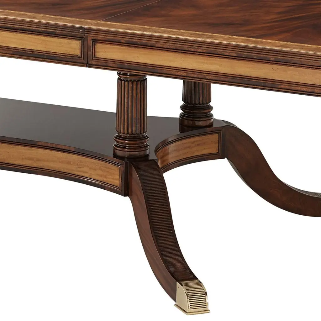 A mahogany, figured mahogany veneered and crossbanded extending dining table, the rectangular top opening to accommodate two additional self-storing leaves, the paneled satinwood veneered frieze above a bold base of four turned reeded columns on a platform base issuing four out swept legs with brass cappings. Inspired by a Regency original.Dimensions: 132" W x 54" D x 30" HClosed: 84" W2 24" leavesClearance: 25.75"