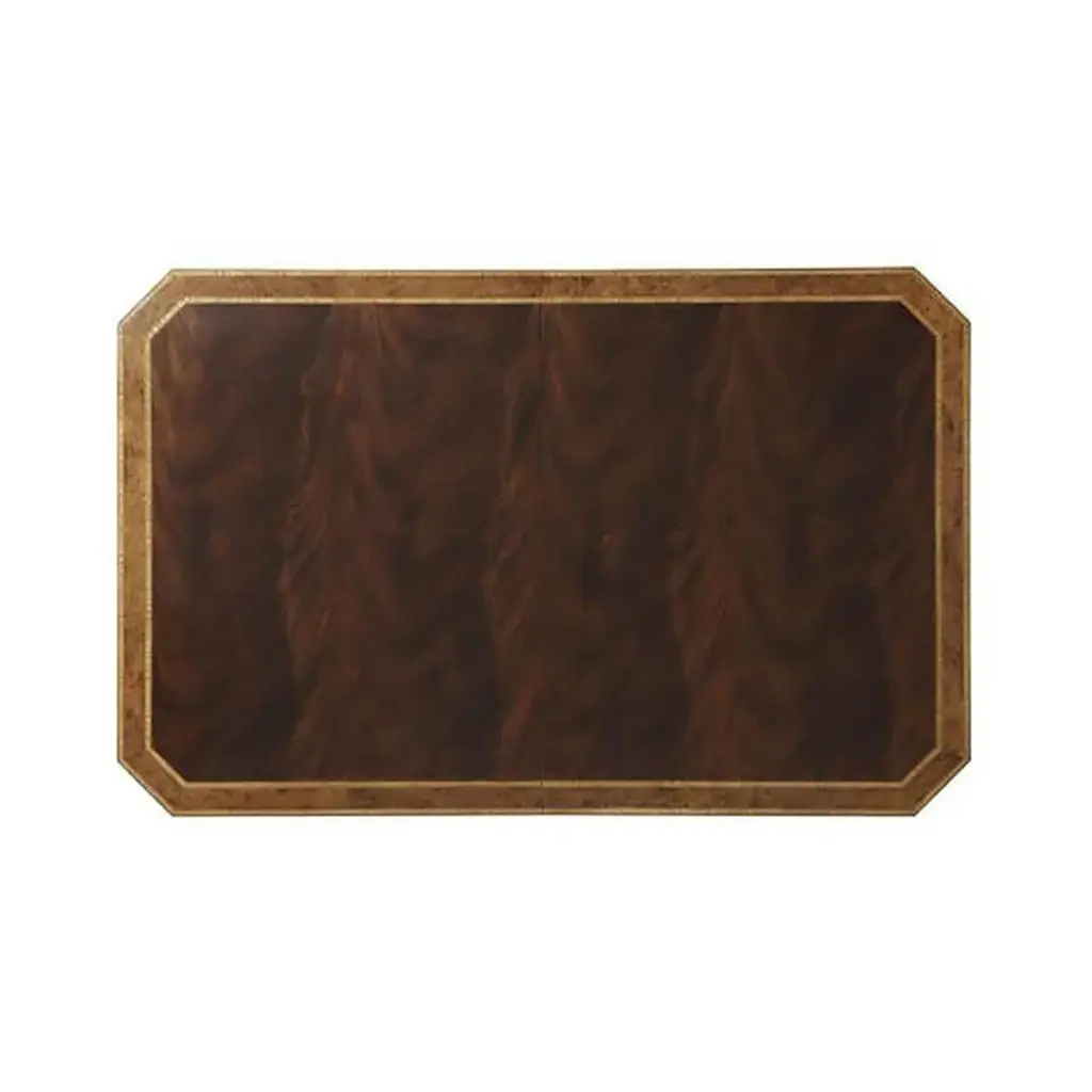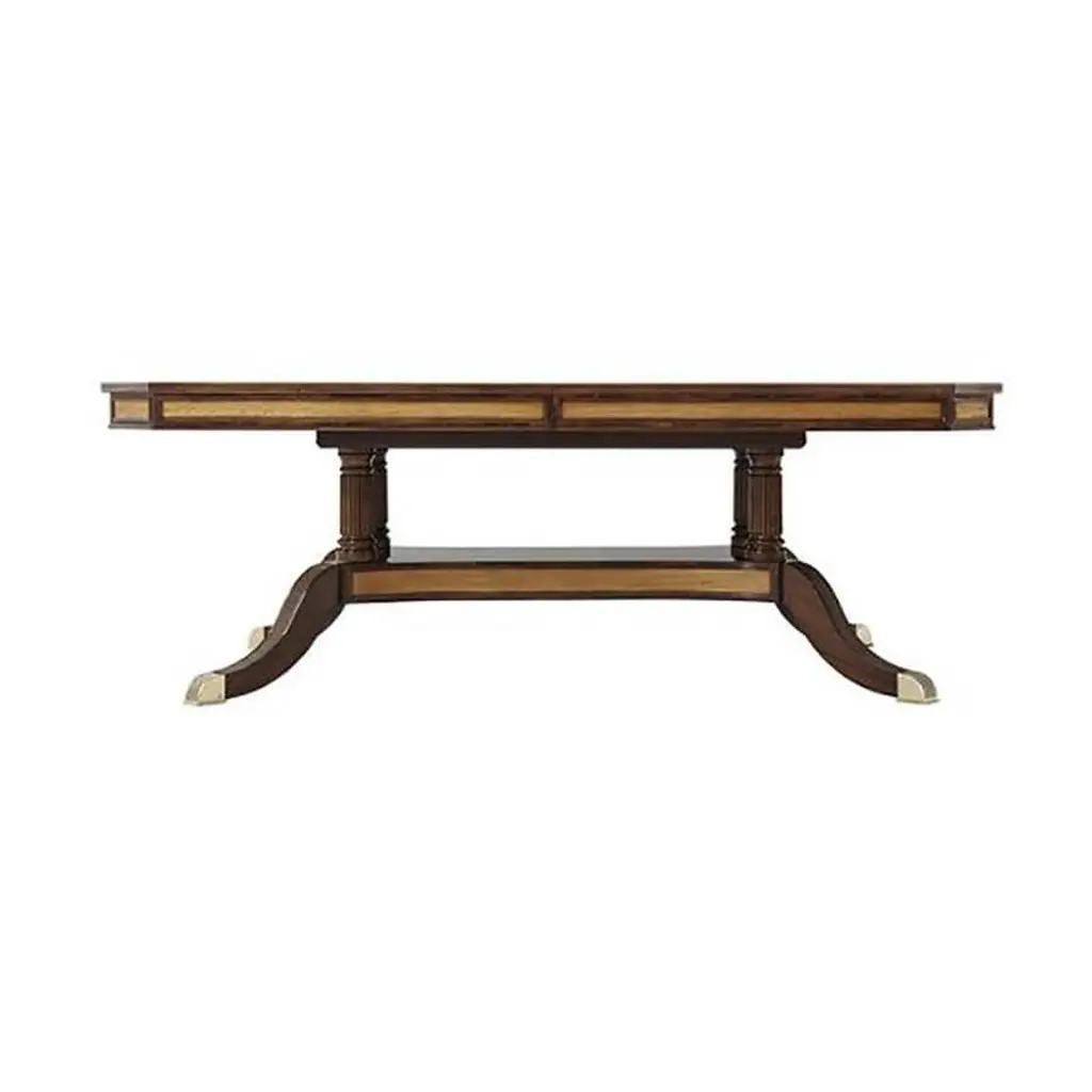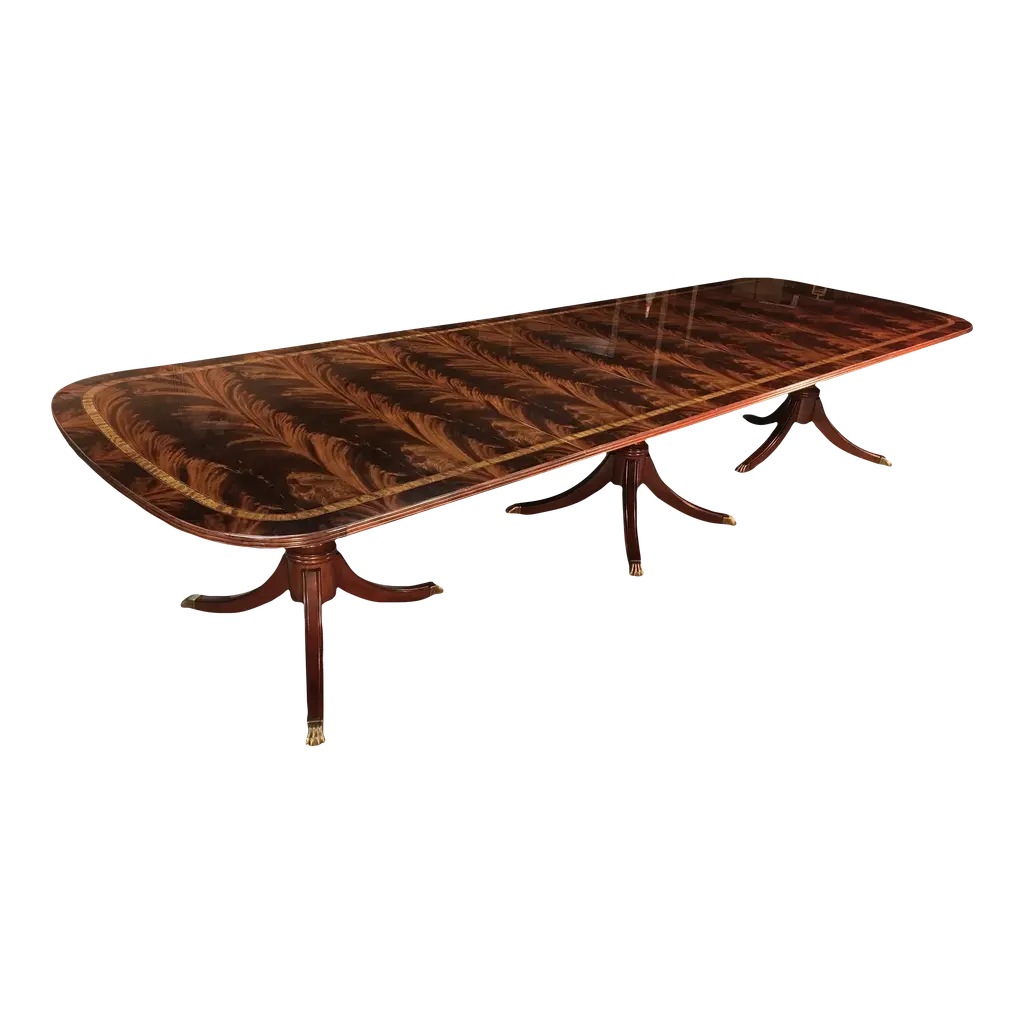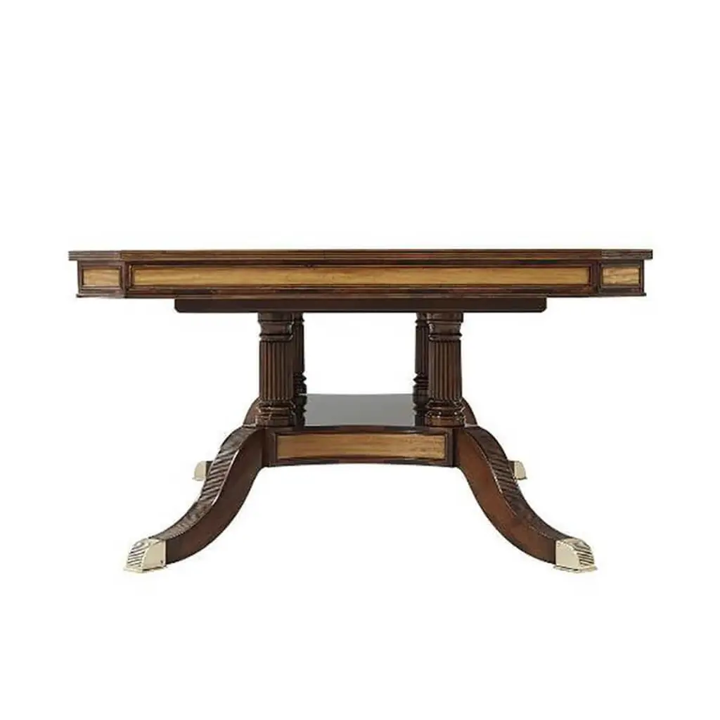 A mahogany, figured mahogany veneered and crossbanded extending dining table, the rectangular top opening to accommodate two additional self-storing leaves, the paneled satinwood veneered frieze above a bold base of four turned reeded columns on a platform base issuing four out swept legs with brass cappings. Inspired by a Regency original.Dimensions: 132" W x 54" D x 30" HClosed: 84" W2 24" leavesClearance: 25.75"