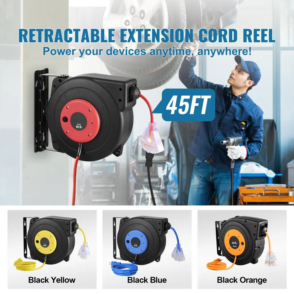 Heavy Duty Cord Reel: For 30FT option: Ready for any challenge, our 16AWG/3C SJTOW cables are built to resist water, oil, acid, alkali, and ozone. Our retractable extension cord reel features a high-quality PP case, 30 ft extension cord, and 4.5 ft lead-in cord, rated for 10A / 125V / 1250W. For 45FT options: 12AWG/3C SJTOW cables, 45 ft extension cord, rated for 15A / 125V / 1875W. For 50FT options: 14AWG/3C SJTOW cables, 50 ft extension cord, rated for 13A / 125V / 1625W. For 65FT option: 12AWG/3C SJTOW cables, 65 ft extension cord, rated for 15A / 125V / 1875W. For 75FT option: 14AWG/3C SJTOW, 75 ft extension cord, rated for 13A / 125V / 1625W. For 80FT options: 12AWG/3C SJTOW cables, 80 ft extension cord, rated for 15A / 125V / 1875W. Power up and reach further than ever! Choose from 4 vibrant colors to match your style! Lighted 3-Outlet Transparent Socket: Upgrade your power setup with this grounded 3-outlet socket, designed to power multiple devices at once. The built-in indicator light glows when the socket is powered on, ensuring you're always ready to go. It efficiently maximizes both power strips and wall outlets for added convenience. Overload Protection for Peace of Mind: Rigorously tested for electrical security, breaker lifespan, and on/off functionality, our retractable extension cord reel shields your devices from short circuits and overloads. Automatically cuts power if usage exceeds 10A (for 30FT option) / 15A (for 45FT / 65FT / 80FT options) / 13A (for 50FT / 75FT options), ensuring secure operation of your power tools. Simply press the reset button to restore power and keep working! Automatic Retractable System: Enjoy hassle-free cable control with our advanced auto-retract system. Featuring an advanced cord stopper, you can easily adjust the cable length and avoid annoying tangles. The inner coil spring is increased by 1 turn, improving the elasticity. Enjoy smooth retraction every time! Versatile and User-Friendly: This retractable cord reel is designed for easy installation on walls or ceilings, featuring a 180° swivel bracket for effortless access from any direction. Enjoy the convenience of smooth cable extension and retraction, while keeping your workspace organized and free from tangled cords and trip hazards. Package Content 1 x Retractable Extension Cord Reel 1 x Set of Screws 1 x User Manual