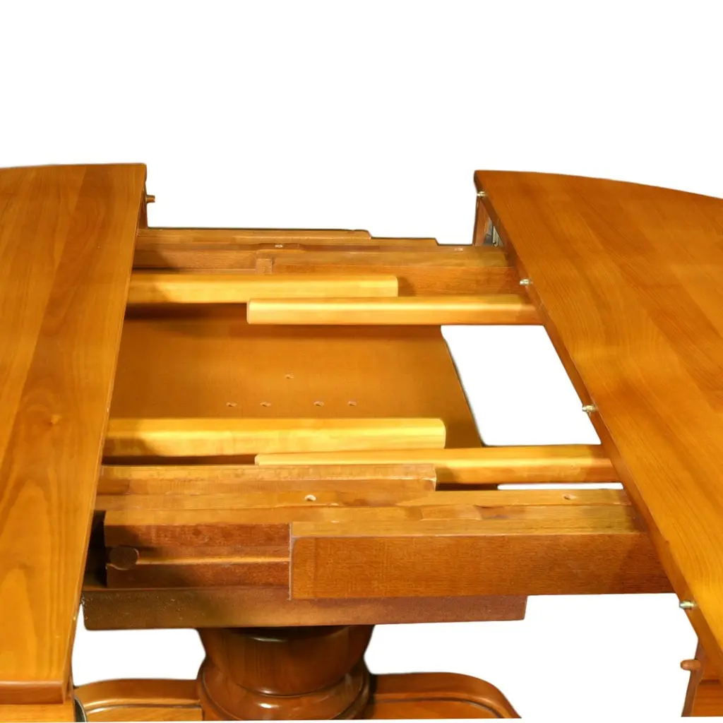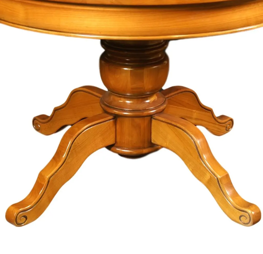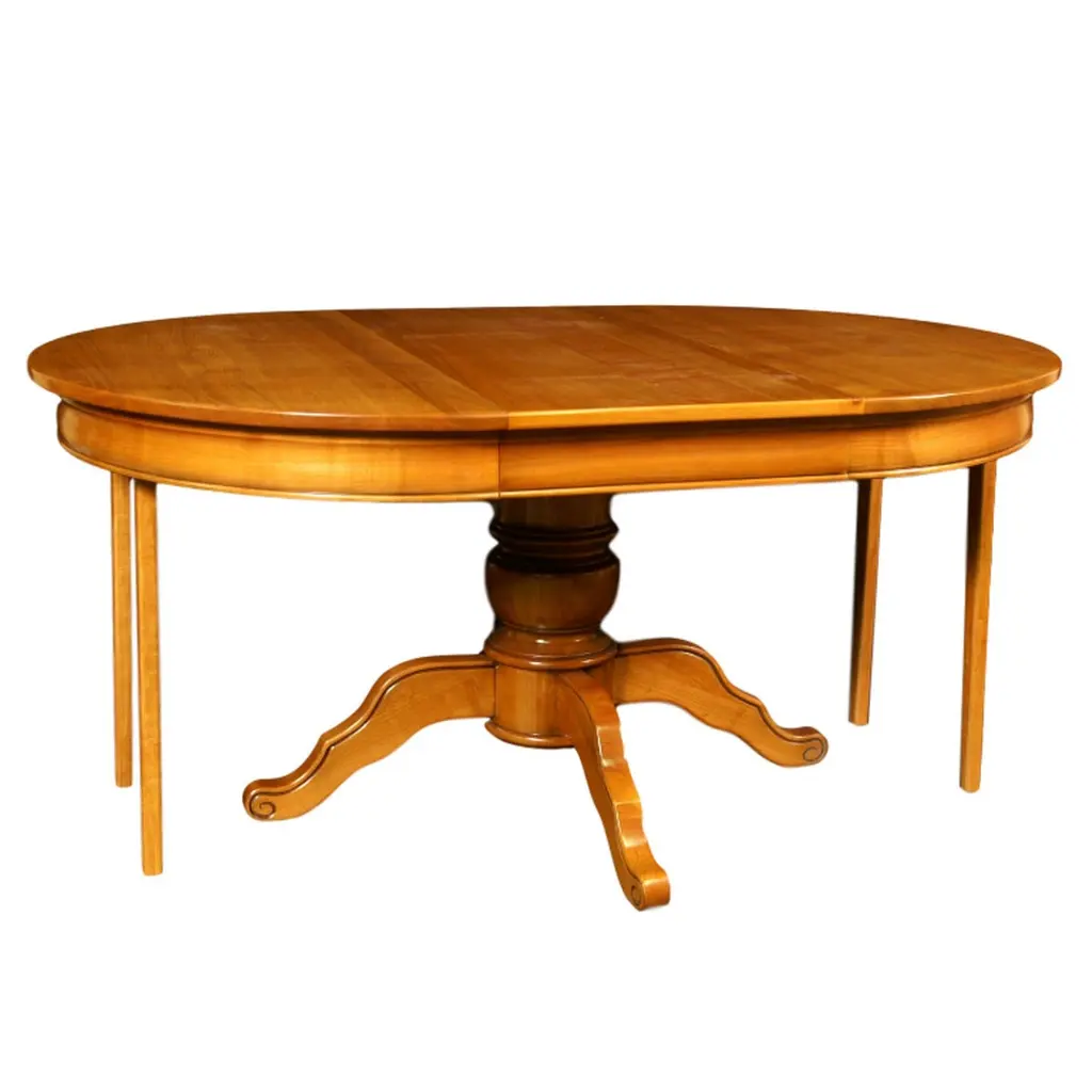 This dining round table is made of French solid Cherry and is typical of the Louis-Philippe period, mid-19th century with its hand-turned central foot.2 Service extensions of 50 cm / 19.7'' each are provided. The first extension is made with a belt. The total length including the 2 leafs is 210 cm / 82.7'''the height between the floor and the skirt is 63 cm / 24.8''2 extra feet shall be deployed to support the extensions.The presented Finish is our "D" home-made Cherry stain. GONTIER, a brand of MON PETIT MEUBLE FRANCAIS group, provides you exclusively with 100% made in France furniture.The sourcing of the solid wood comes from sustainably managed French forestsThe manufacture of each furniture is made accordingly to traditional French techniques of woodworking by small craft workshops in the western countryside of France: Loire and Bretagne.We offer a 5 year warranty on each piece of furniture.