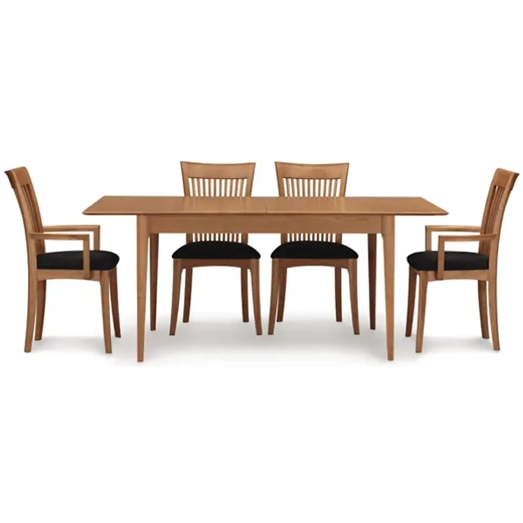 Versatile style is paired with versatile functionality in the Copeland Furniture Sarah Four Leg Extension Table. Made entirely out of high-quality solid cherry wood, this sleek, Shaker-inspired table can be extended two feet with one hand. It includes an integral butterfly leaf that moves smoothly into place at the center of the table on ball bearing extension glides.