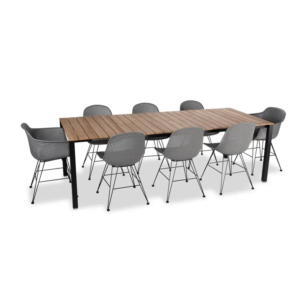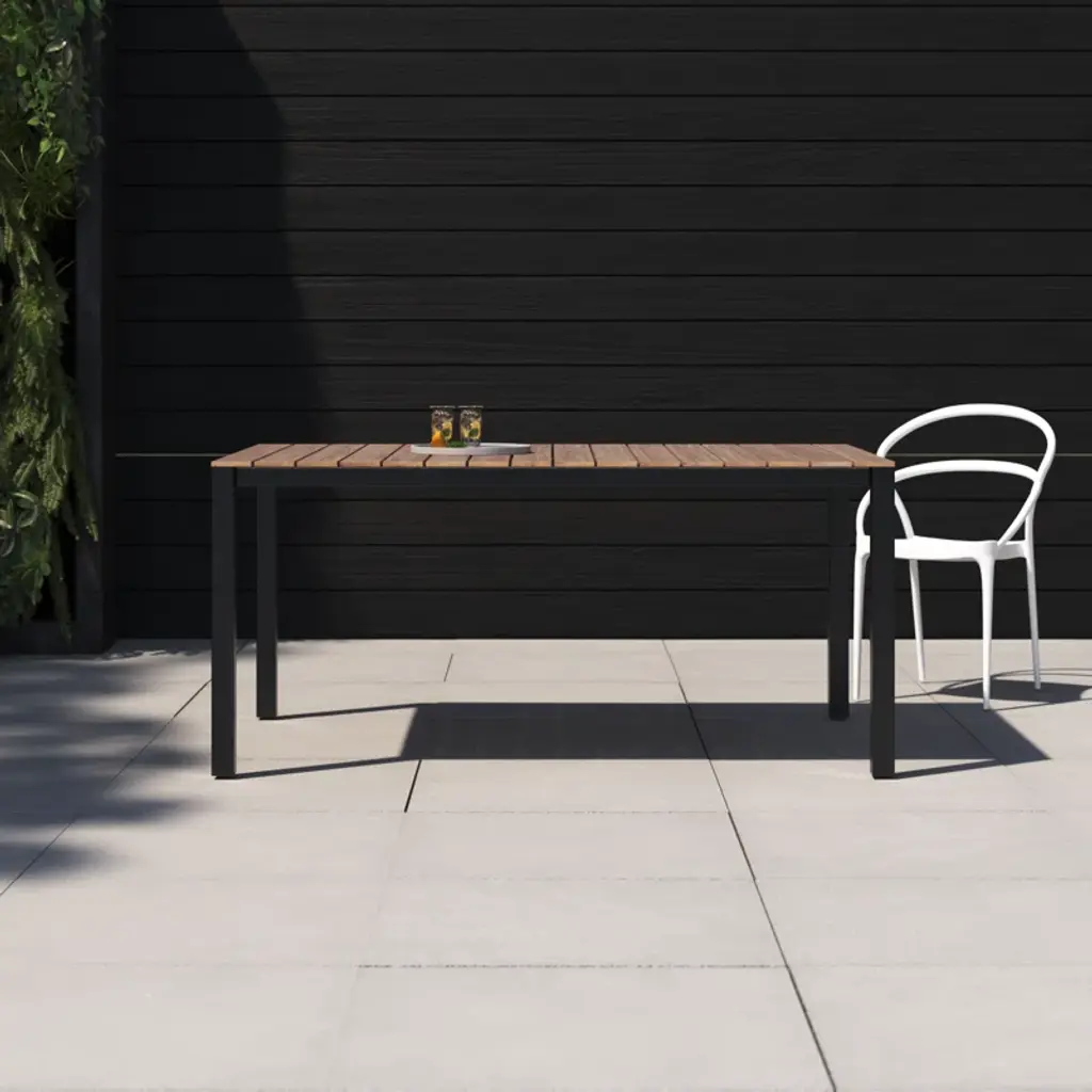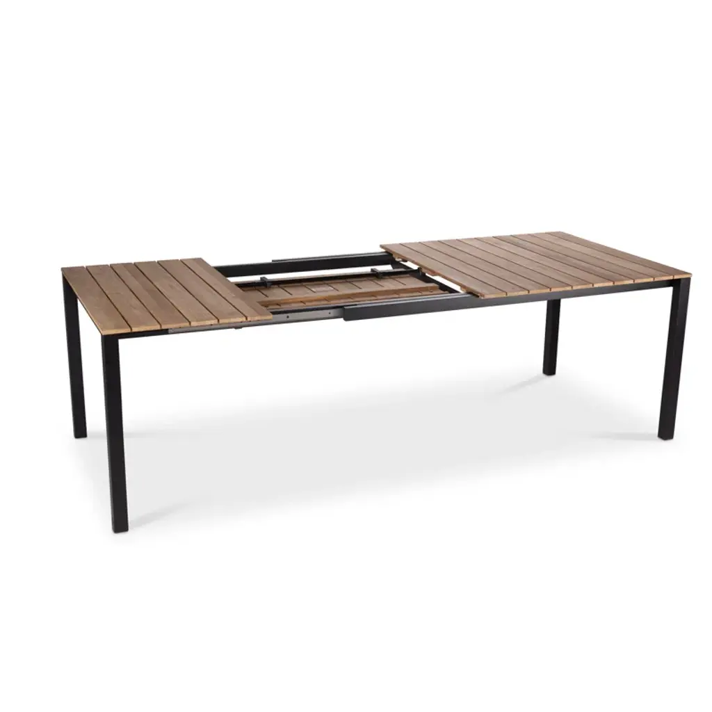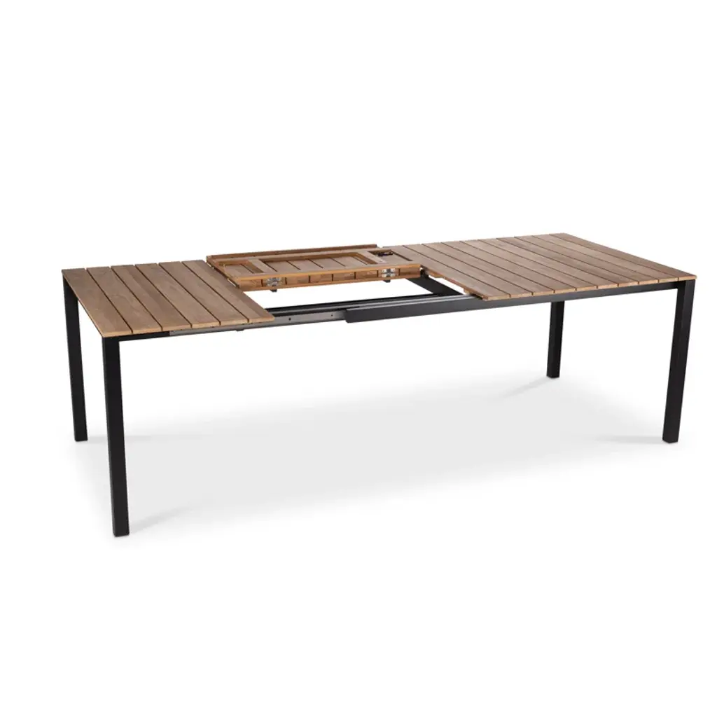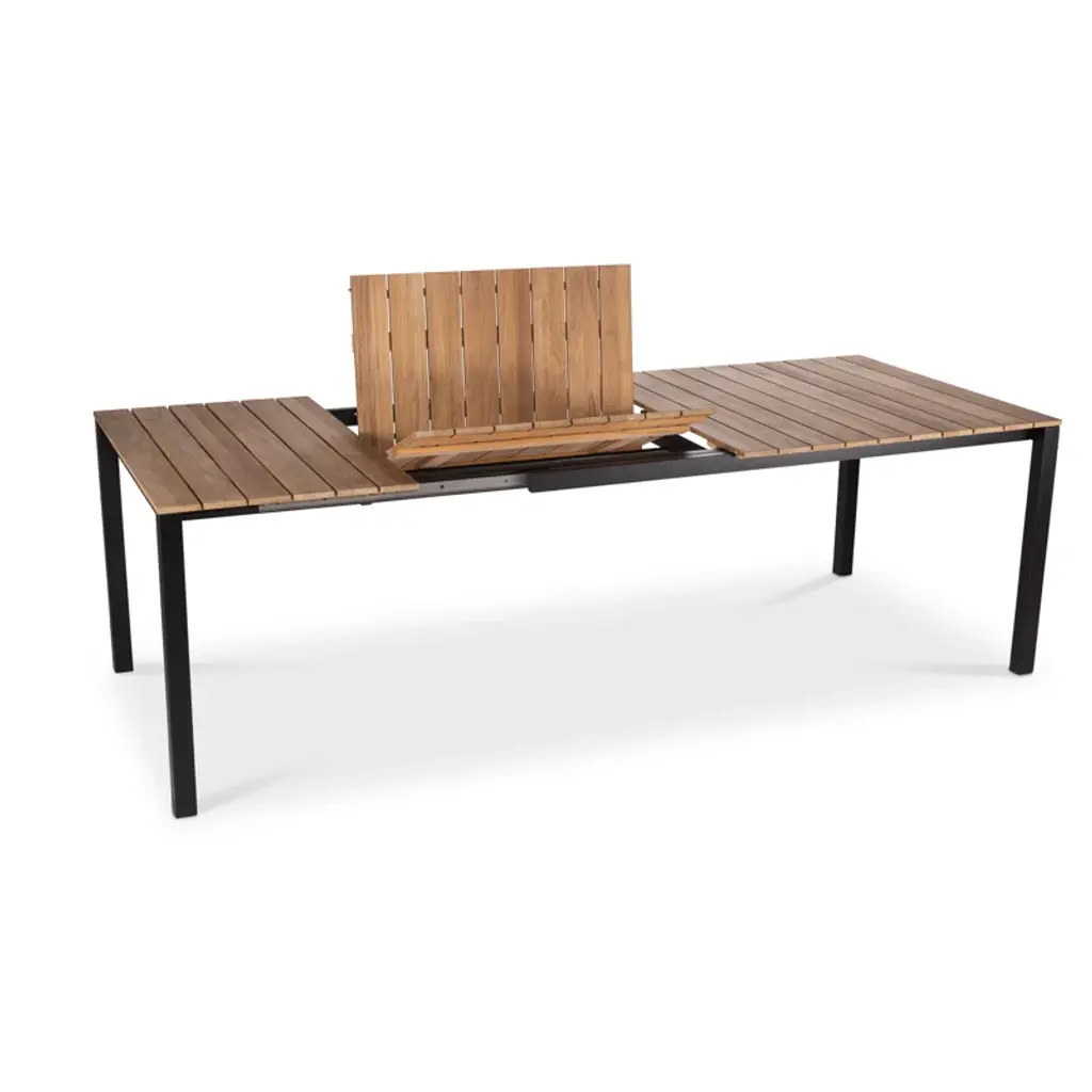 This Sasha Extension Dining Table Extends from 63" to 94" long. This beatiful teak top table offers both versatility and style. With a 4 legged black frame stainless steel base, this extension table is sure to satisfy your outdoor dining needs.