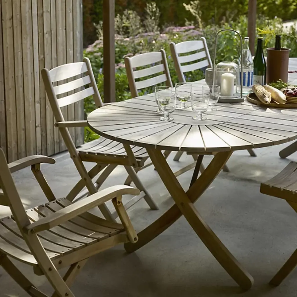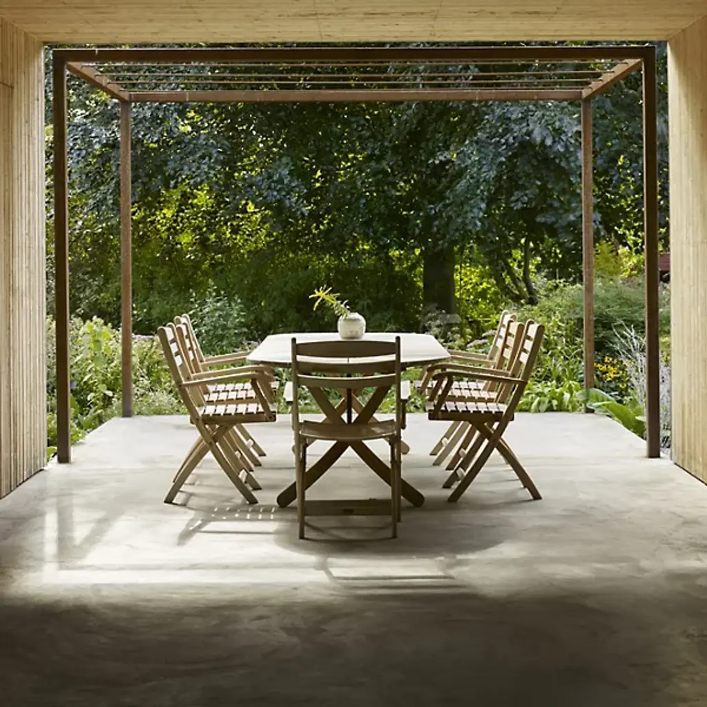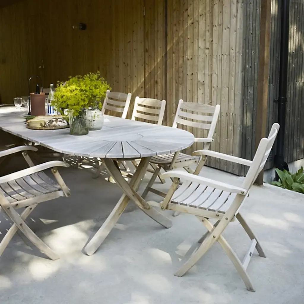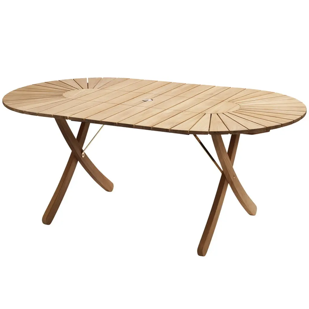The Selandia Outdoor Dining Table with Extension Plate from Fritz Hansen presents the airy sensation of a cool summer breeze, ascending from four upward-curving legs and setting an oval, slatted tabletop above. Created by Mogens Holmriis, a designer experienced in the ways of woodworking, it’s fashioned from FSC-certified teak wood set into a “Stadium” style oval, expressing a stately geometric style that can be expanded at will. The natural surface of the teak can repel weather and insects, developing a silver patina over time.