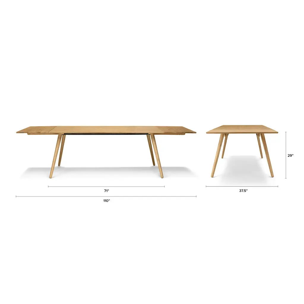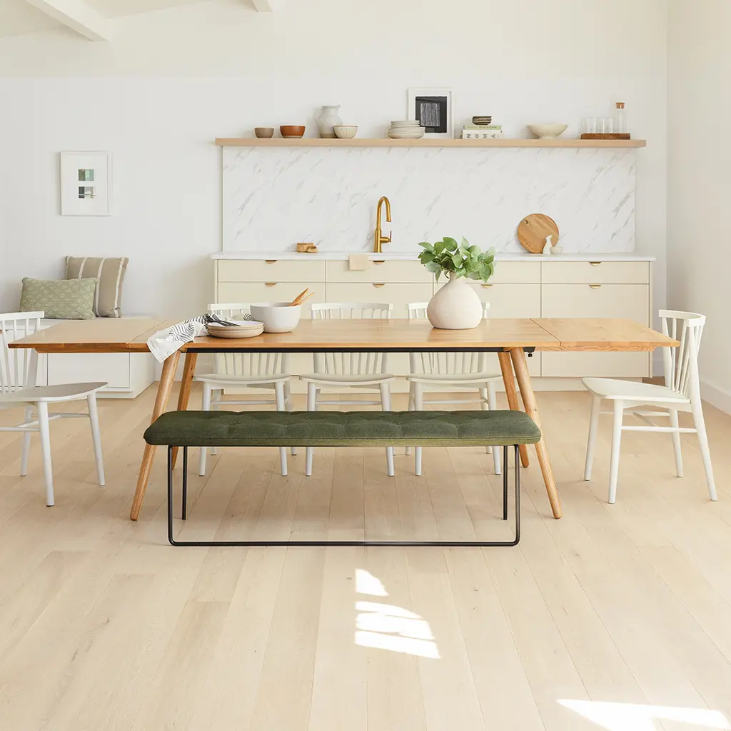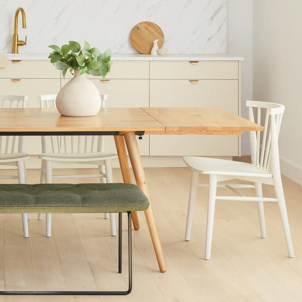 Feast your eyes on this extendable oak dining table. Whether you’re cooking for six or catering for twelve, everyone sits comfortably at the Seno oak dining table. Extendable rails are cleverly tucked beneath either end, making it easy to add or remove the solid wood leaves. When not in use, store leaves in a cool, dry place such as a closet or under your bed. Host a dinner, host a wine pairing, host a party: the Seno can take whatever guests you seat at it.